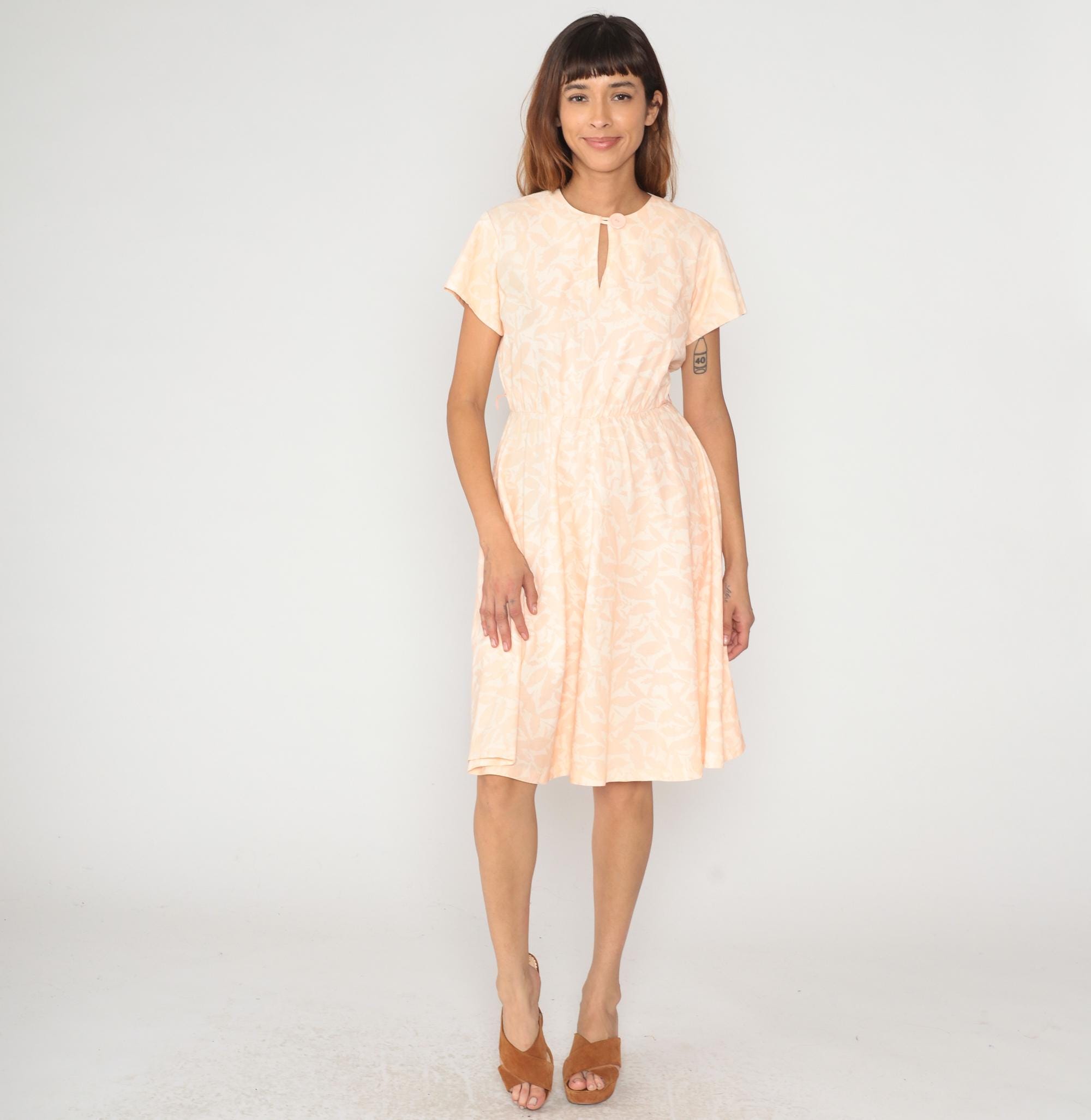 80s peach and white abstract print dress from Marti Petite with keyhole neckline and single button closure at front. Short sleeves, gathered elastic waist, knee-length skirt with all-over leafy pattern.
