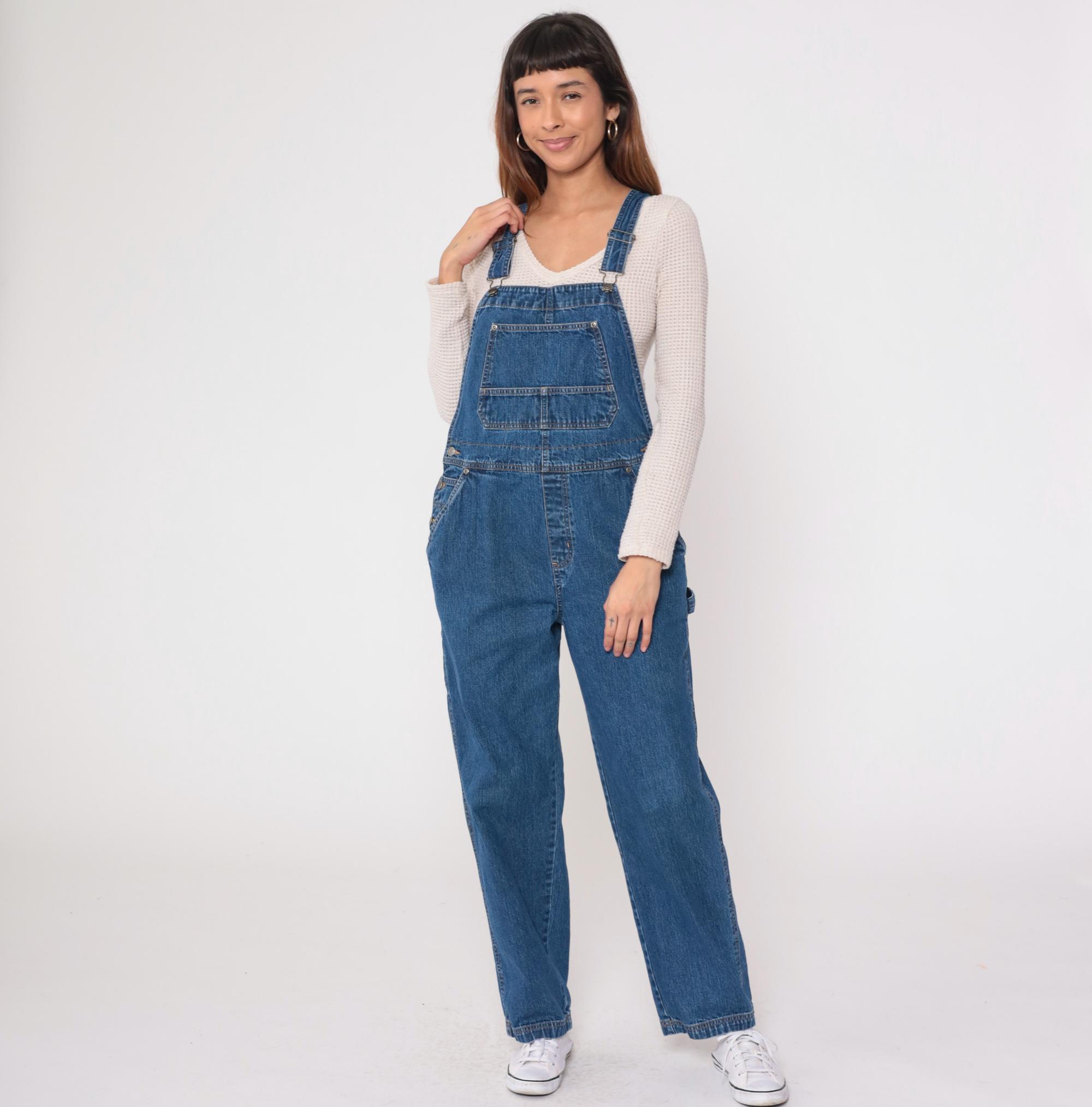 Y2K blue denim overalls from Cherokee with adjustable straps and metal hardware closures. Front chest pocket, side seam pockets, and back pockets. Straight leg pants with full-length inseam.