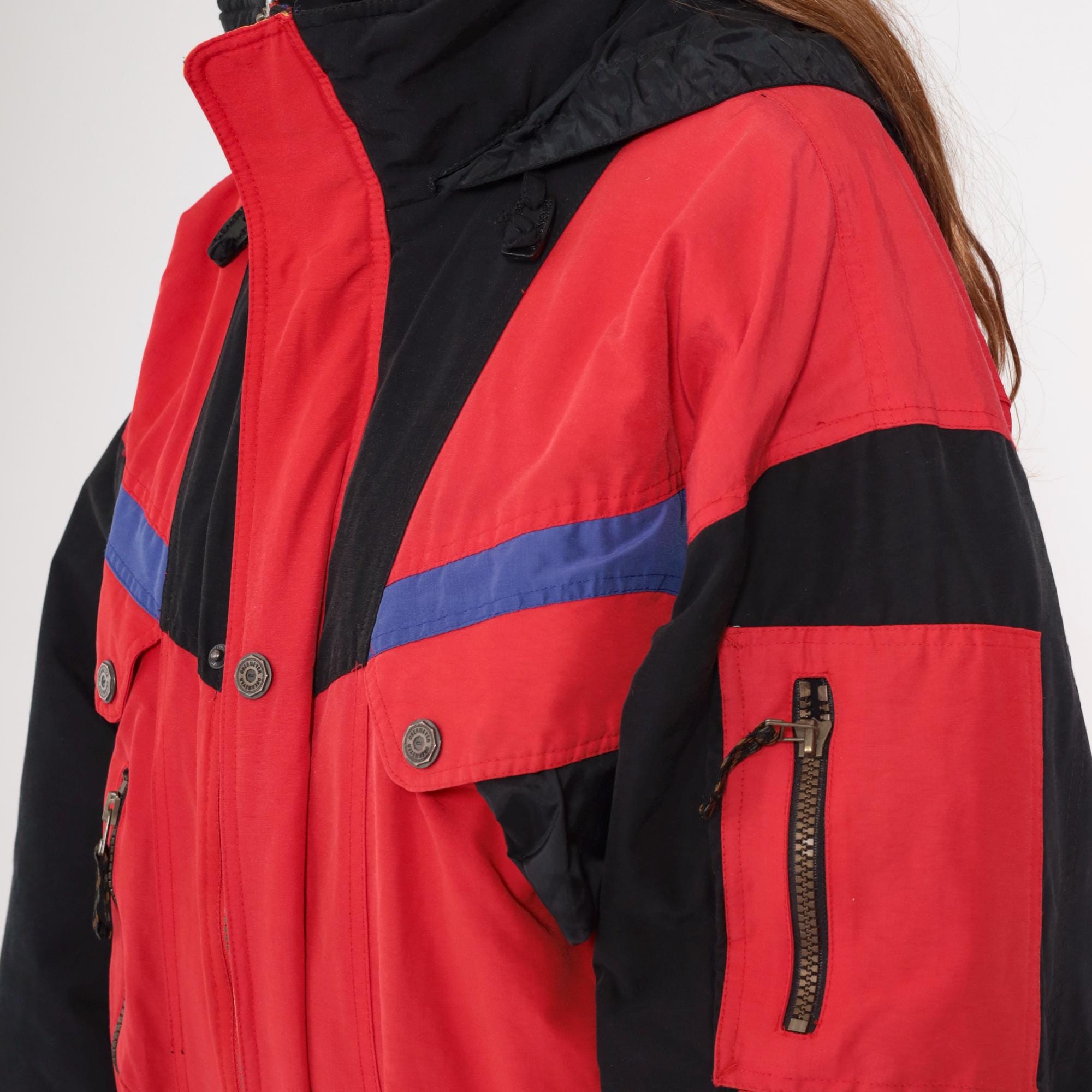80s red and black one-piece ski suit from Obermeyer with color blocking design and blue accent stripes across shoulders. Hooded with drawstring closure, front zipper, chest pockets, and sleeve pocket. Adjustable waist belt with buckle closure, suspender straps.