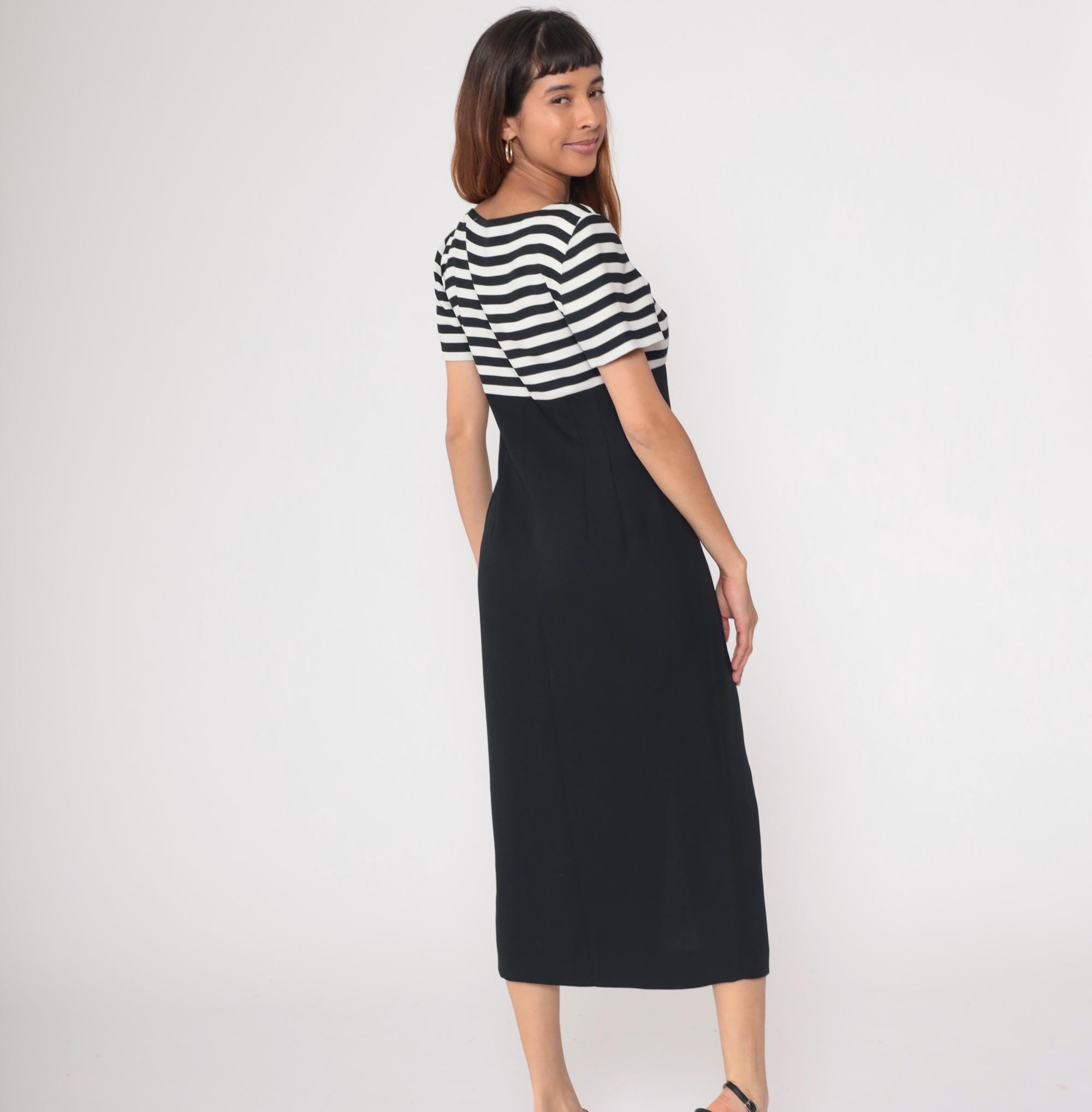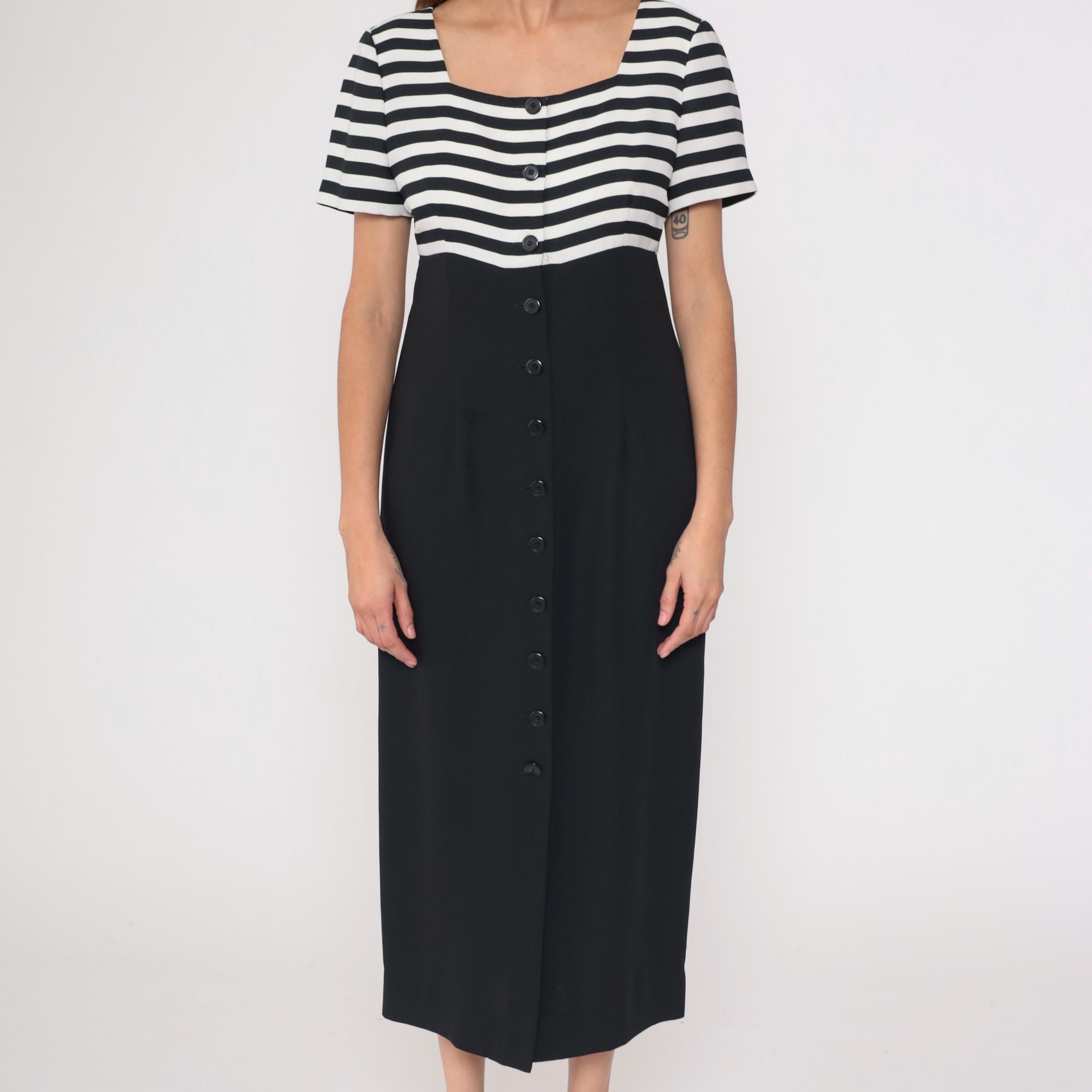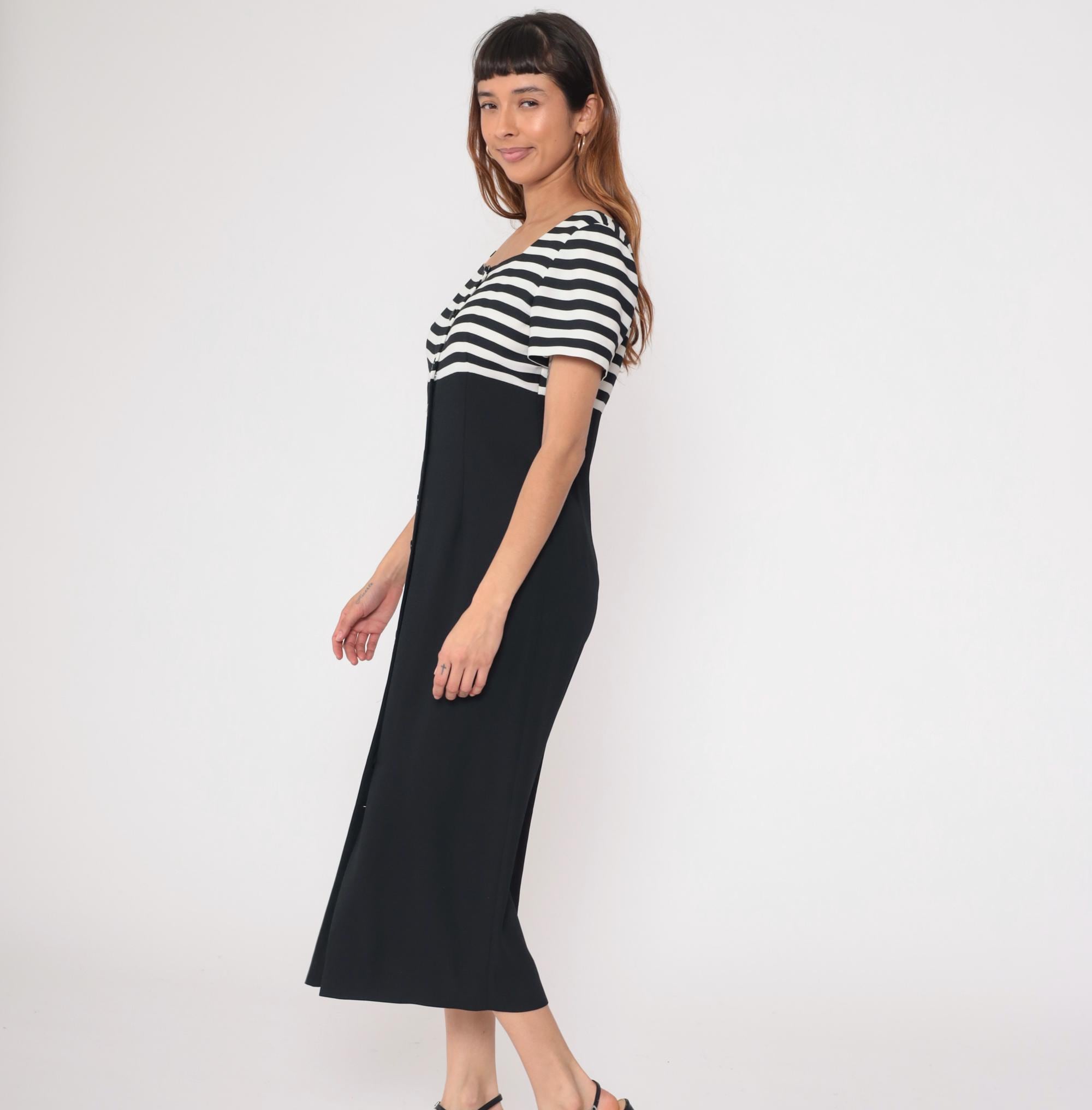90s black and white striped midi dress from Liz Claiborne with horizontal stripes across bodice and solid black skirt. Button front closure with short sleeves and scoop neckline.