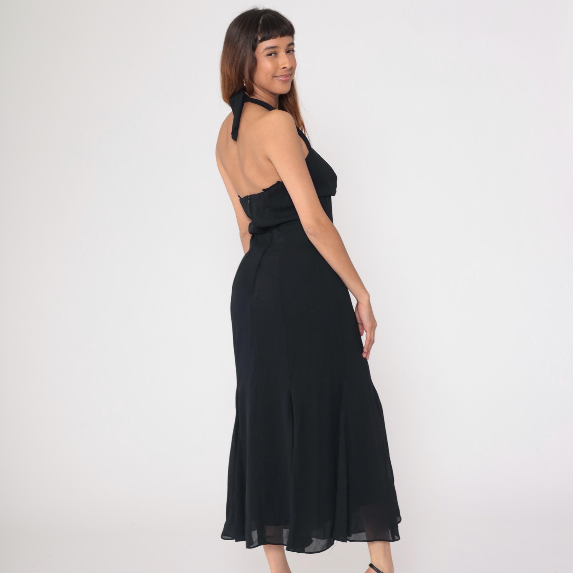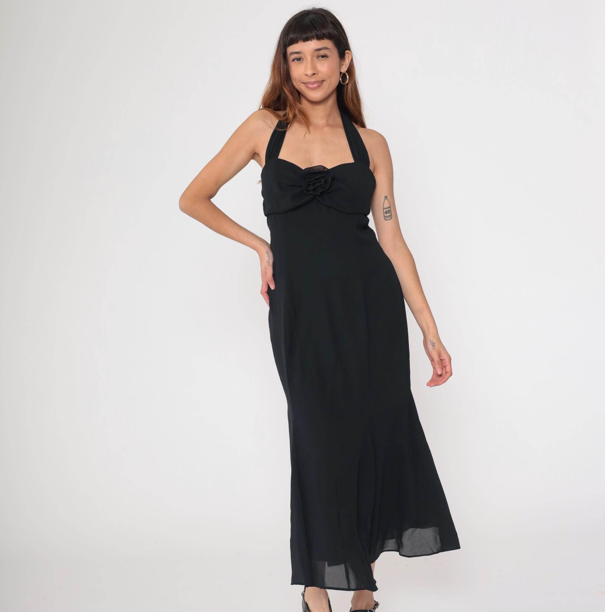 90s black halter maxi dress from gunne sax jessica mcclintock with strap that ties at the neck and sweetheart neckline featuring a decorative fabric rose at the center bust. Empire waist with A-line maxi skirt.