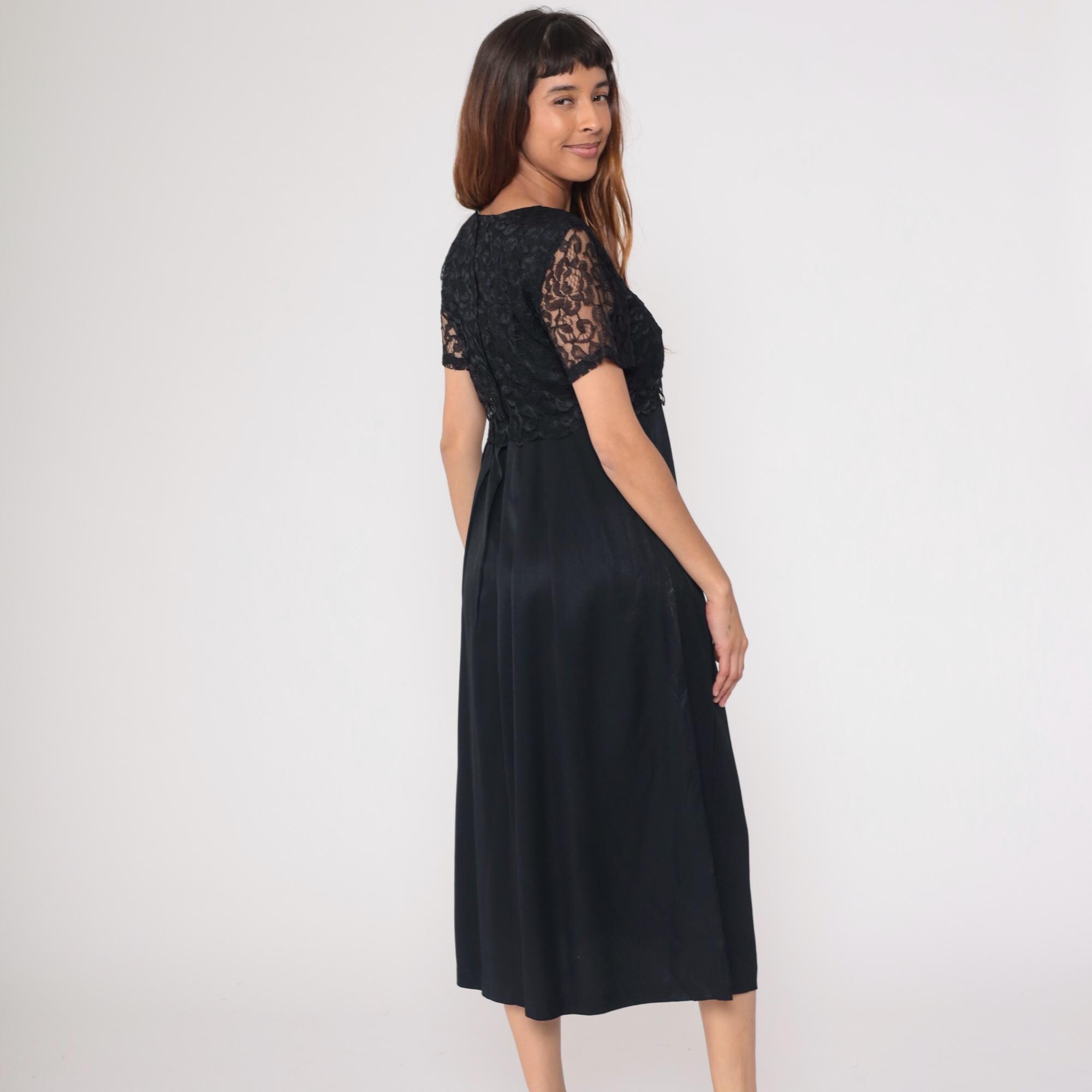 90s black midi dress with floral lace bodice and short lace sleeves over a solid black skirt. Empire waist with bow detail at the seam, round neckline, back zipper closure.