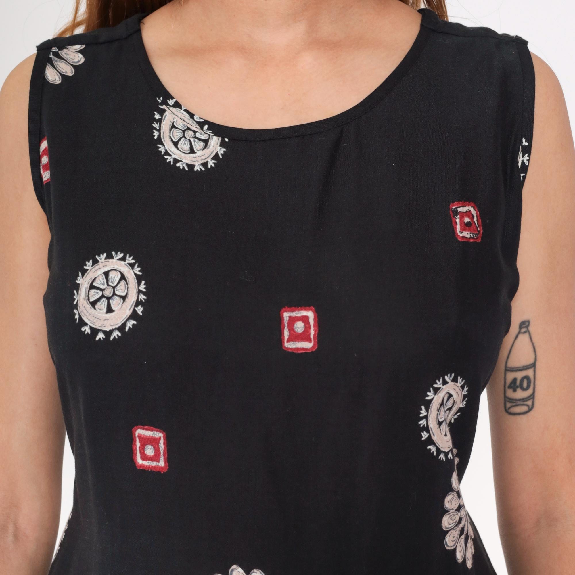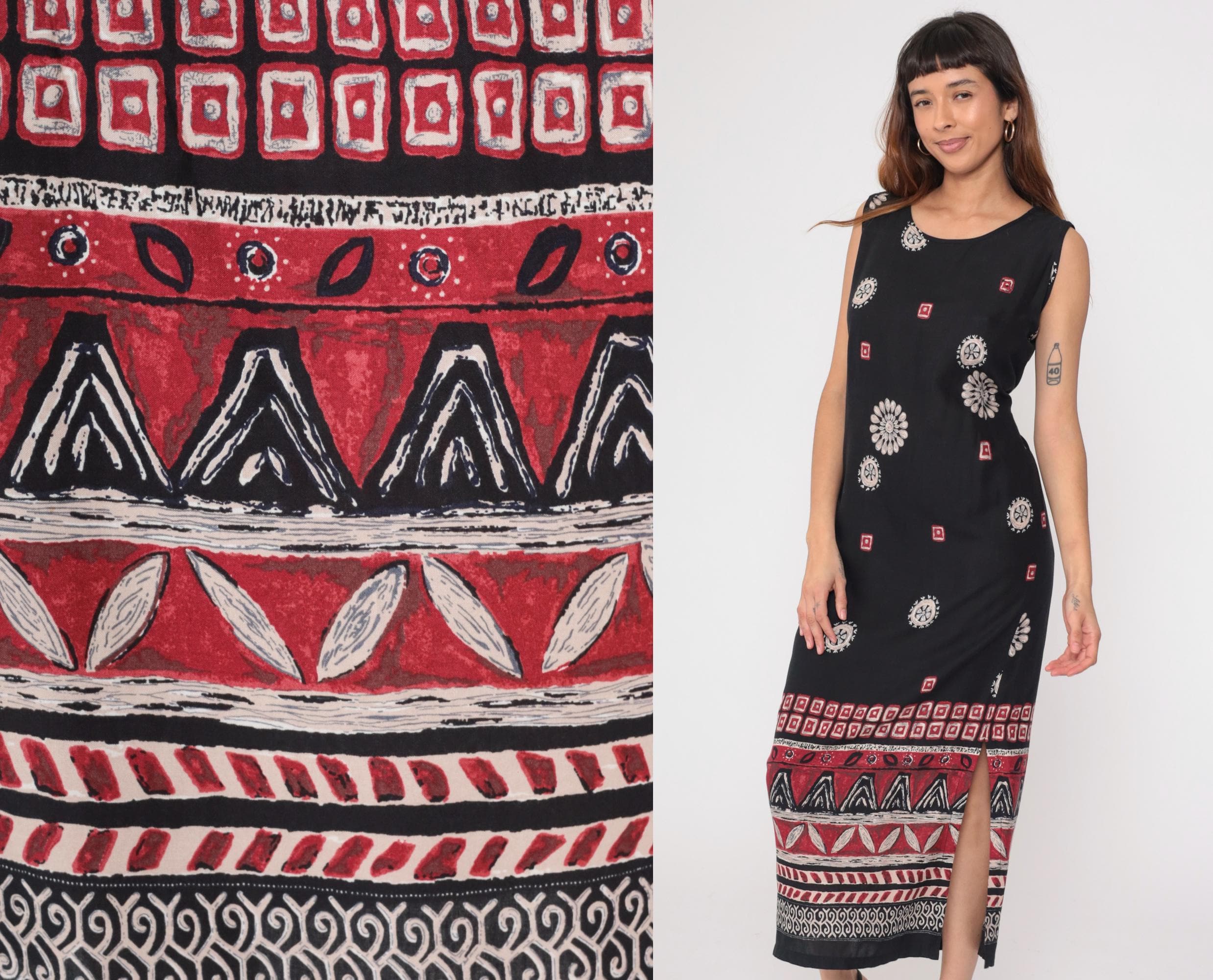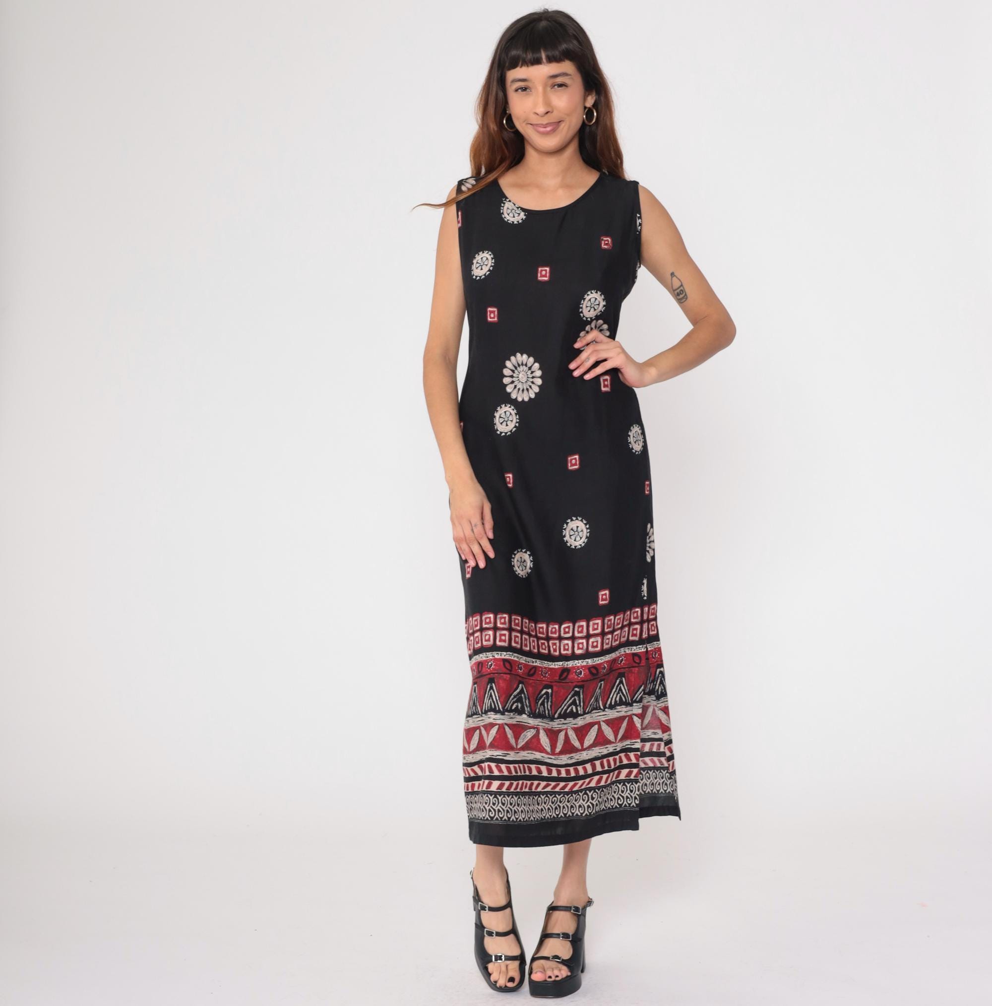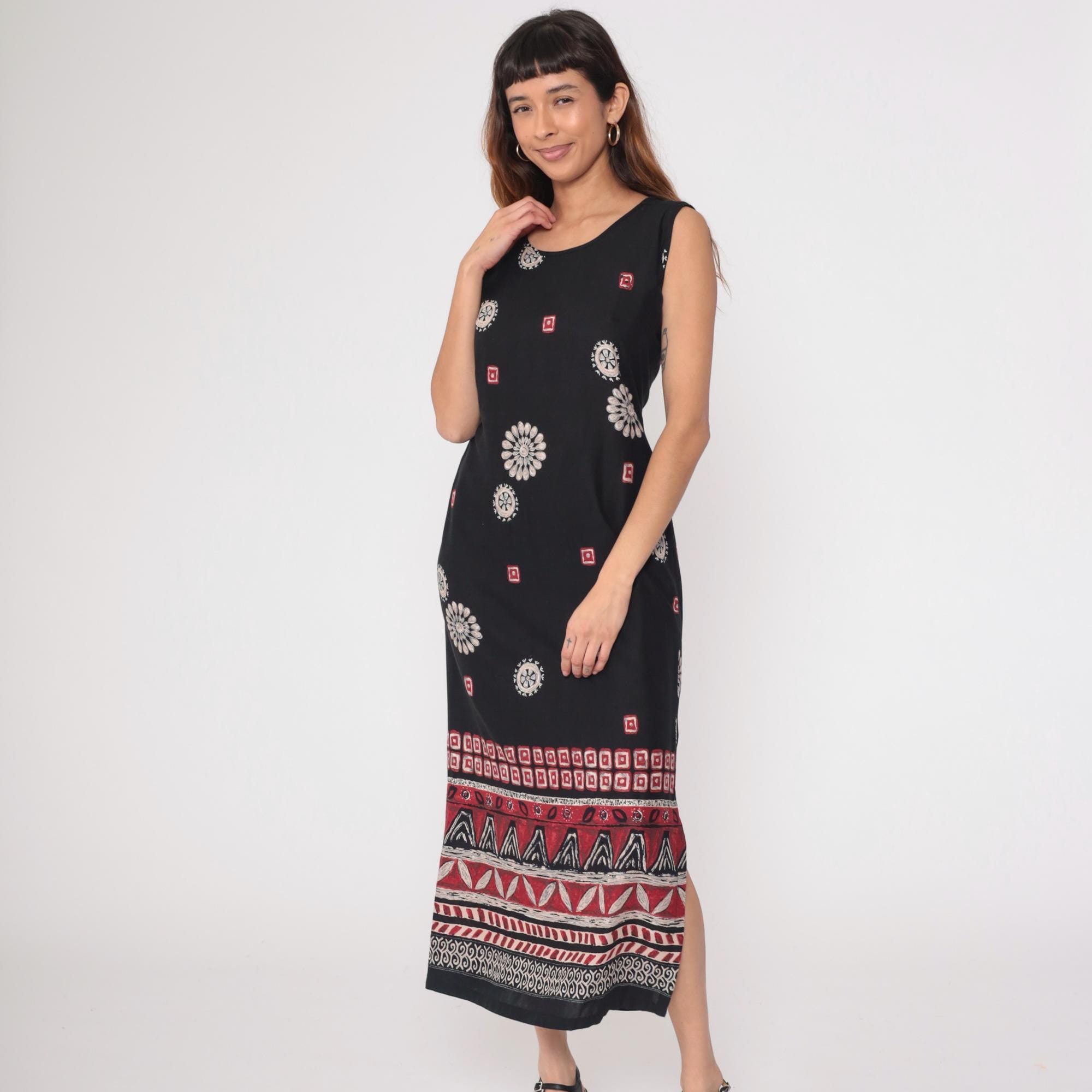 90s black maxi dress from California Krush with psychedelic geometric border print at hem. White circular medallion motifs and small red diamond shapes scattered across black upper portion, bands of red and burgundy geometric patterns including triangles, leaf shapes, and zigzags at hem border. Sleeveless with scoop neckline and self-tie belt at back waist.