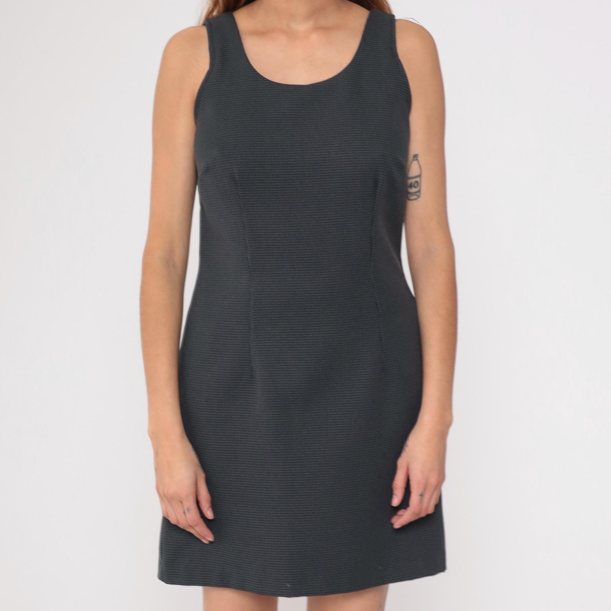 90s black and gray houndstooth shift dress with scoop neckline and sleeveless construction. Textured polyester fabric in small houndstooth check pattern throughout.