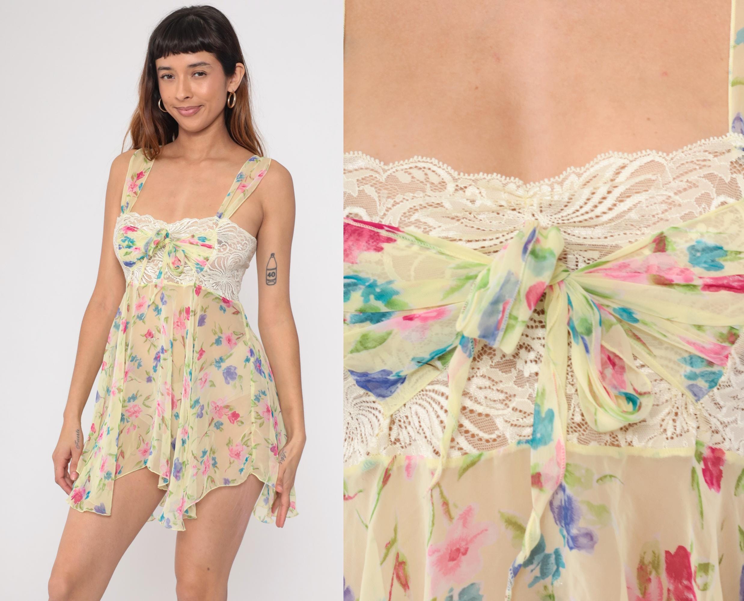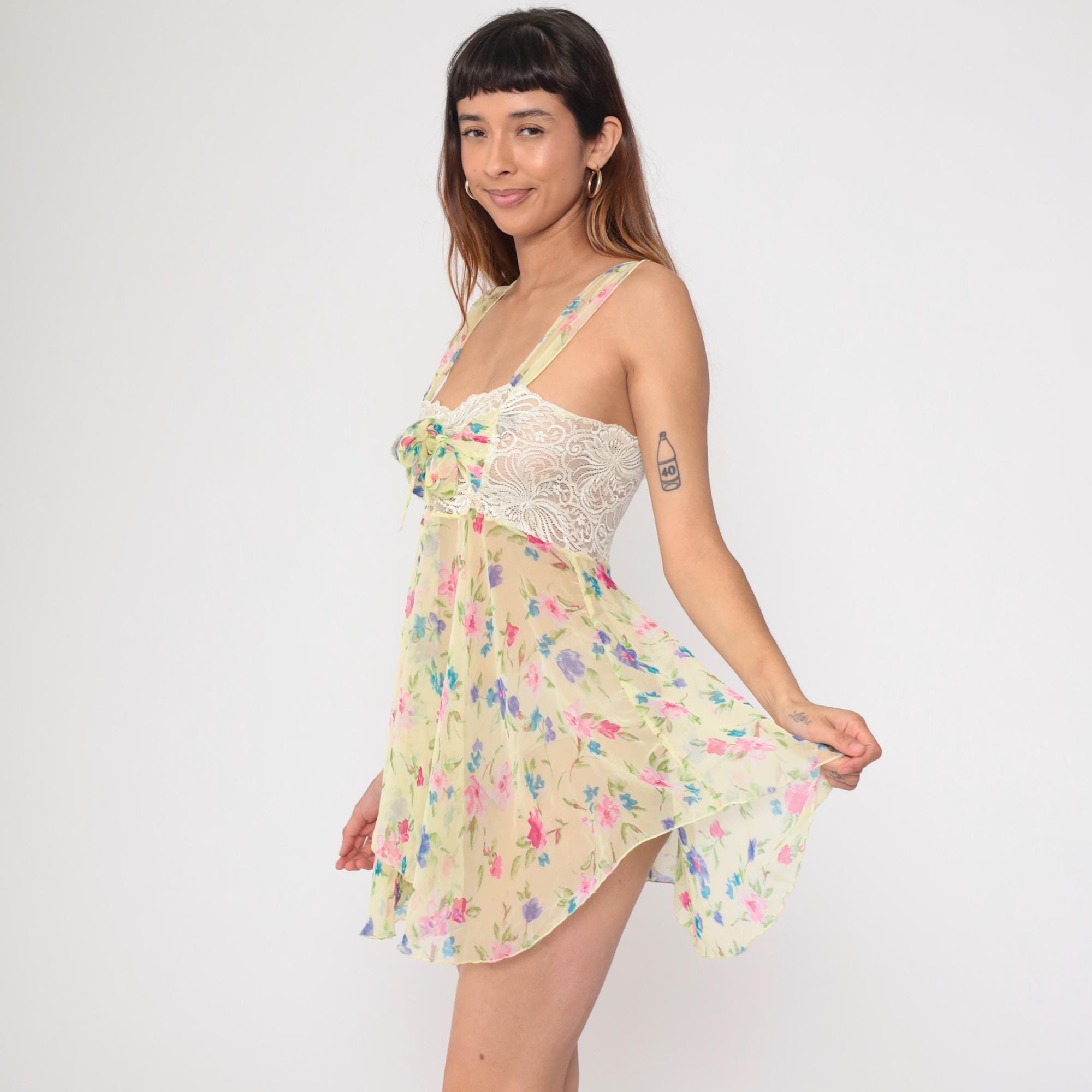 Pale yellow babydoll dress with watercolor floral print in pink, blue, and purple. Cream lace band across bust with scalloped trim, fabric bow at center front, empire waist with gathered skirt. Spaghetti straps in matching floral print, asymmetrical handkerchief hem.