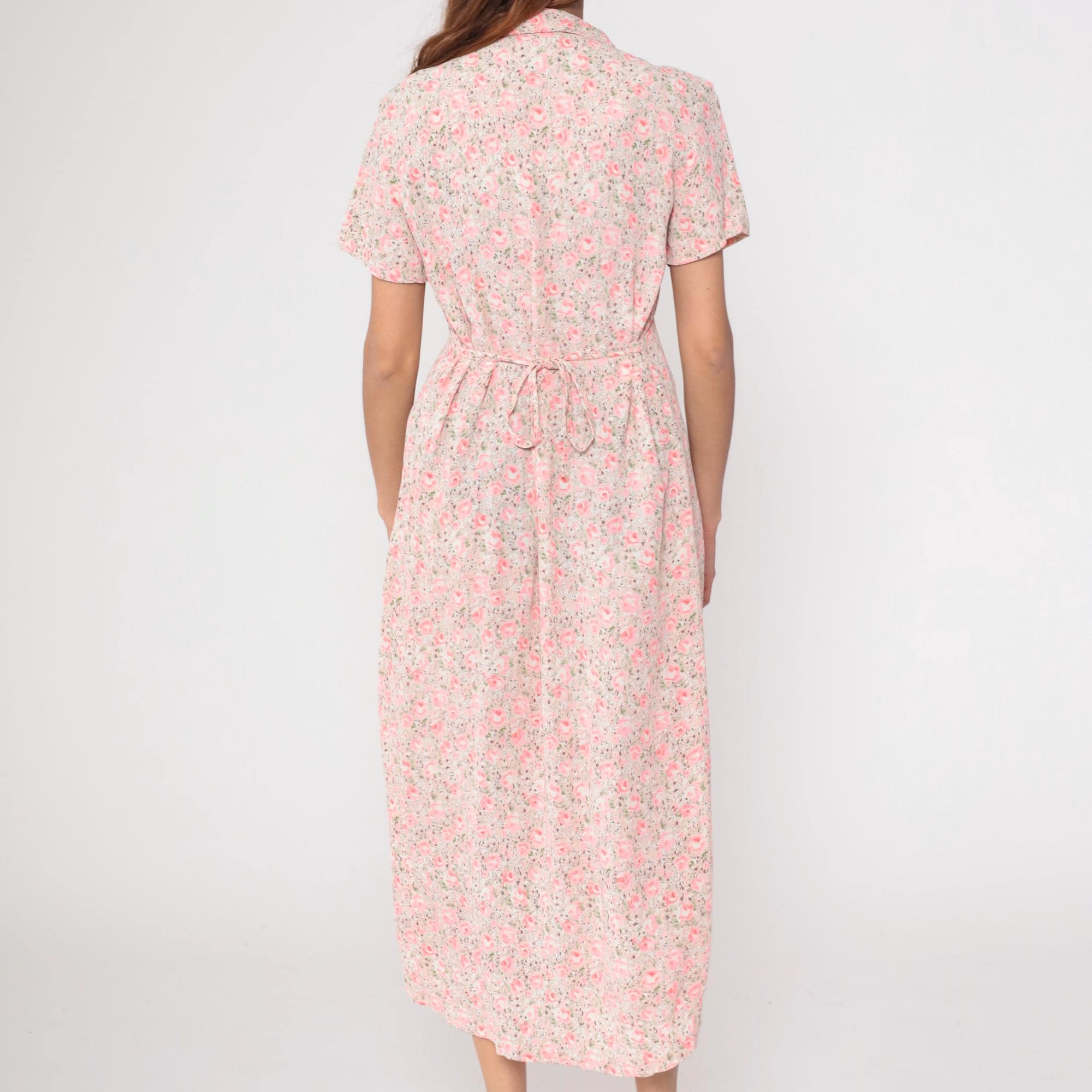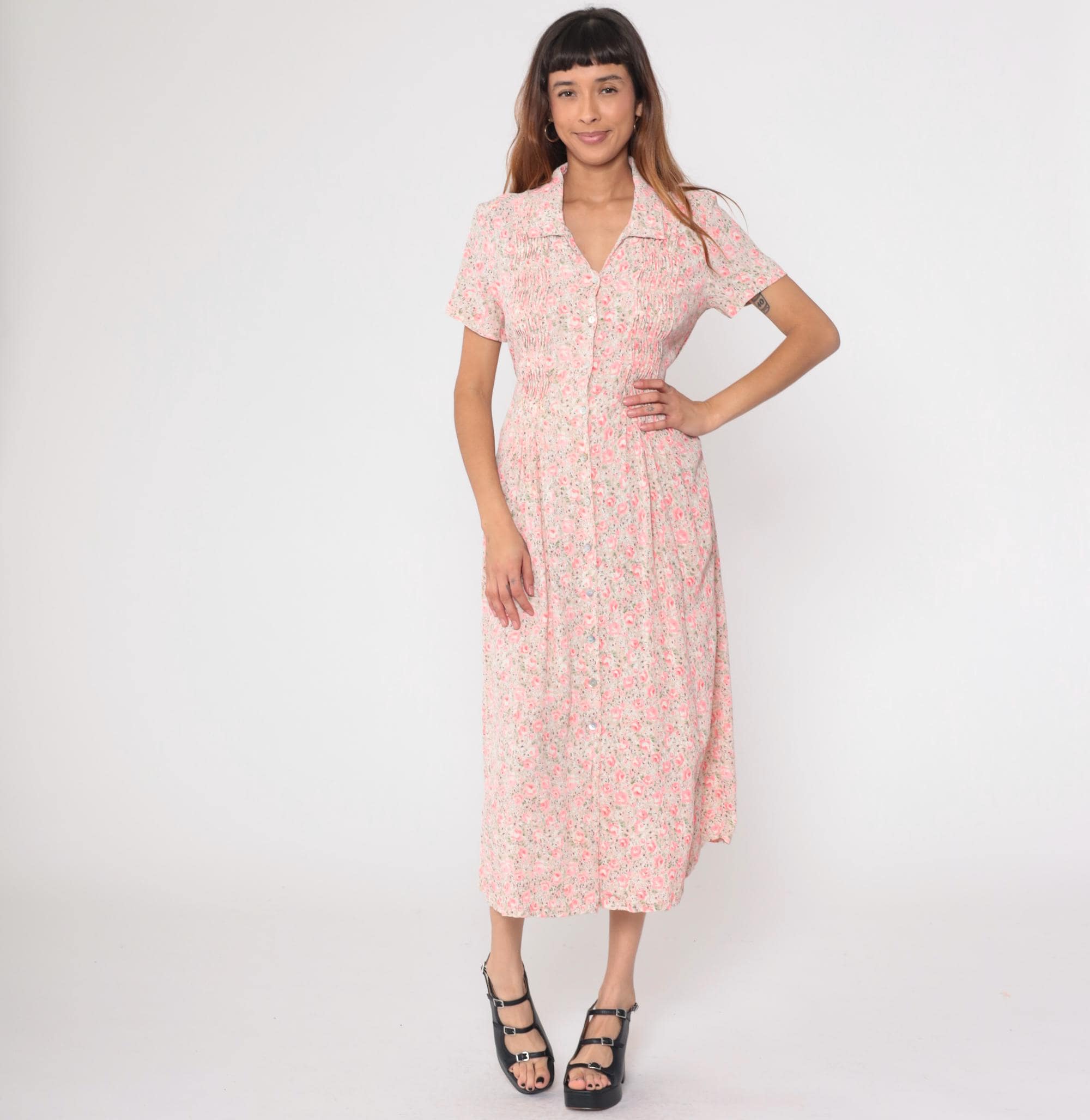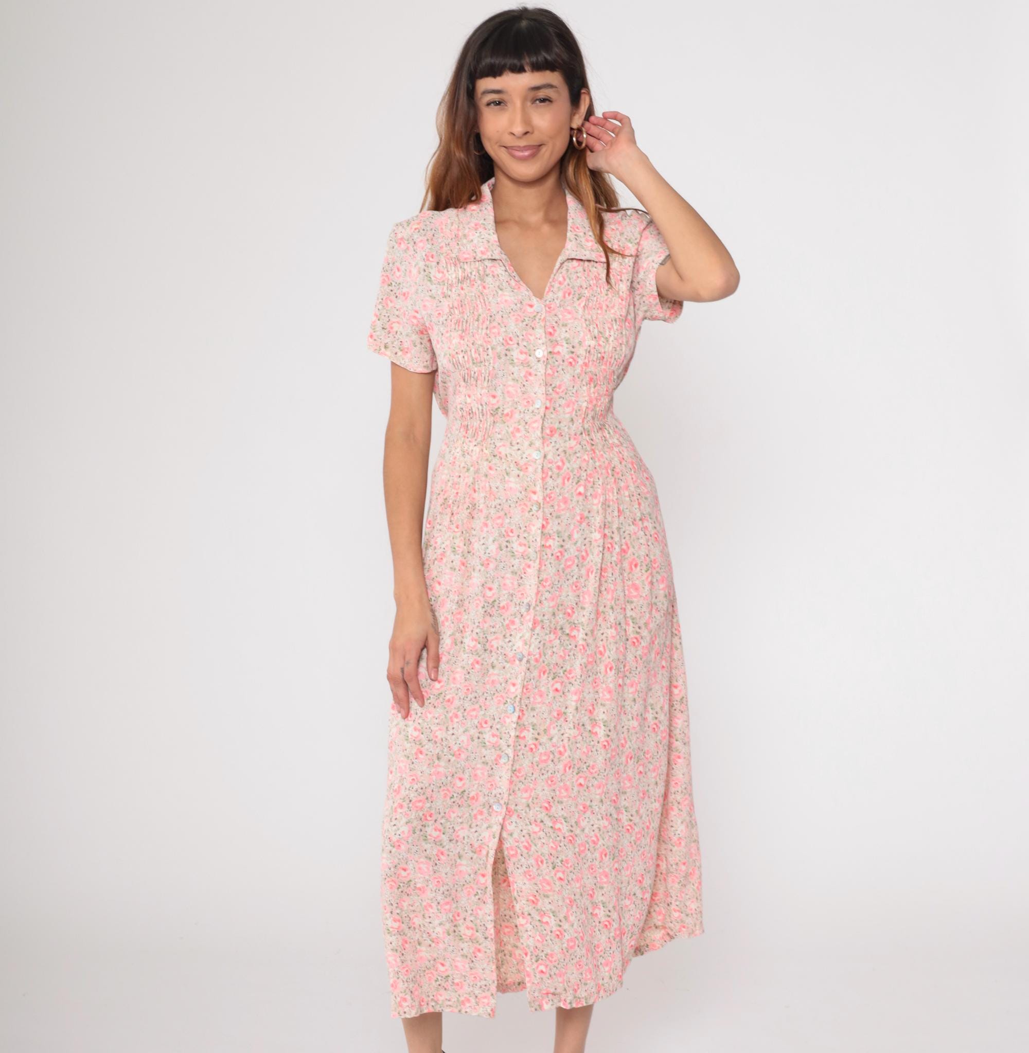 90s pink floral midi dress with white background and rose pattern throughout. Collared neckline with button front closure, short sleeves, gathered waist with smocked detail creating fitted definition.