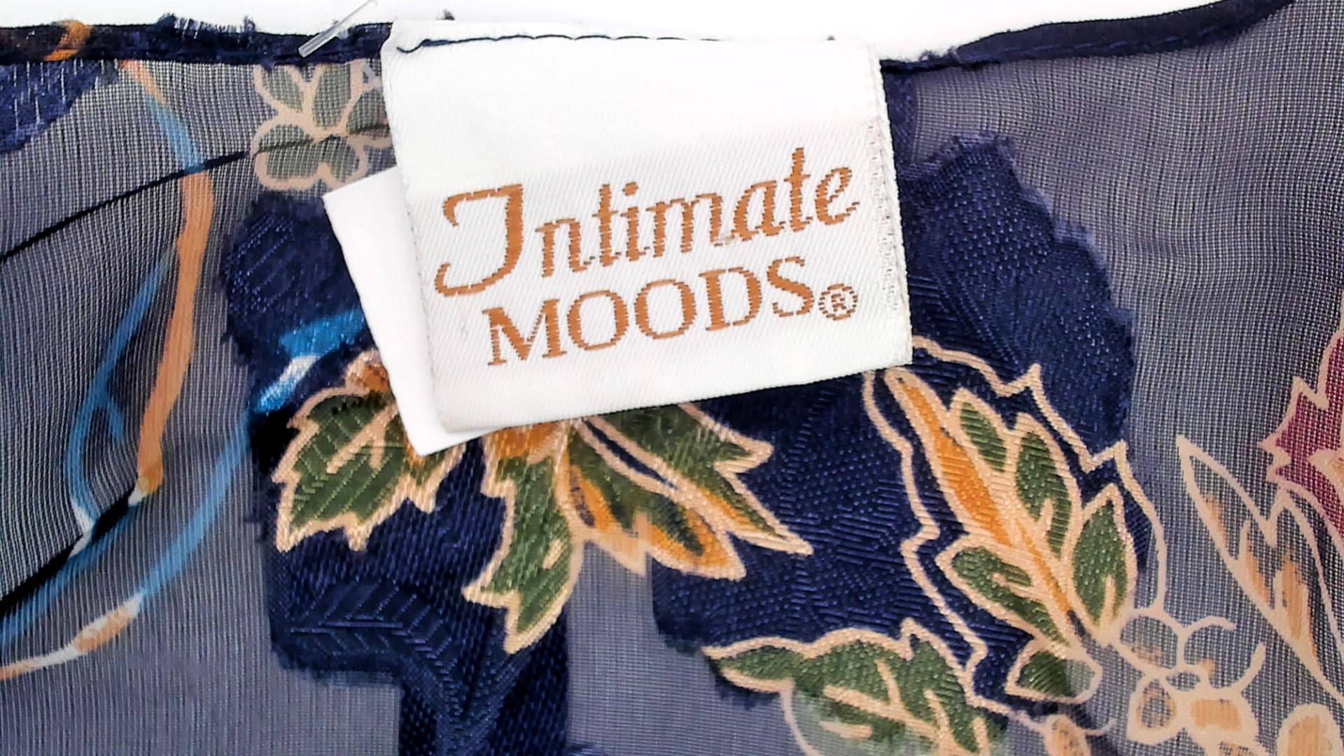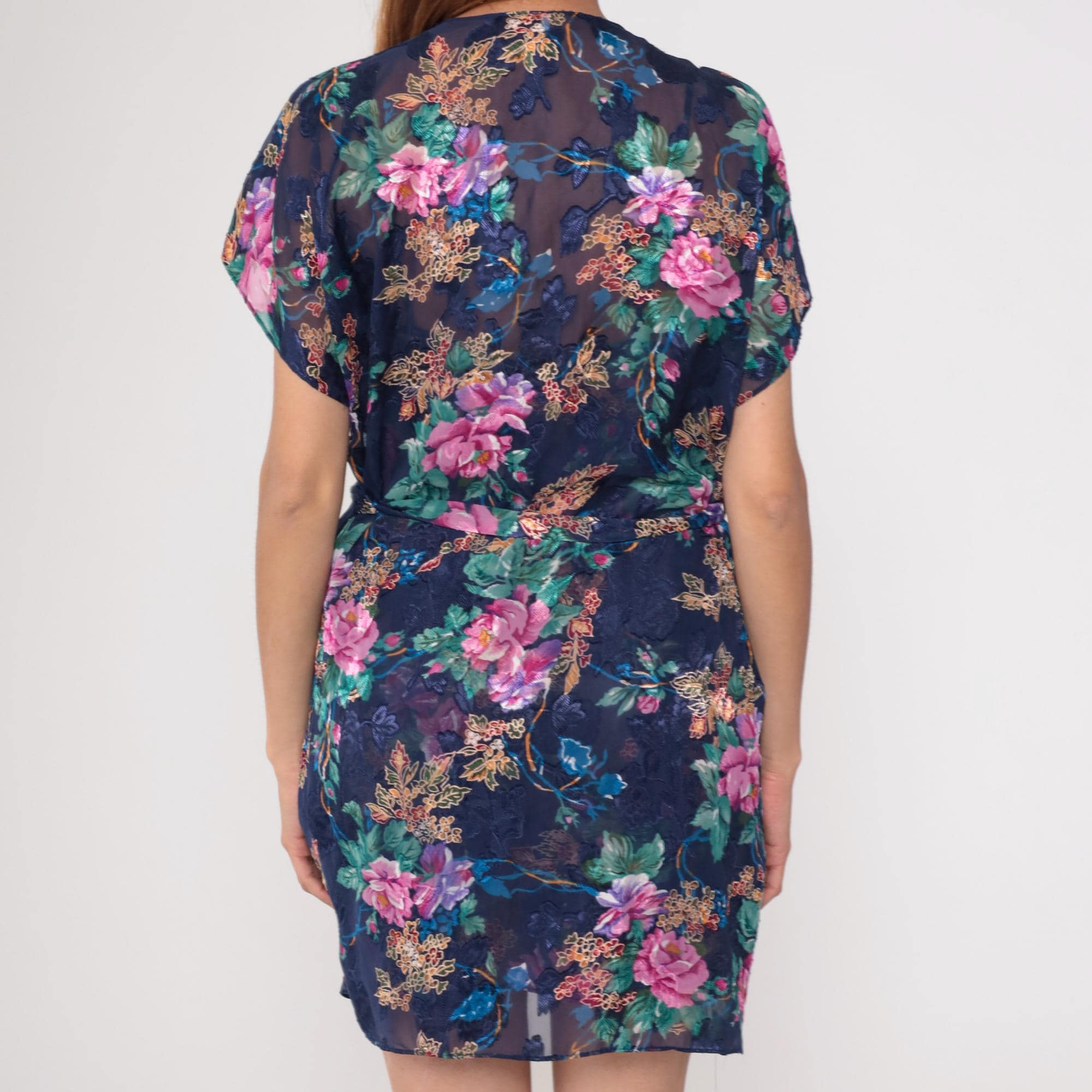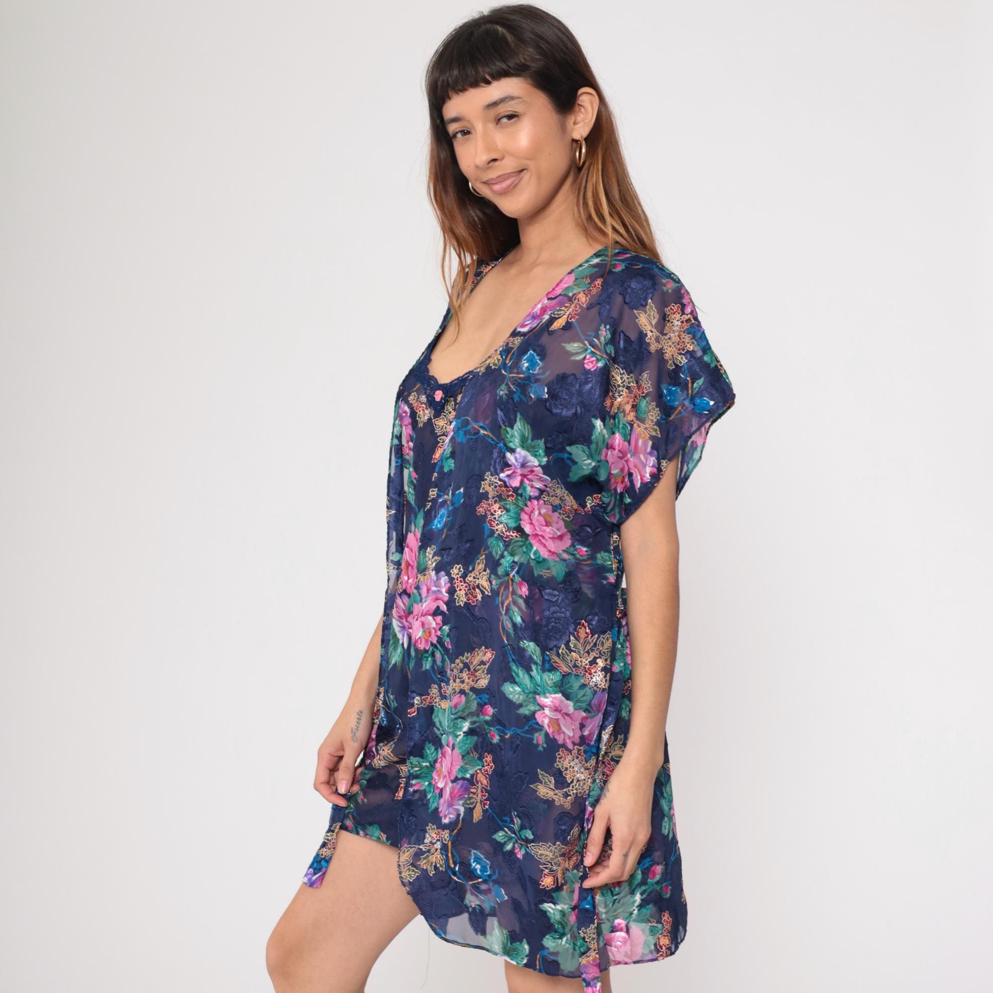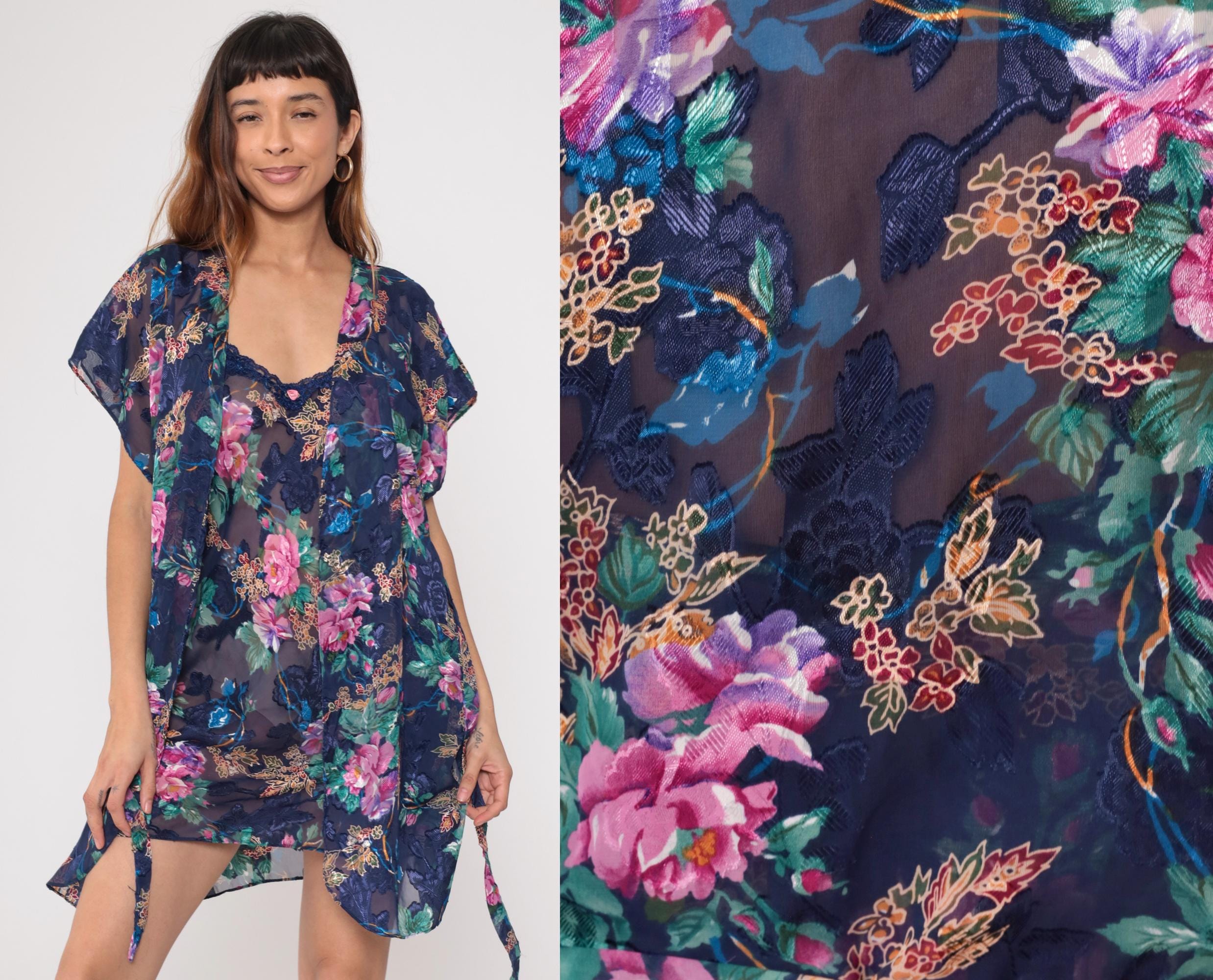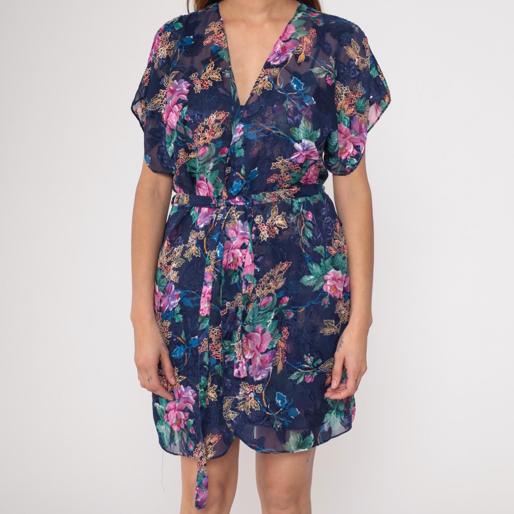 90s navy blue floral lingerie robe with pink, purple, blue, and green flowers across semi-sheer fabric. V-neck wrap front with short kimono-style sleeves and tie belt at waist. The matching dress worn by the model underneath is sold separately; this listing is for the robe only.