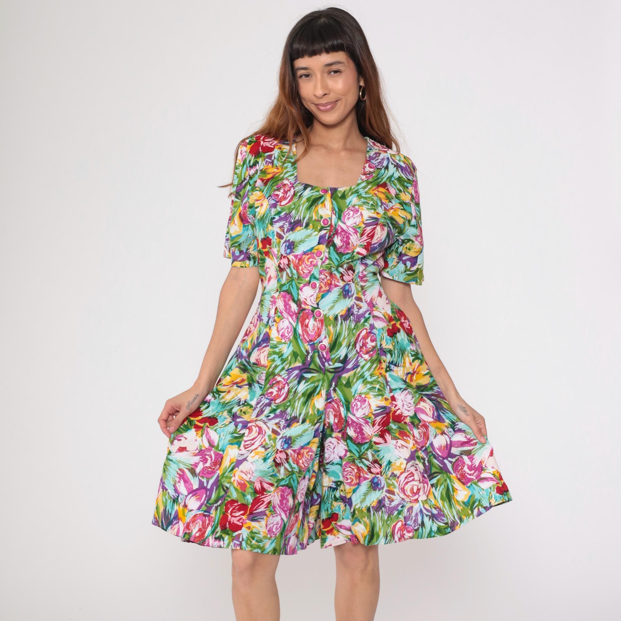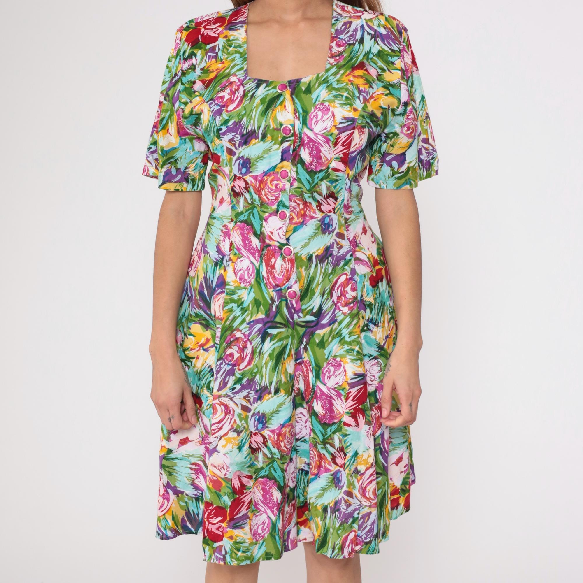 90s multicolor floral dress with painterly print in pink, purple, red, yellow, and green. Button front closure with round magenta buttons, short sleeves, fitted bodice with drop waist featuring gathered detail. Full gathered skirt with tiered construction.