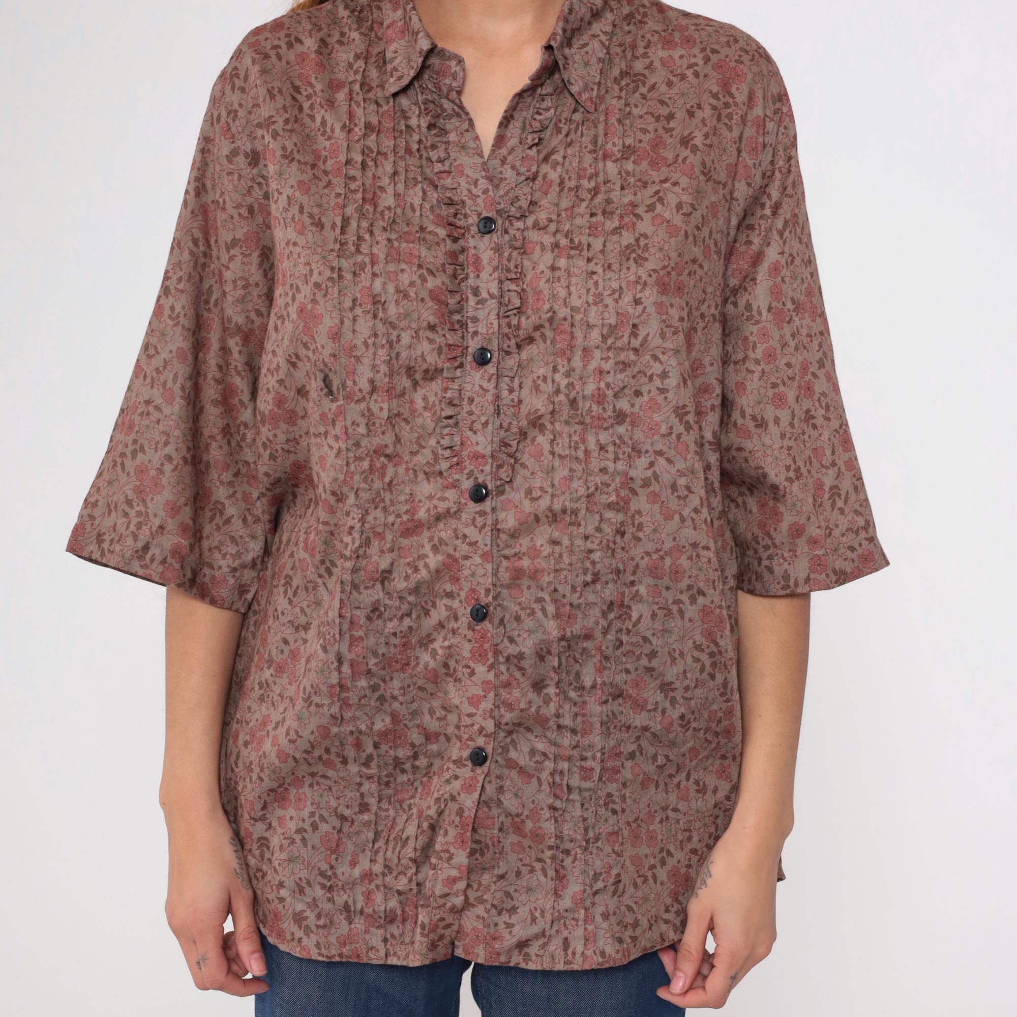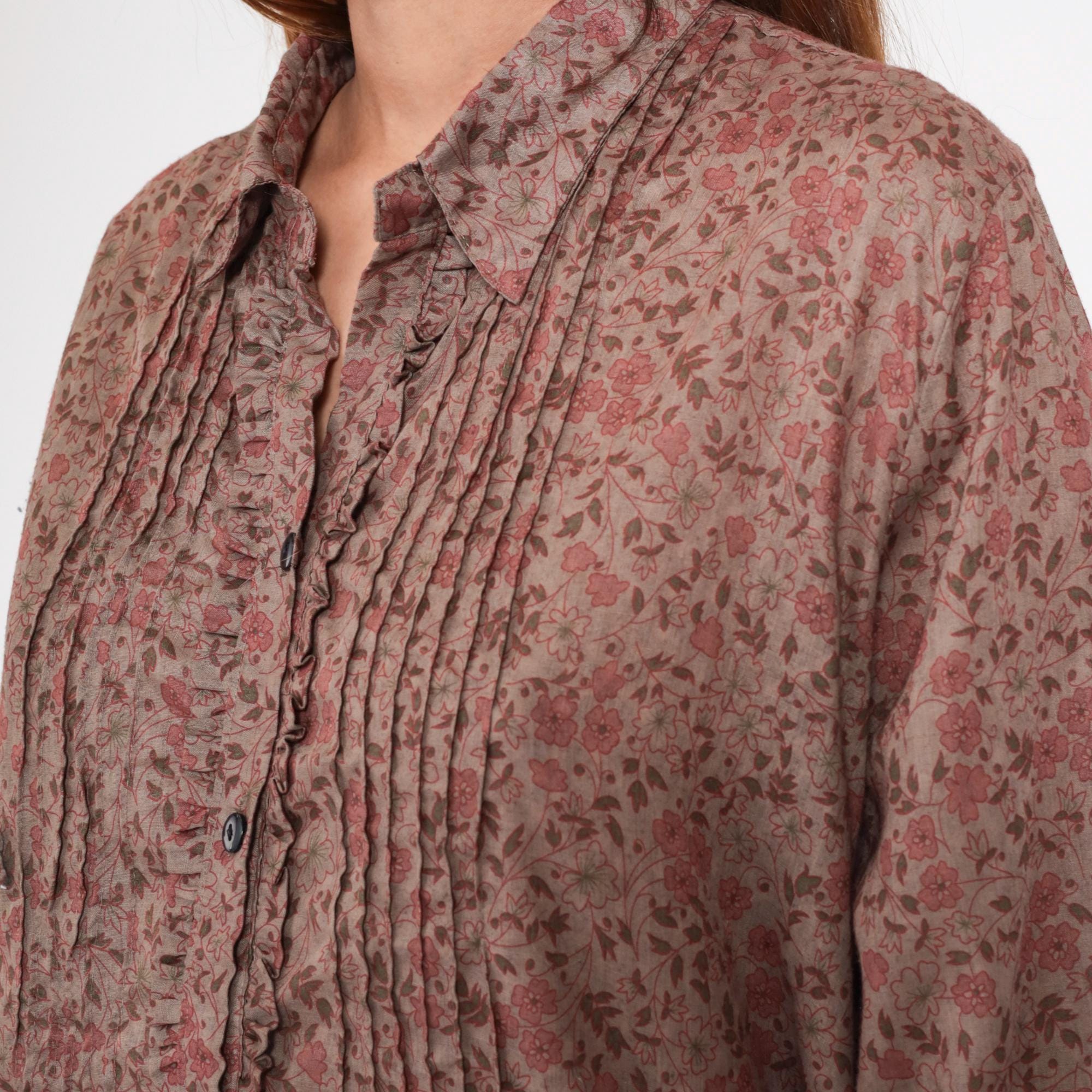 Y2K floral button-up shirt from sheryll ellein with small-scale floral print in pink, beige, brown, and taupe. Pintuck pleating frames the button front on both sides, point collar, three-quarter sleeves.