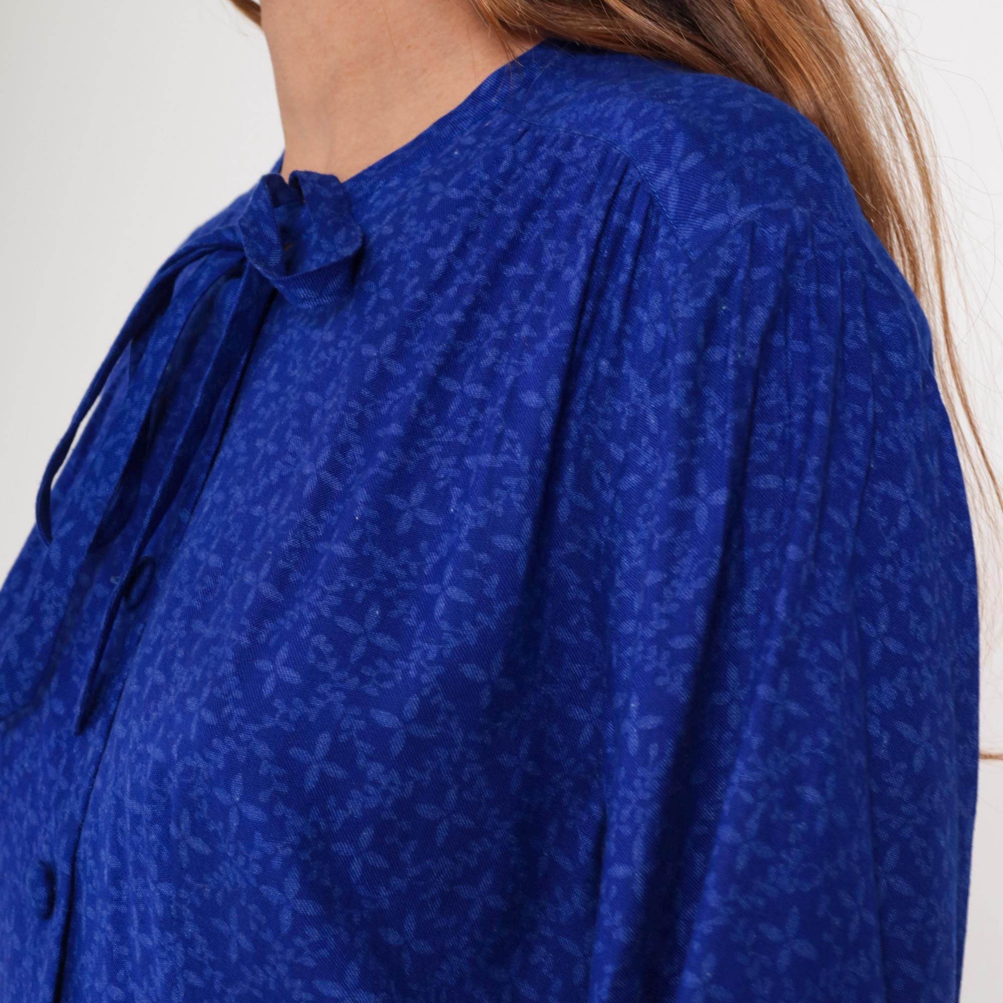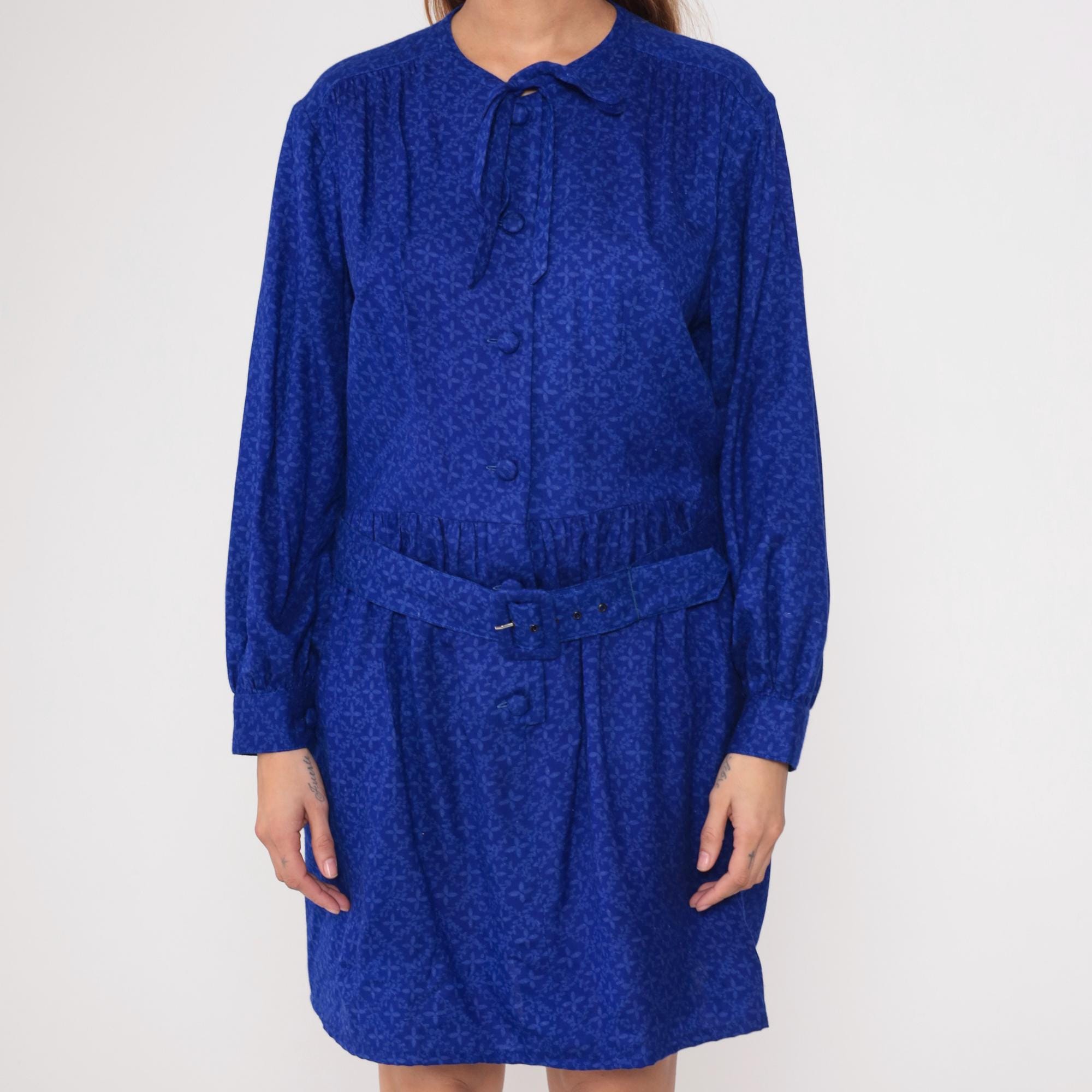 Royal blue long-sleeve dress from the 1980s with tone-on-tone textured pattern throughout. Collar with tie detail, full button front, long sleeves with button cuffs, gathered waist with matching belt and buckle closure.