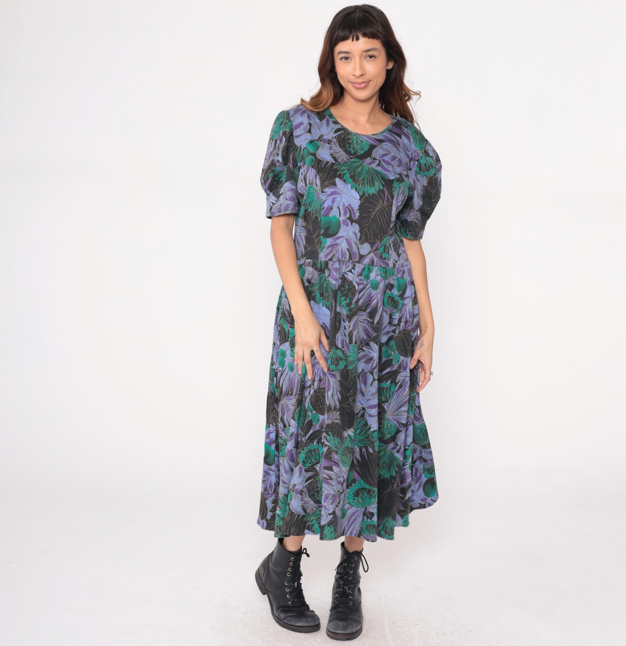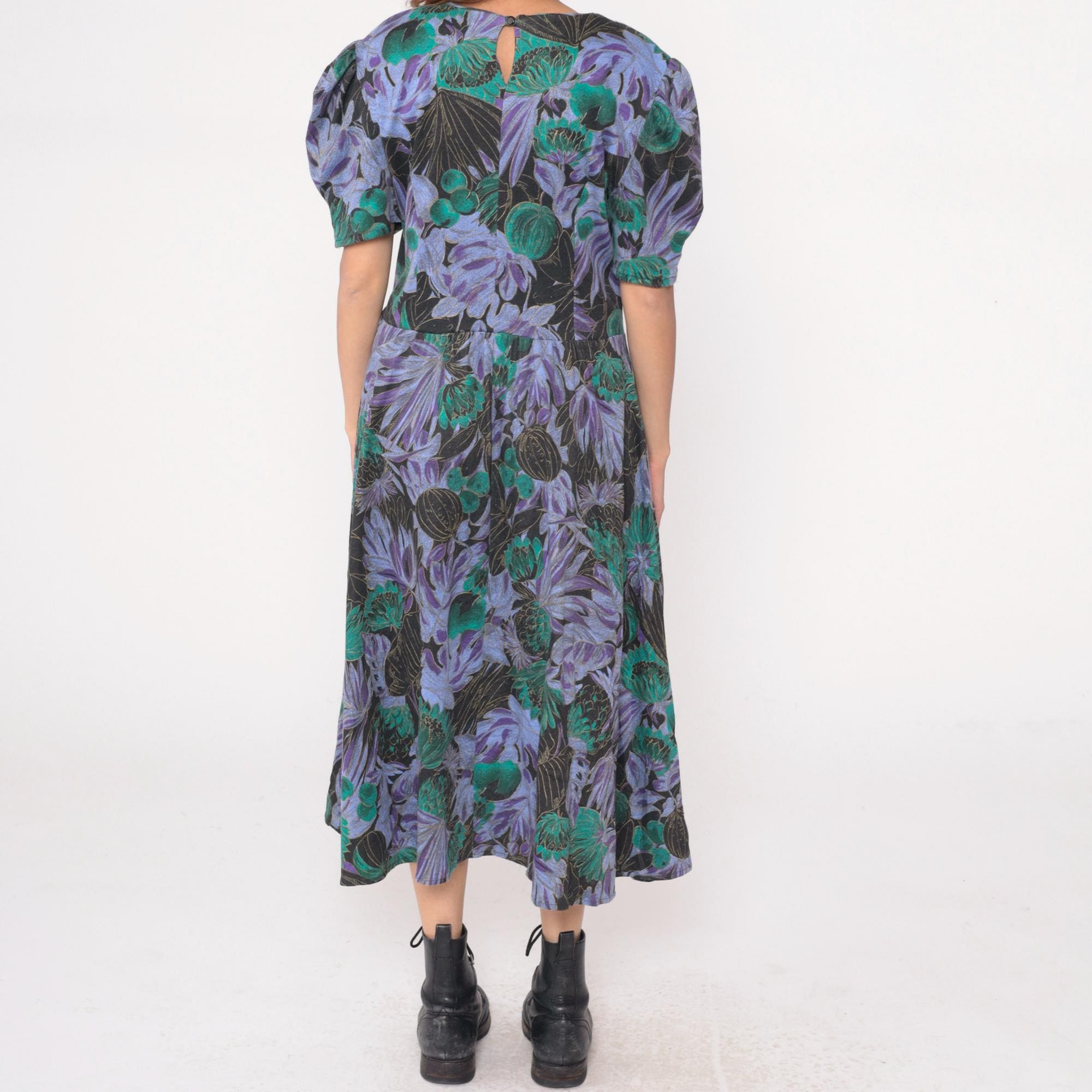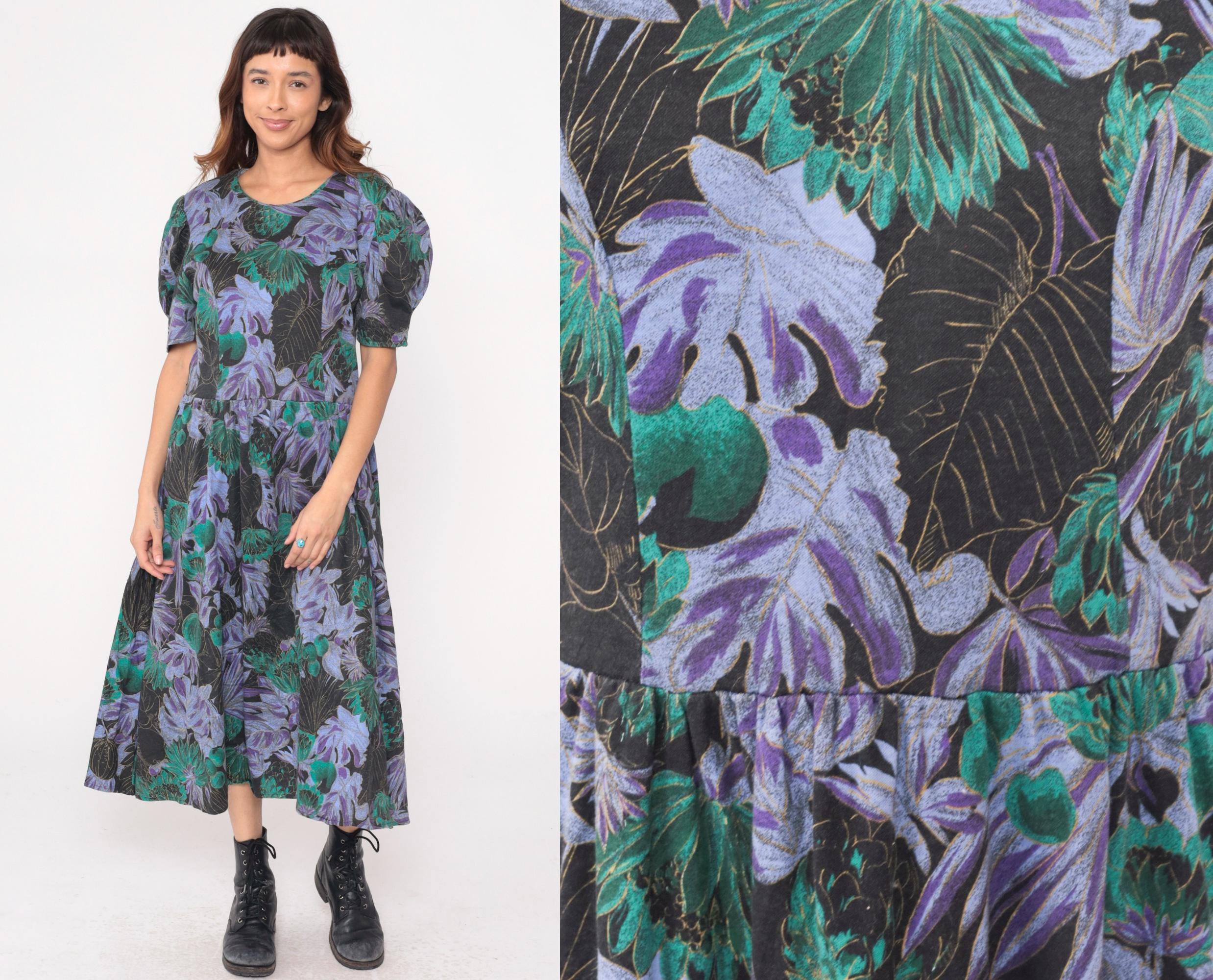 90s black floral maxi dress from scandels with purple and green tropical blooms across the fabric. Short puff sleeves with gathered elastic cuffs, round scoop neckline, fitted bodice with dropped waist seam.