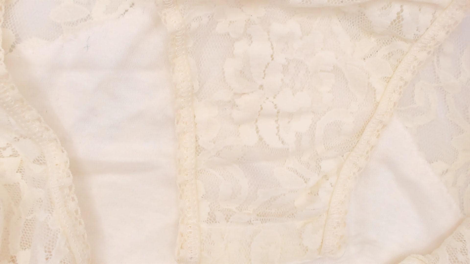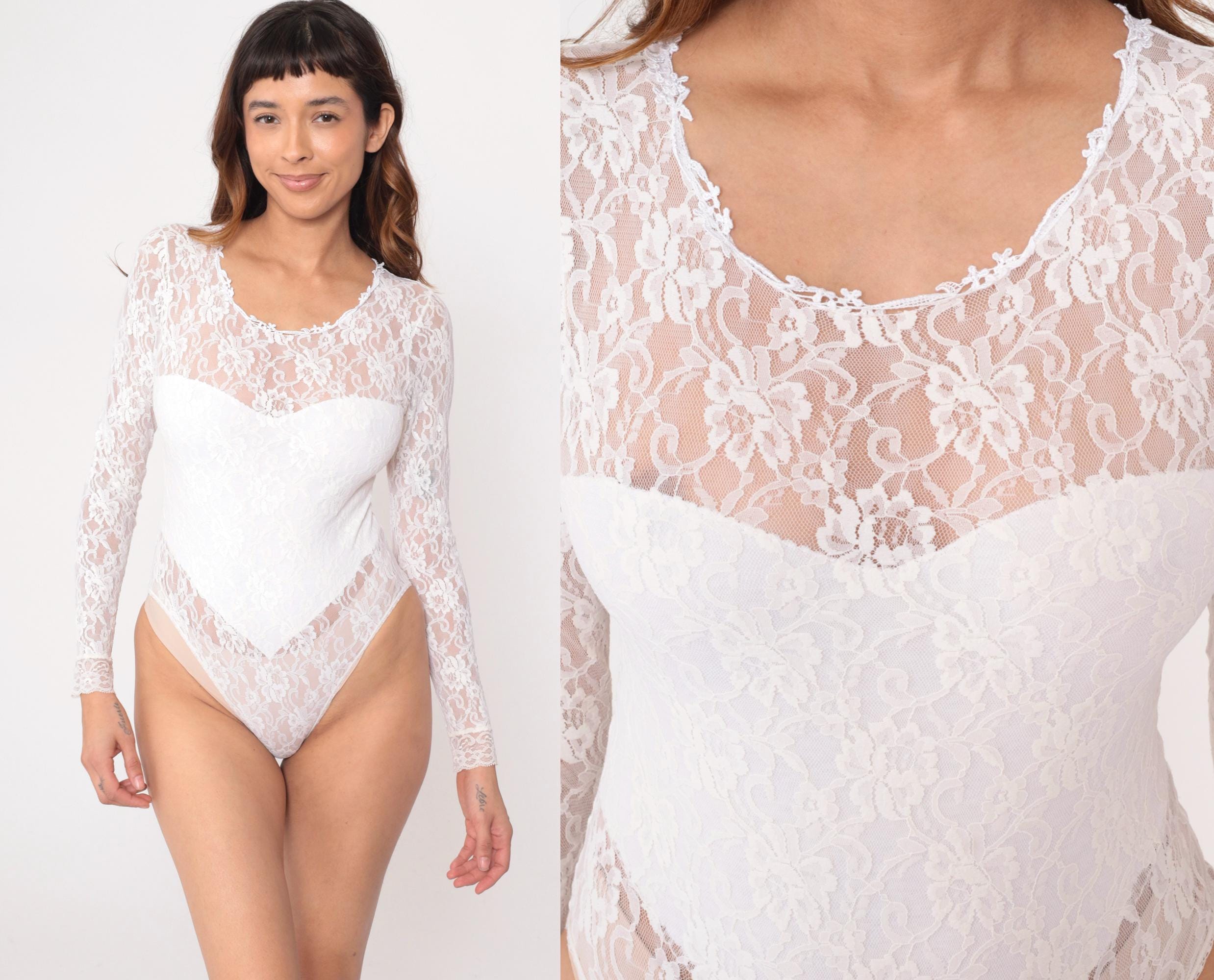 80s white lace bodysuit from hanky panky with all-over floral lace pattern and sheer construction. Scoop neckline with scalloped lace trim, long sleeves, opaque lining panel at center bodice and torso, high cut leg openings with snap closure at crotch.