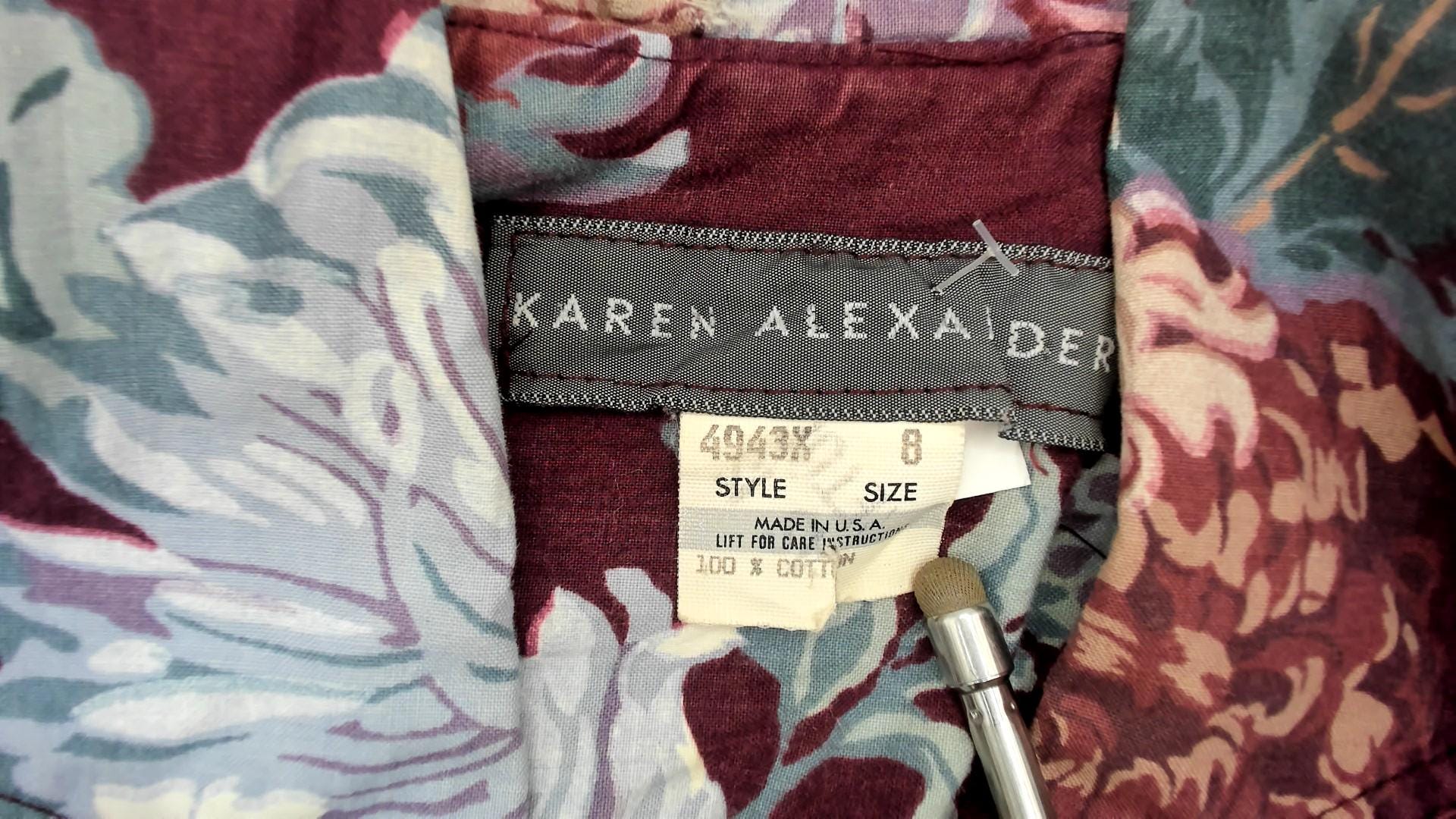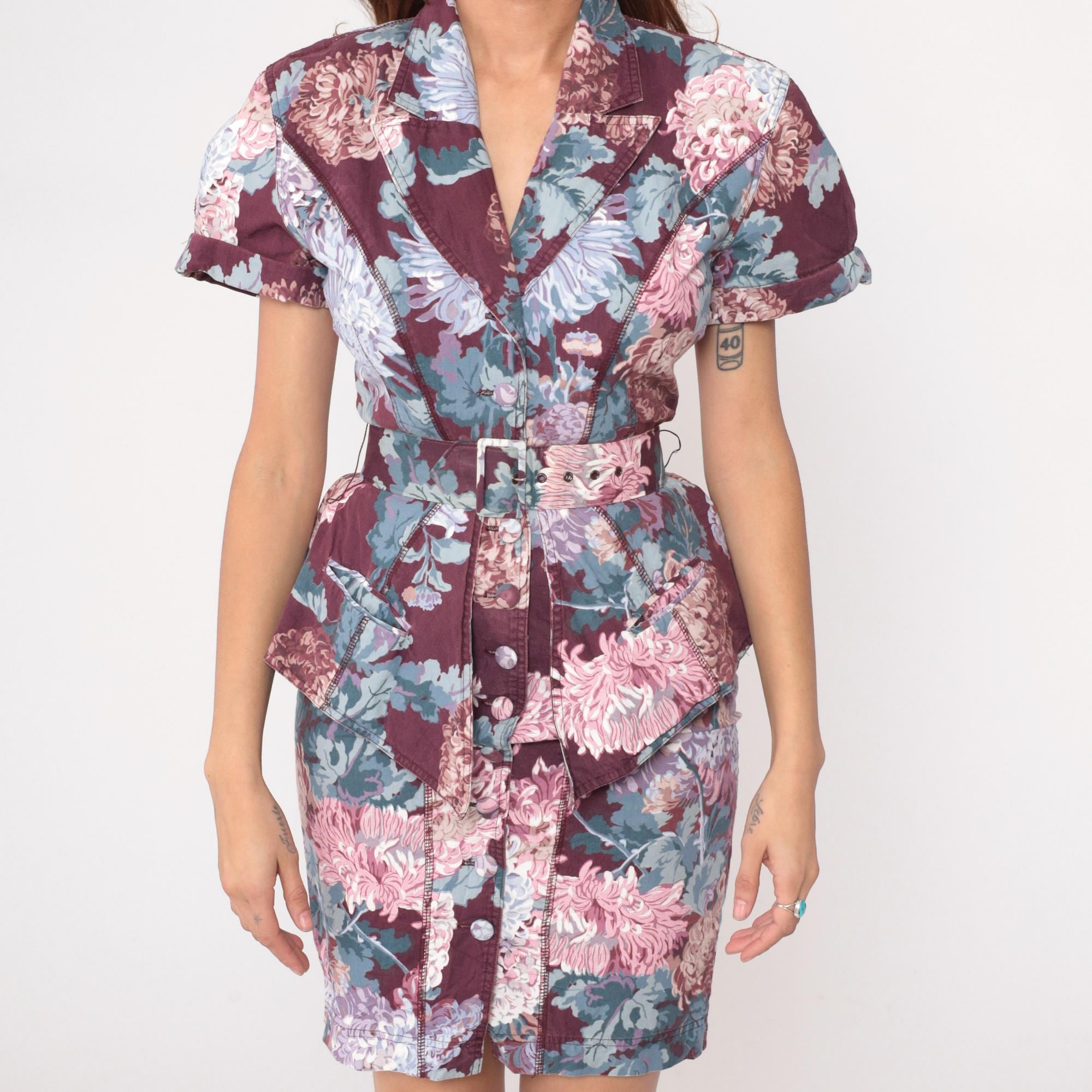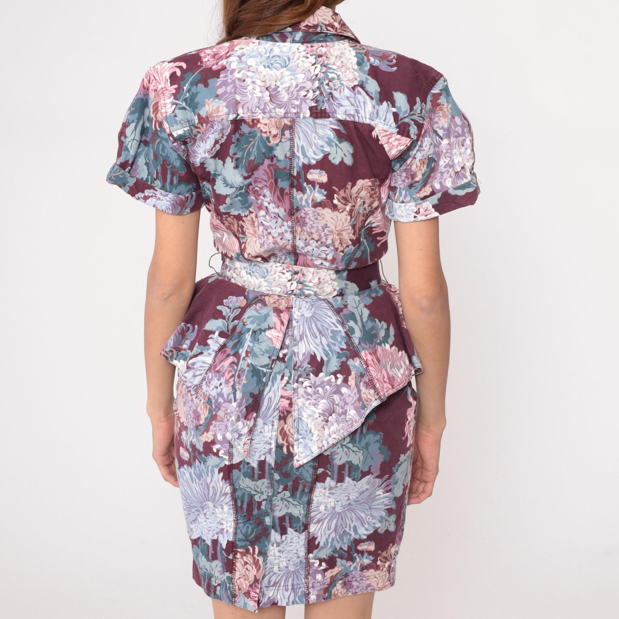 90s burgundy floral dress from Karen Alexander with large pink, blue, and white chrysanthemum print across wine-colored background. Button-front short-sleeve top with notched collar and peplum ruffle at waist and pencil skirt with belt and buckle closure.
