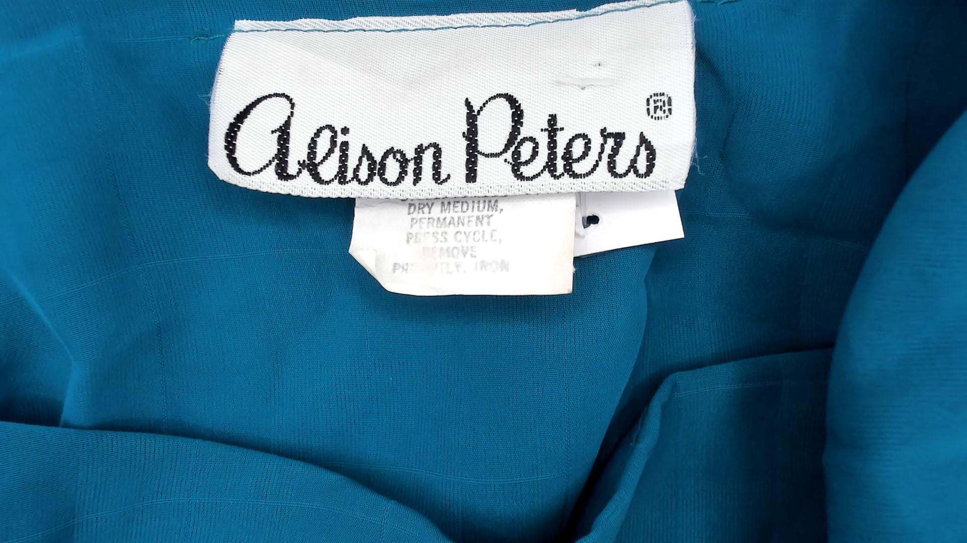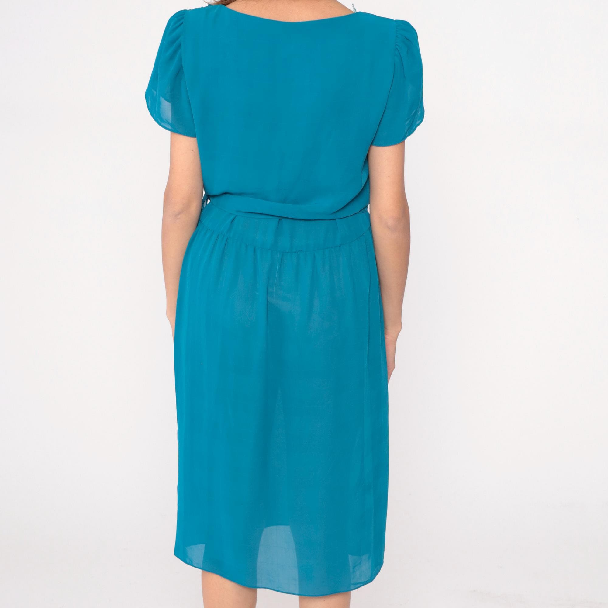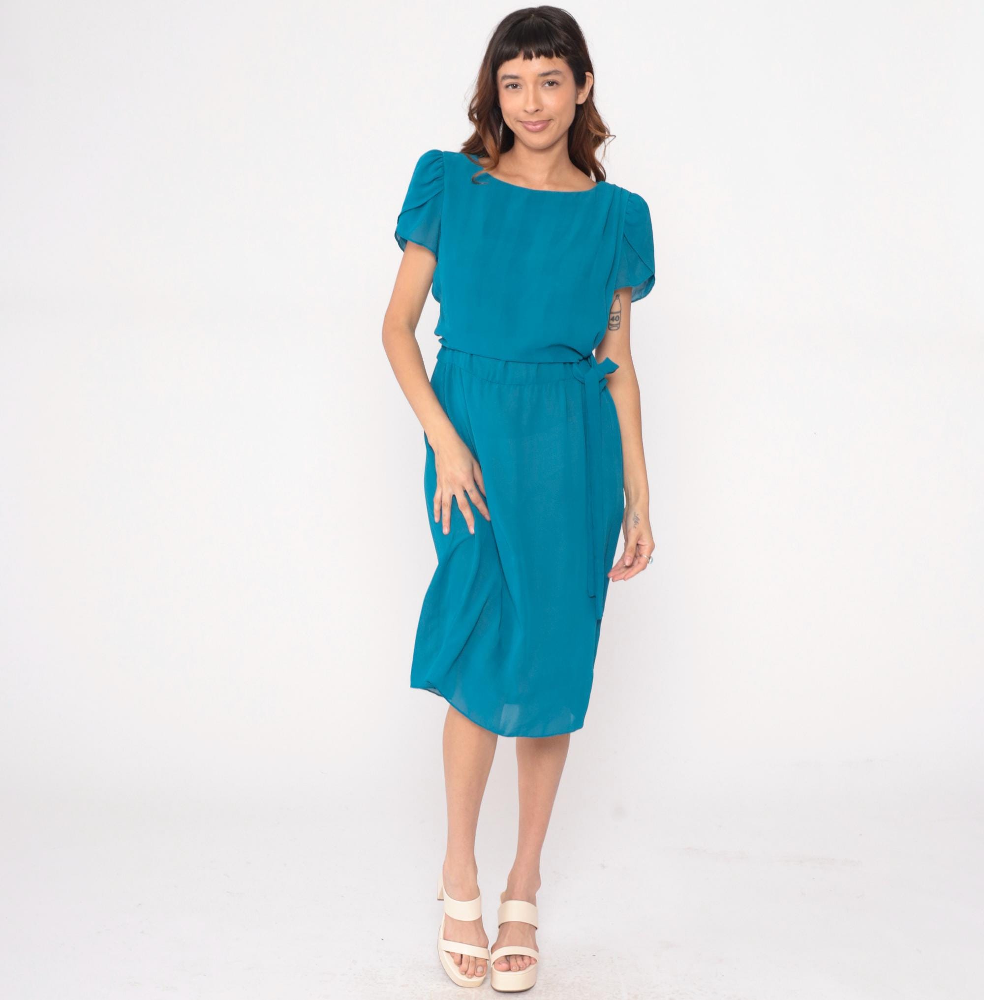 80s teal dress from alison peters with puff sleeves, boat neckline, and self-tie belt at waist. Short gathered sleeves, knee-length straight skirt.