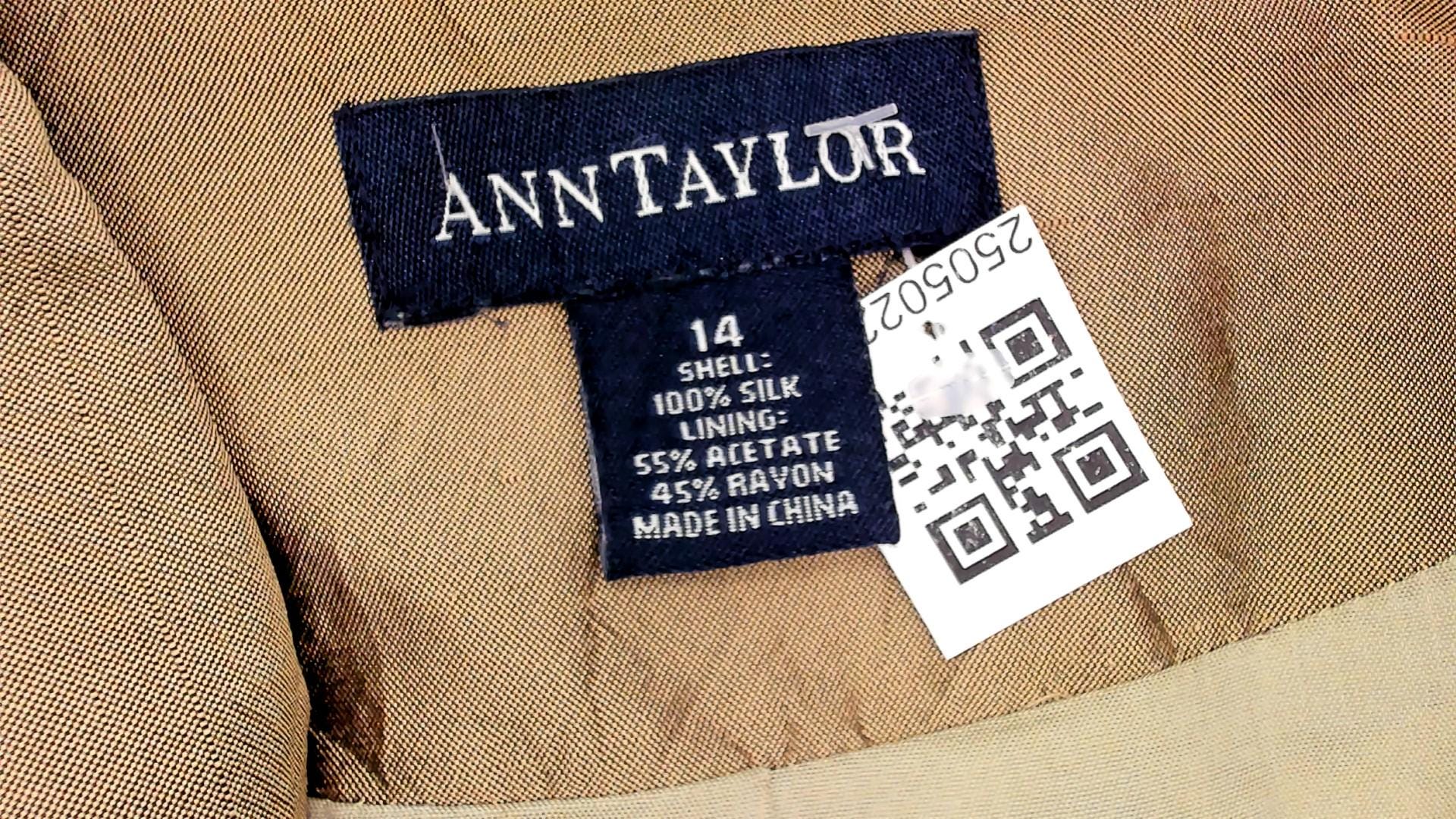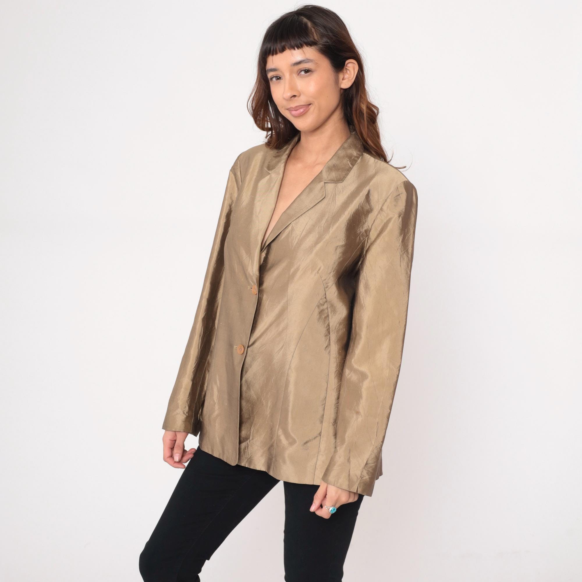 Y2K tan silk blazer from Ann Taylor with shawl collar and two-button front closure. Long sleeves, golden beige buttons, longer-length cut.