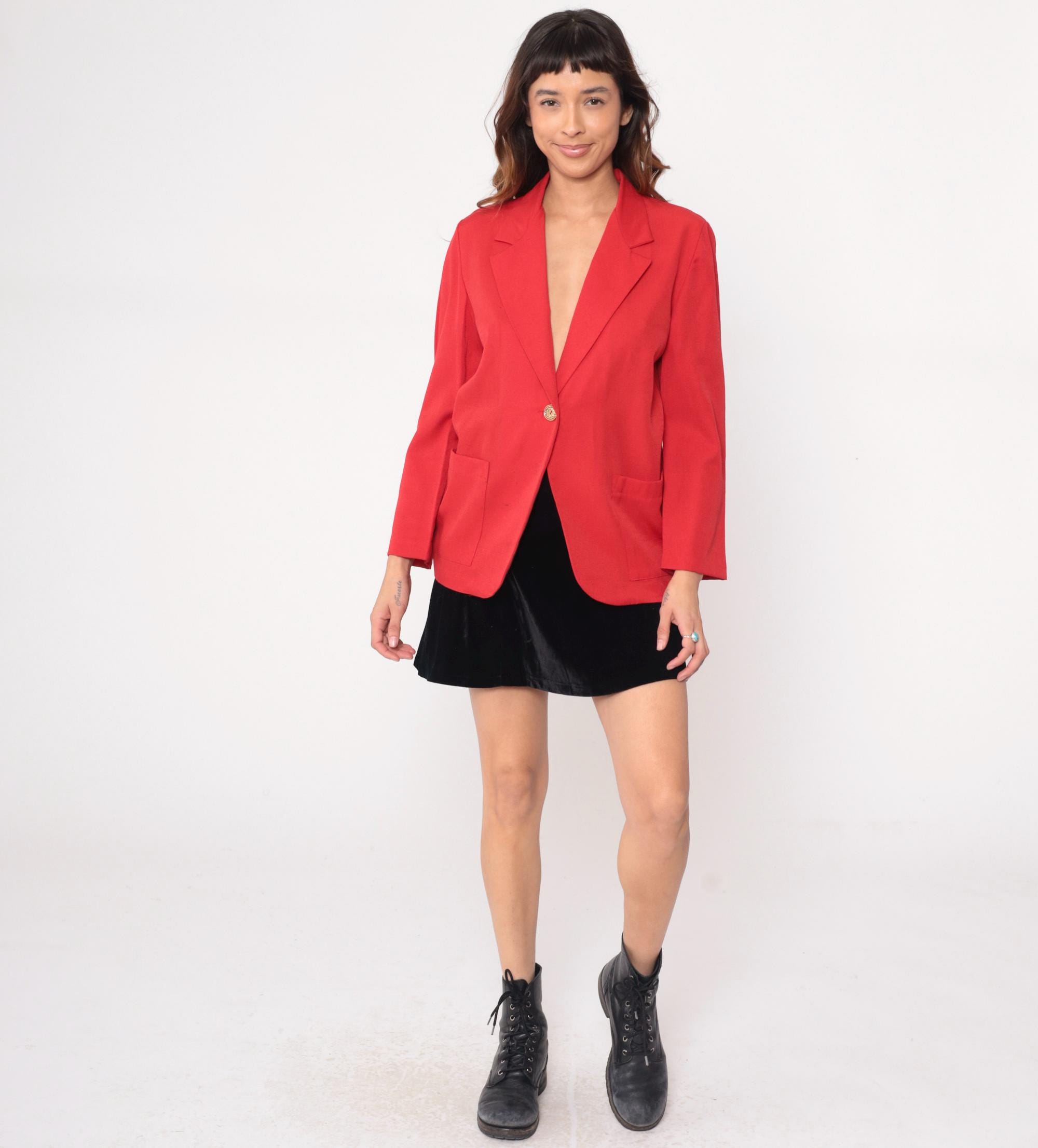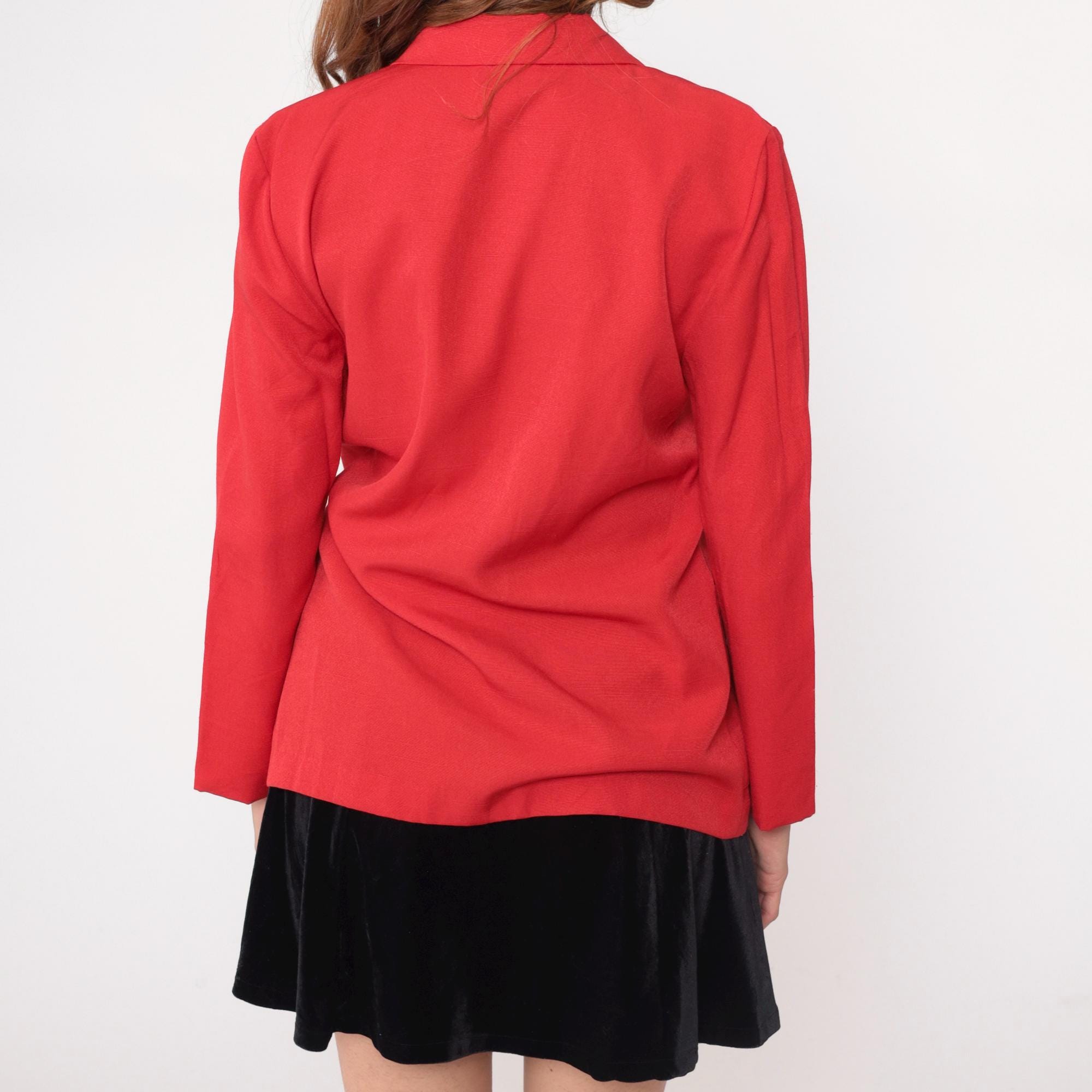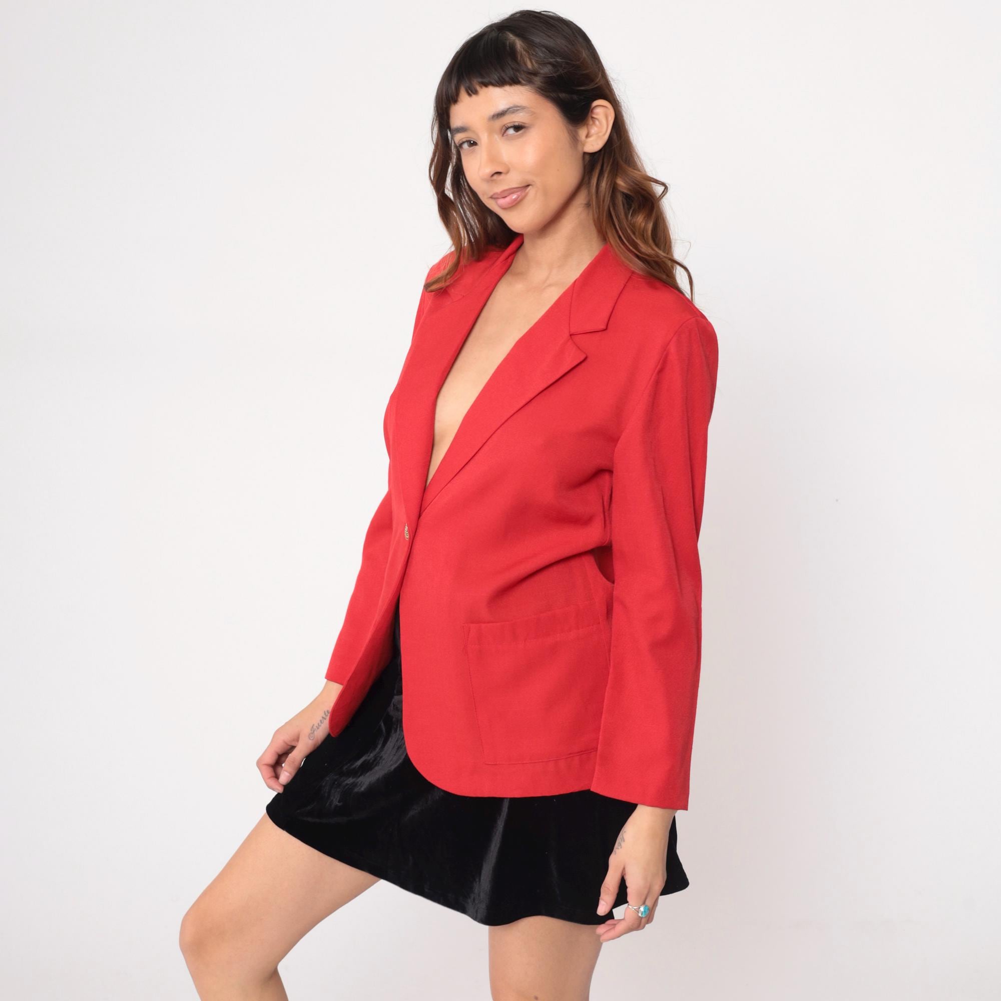 90s coral red blazer from Cristin Stevens with single gold button closure and notched lapel collar. Two front patch pockets, long sleeves, single-breasted construction.