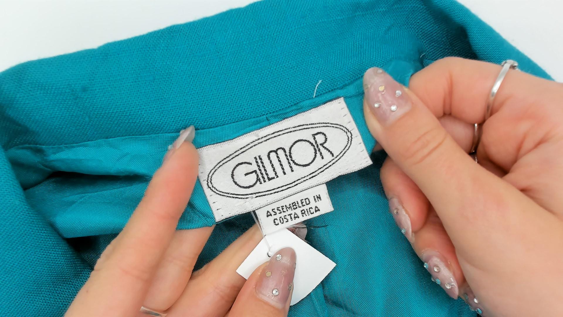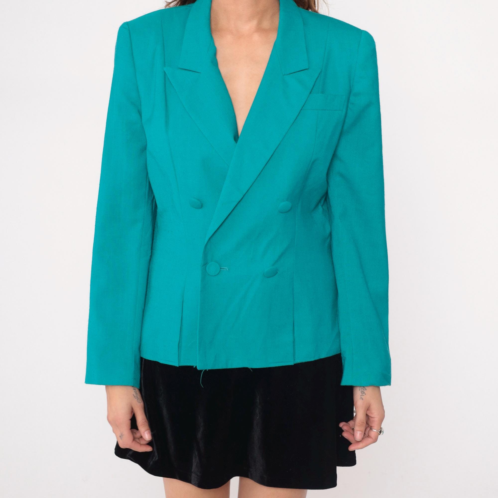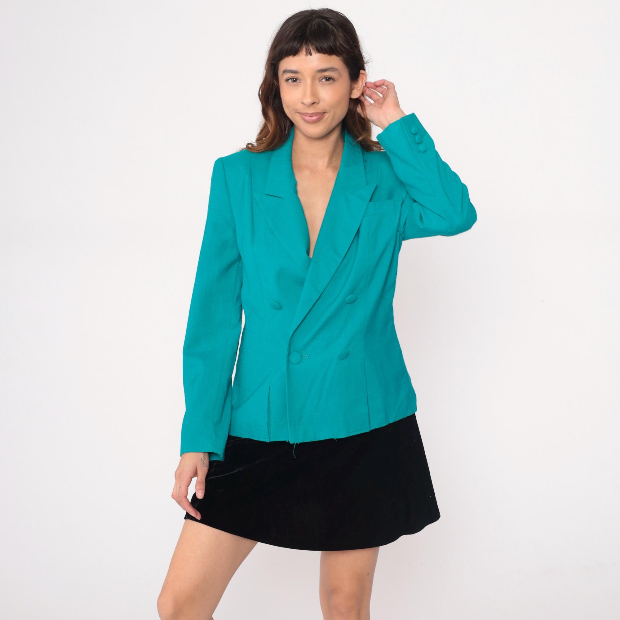 90s turquoise double-breasted blazer from gilmor with wide peaked lapels and covered button front closure. Structured shoulders, long sleeves with button cuffs, two front pockets.
