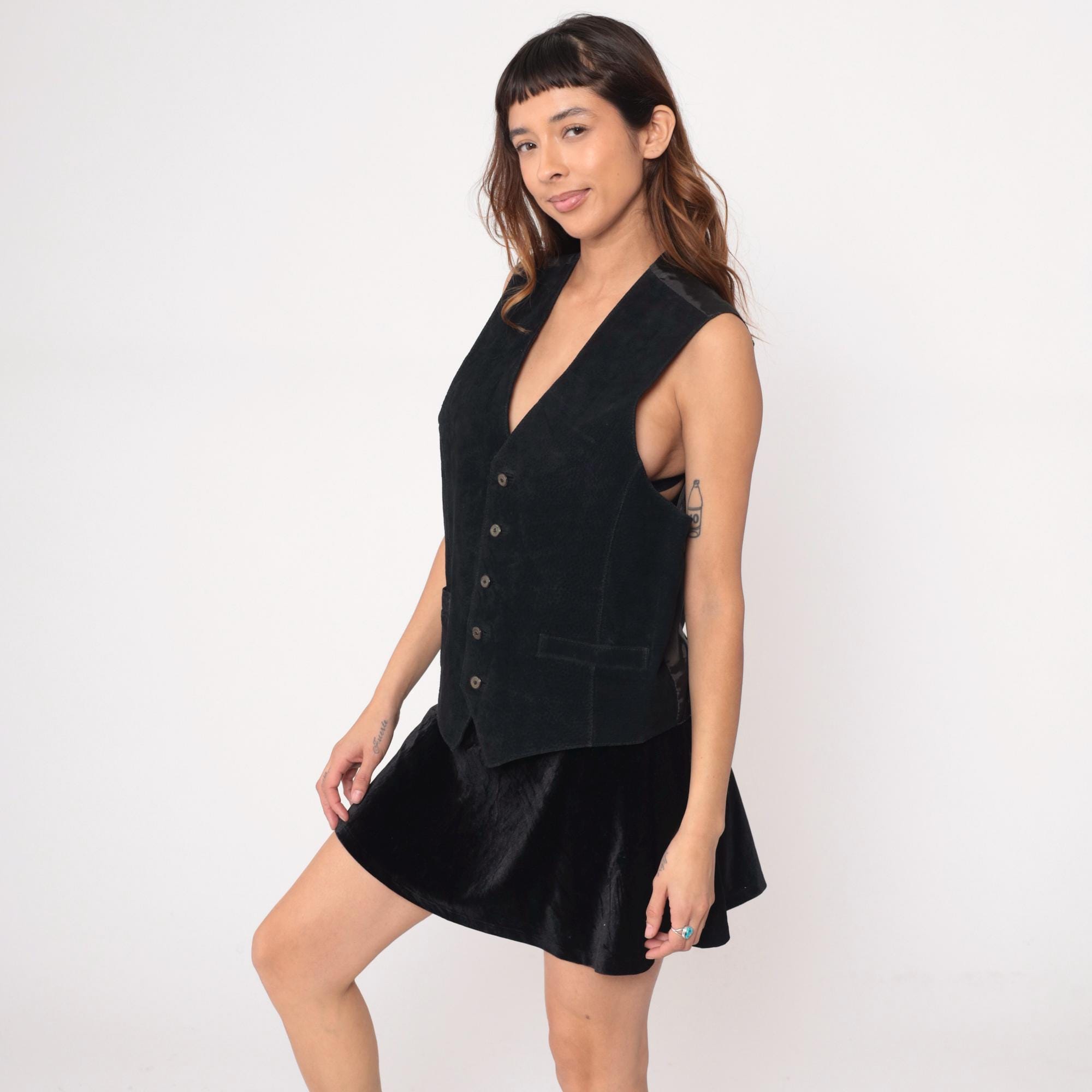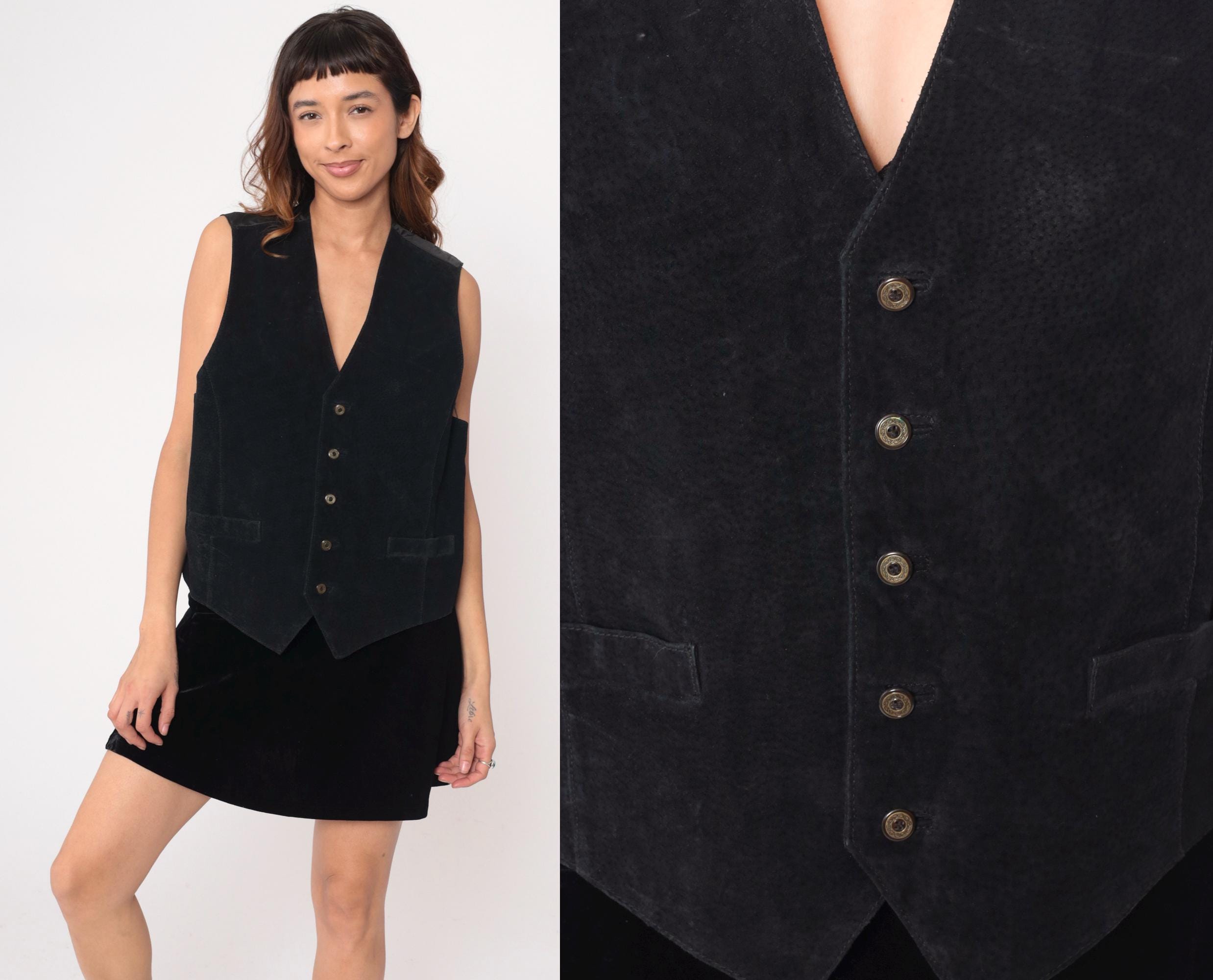 90s black suede vest with V-neck, five-button front closure, and patch pockets with leather trim. Leather collar detail, satin back panel with adjustable belt closure at waist. Suede with leather accents.