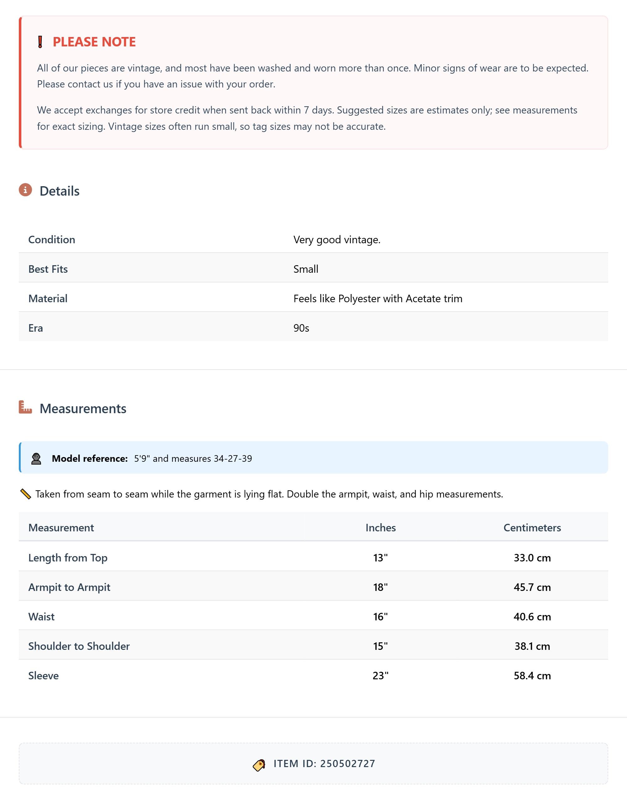 All of our pieces are vintage, and most have been washed and worn more than once. Minor signs of wear are to be expected. Please contact us if you have an issue with your order. We accept exchanges for store credit when sent back within 7 days.