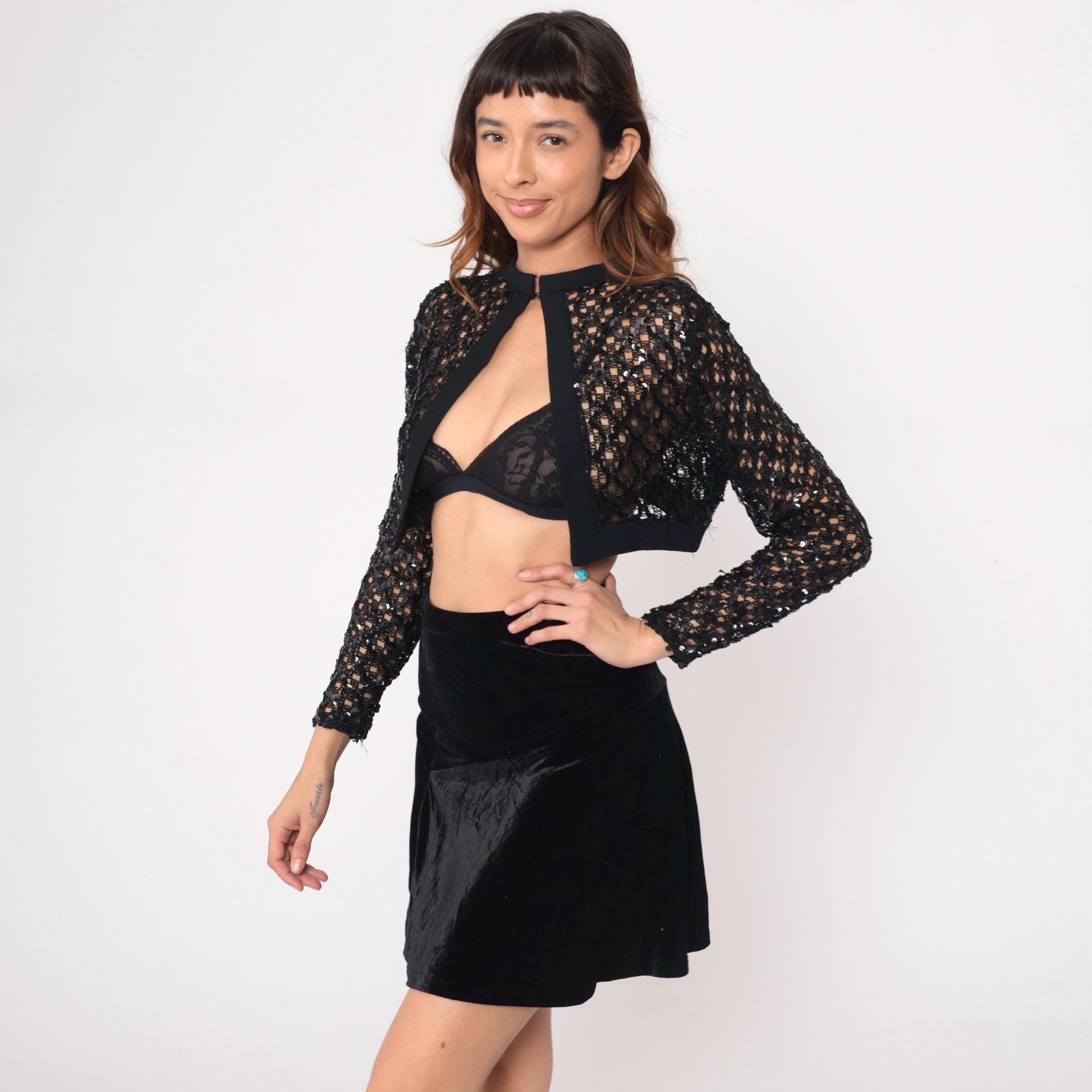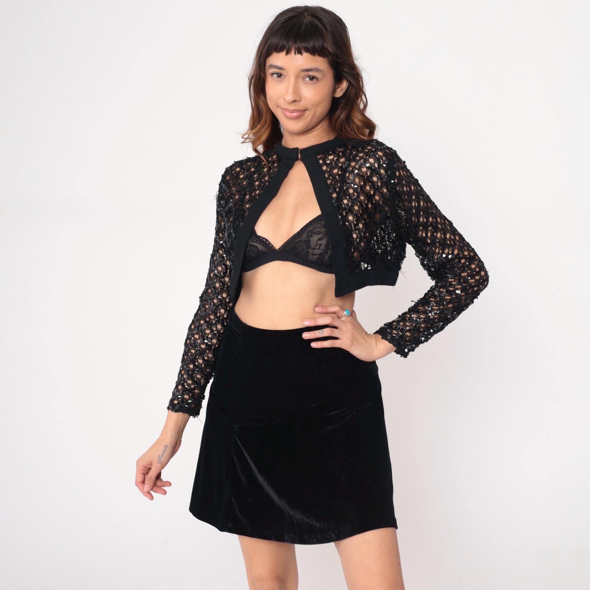 90s black cropped jacket with sequined mesh sleeves and body, solid black panels at chest and waist. High neckline with keyhole cutout at center front, long sleeves.