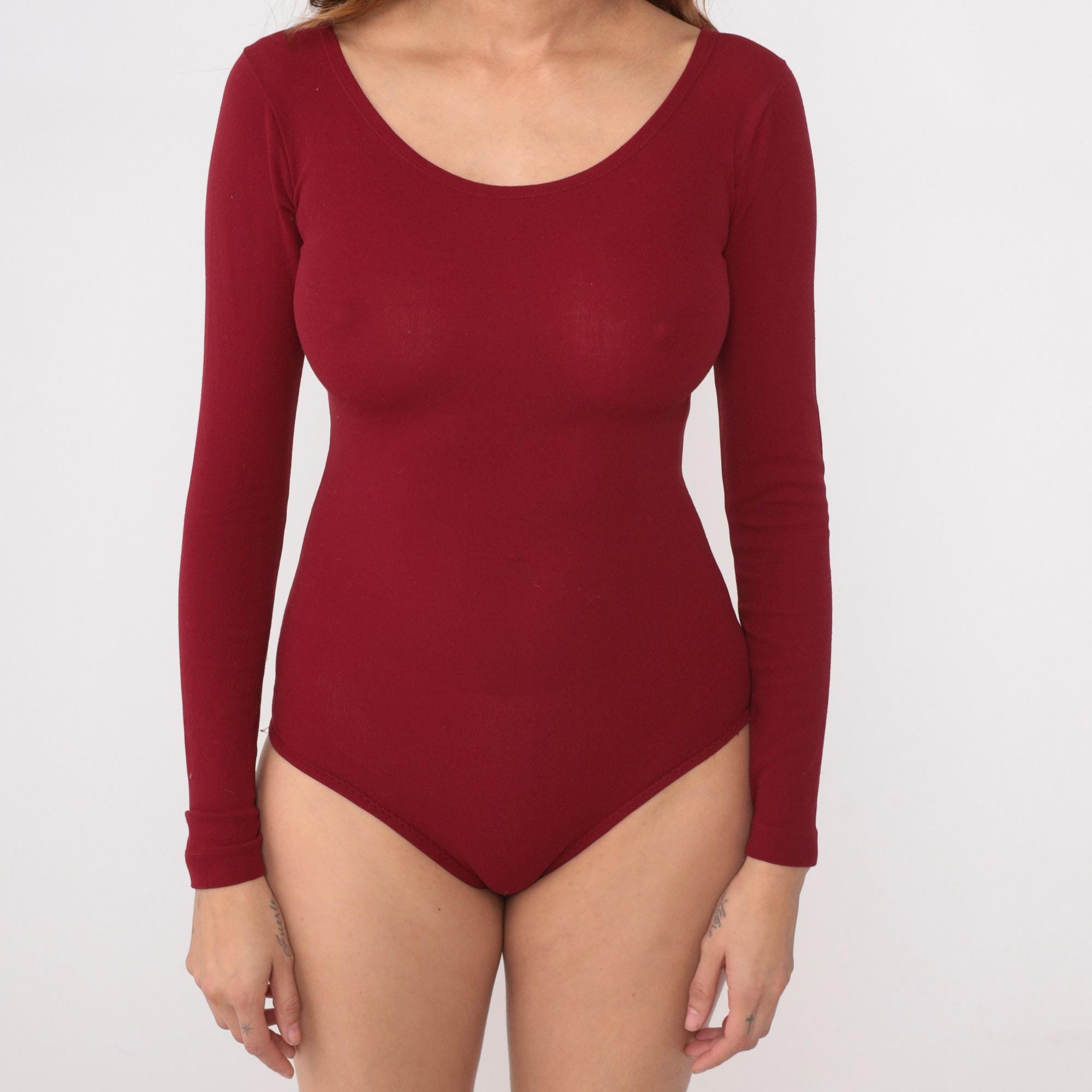 70s burgundy bodysuit with long sleeves and scoop neckline. Form-fitting silhouette in wine-colored nylon. Snap closure at bottom.