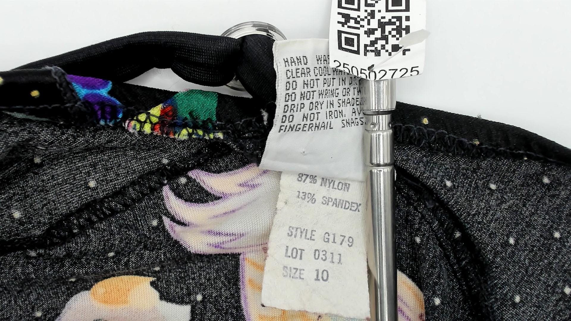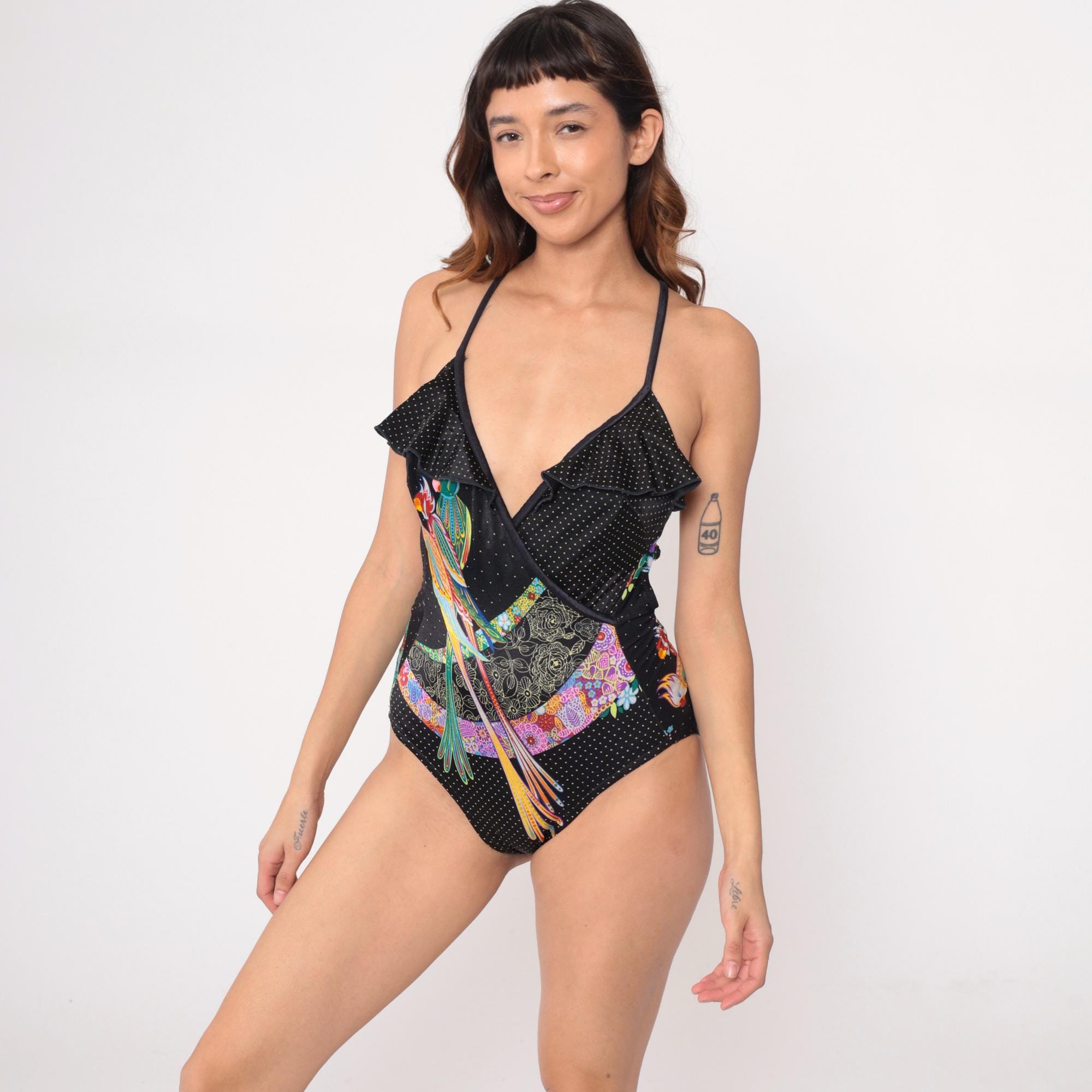 90s one-piece swimsuit from Gaviota in black with white polka dots and tropical bird and floral print. Colorful parrots in red, yellow, blue, green, and purple with paisley and floral design elements across the fabric. Wrap-style bodice with ruffle trim at V-neckline, cross-back adjustable straps, high-cut leg openings.