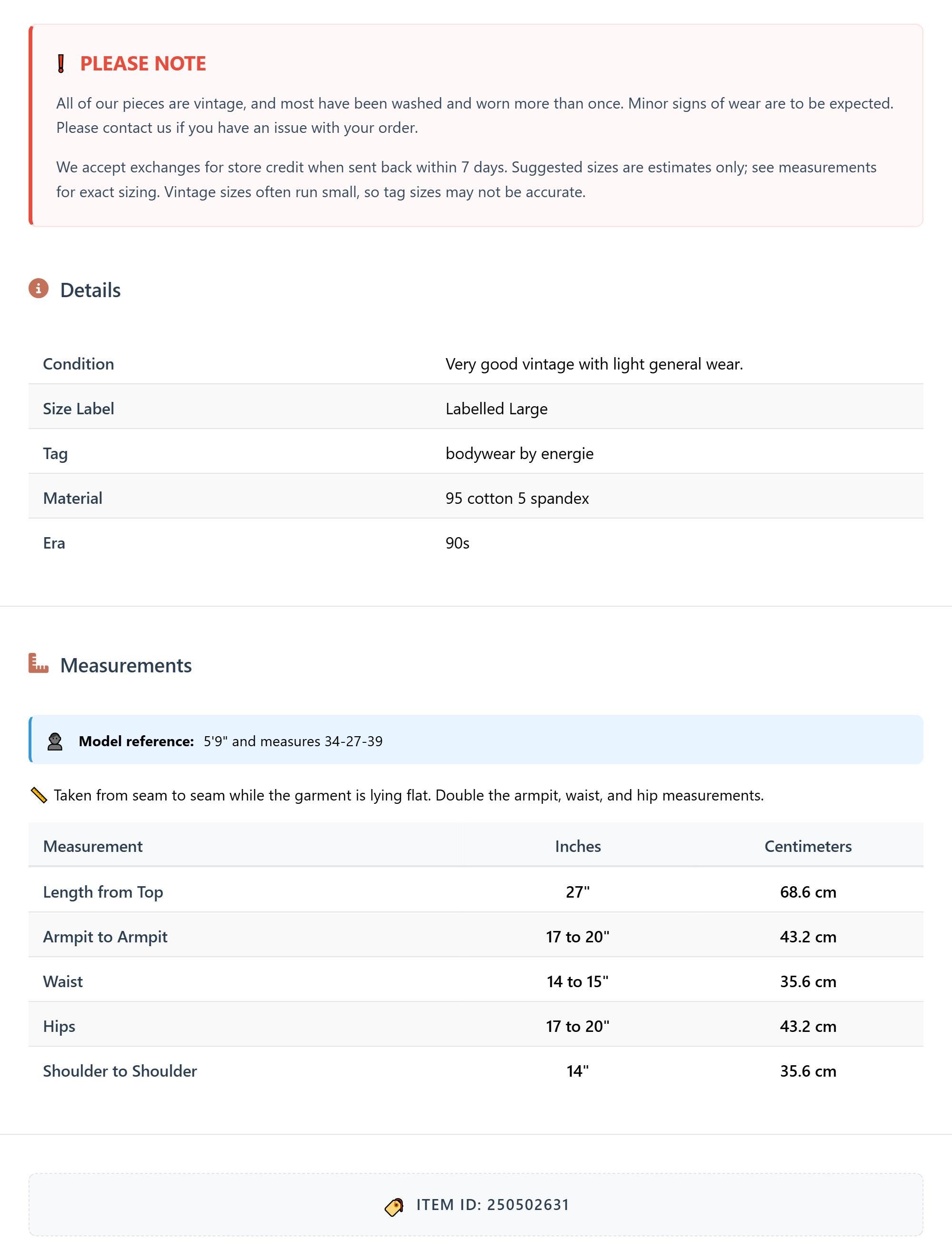 All of our pieces are vintage, and most have been washed and worn more than once. Minor signs of wear are to be expected. Please contact us if you have an issue with your order. We accept exchanges for store credit when sent back within 7 days.