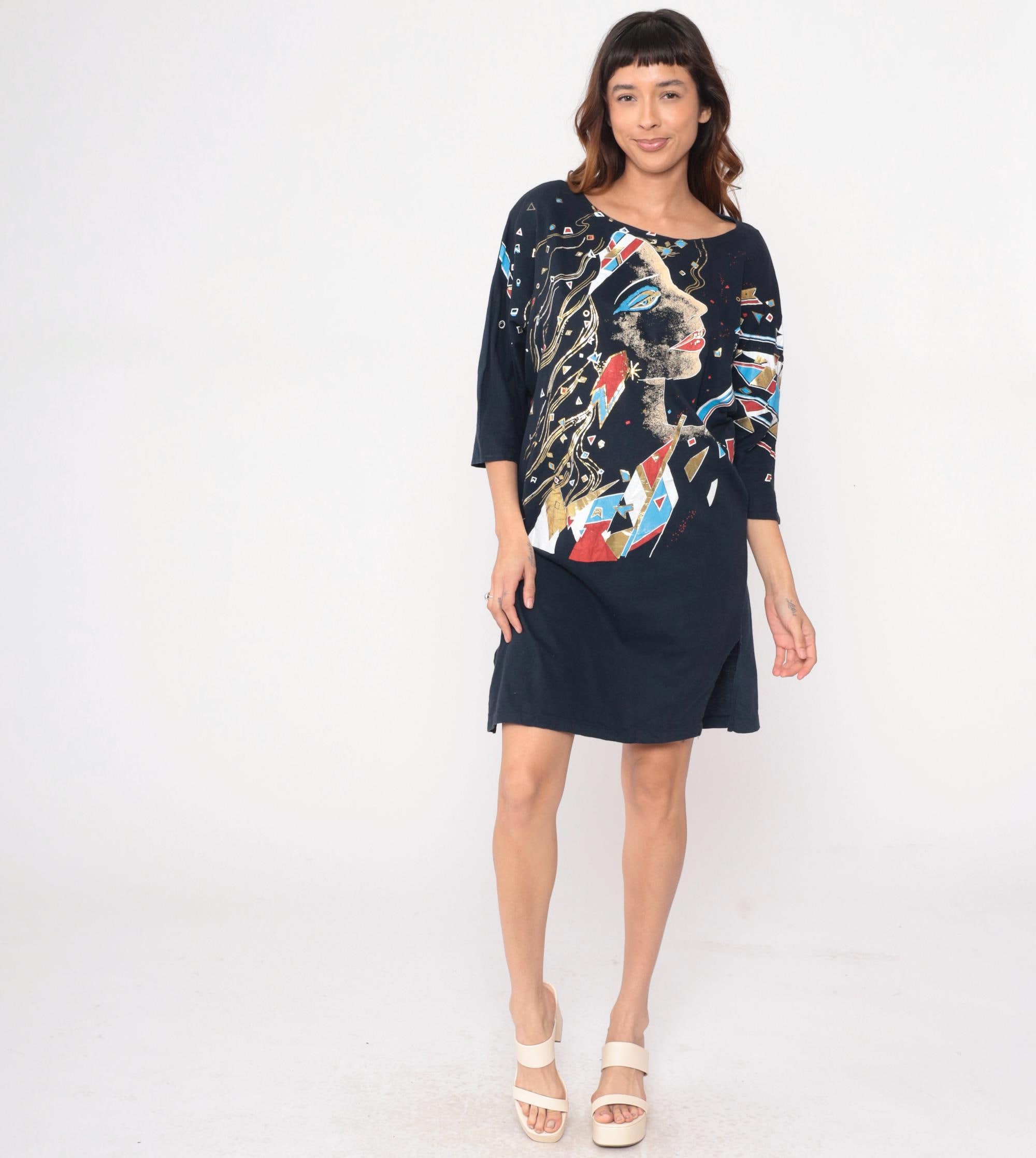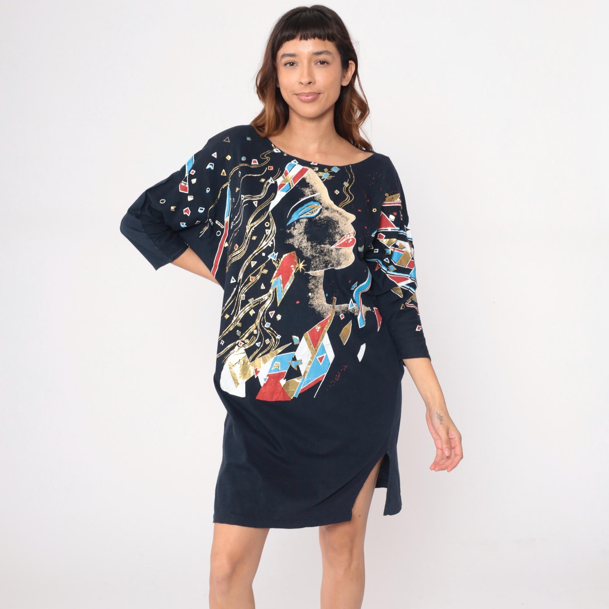 90s black shift dress with large abstract face graphic in white, red, blue, and gold geometric shapes across the front and sleeves. Round neckline, three-quarter sleeves, side slits at hem.