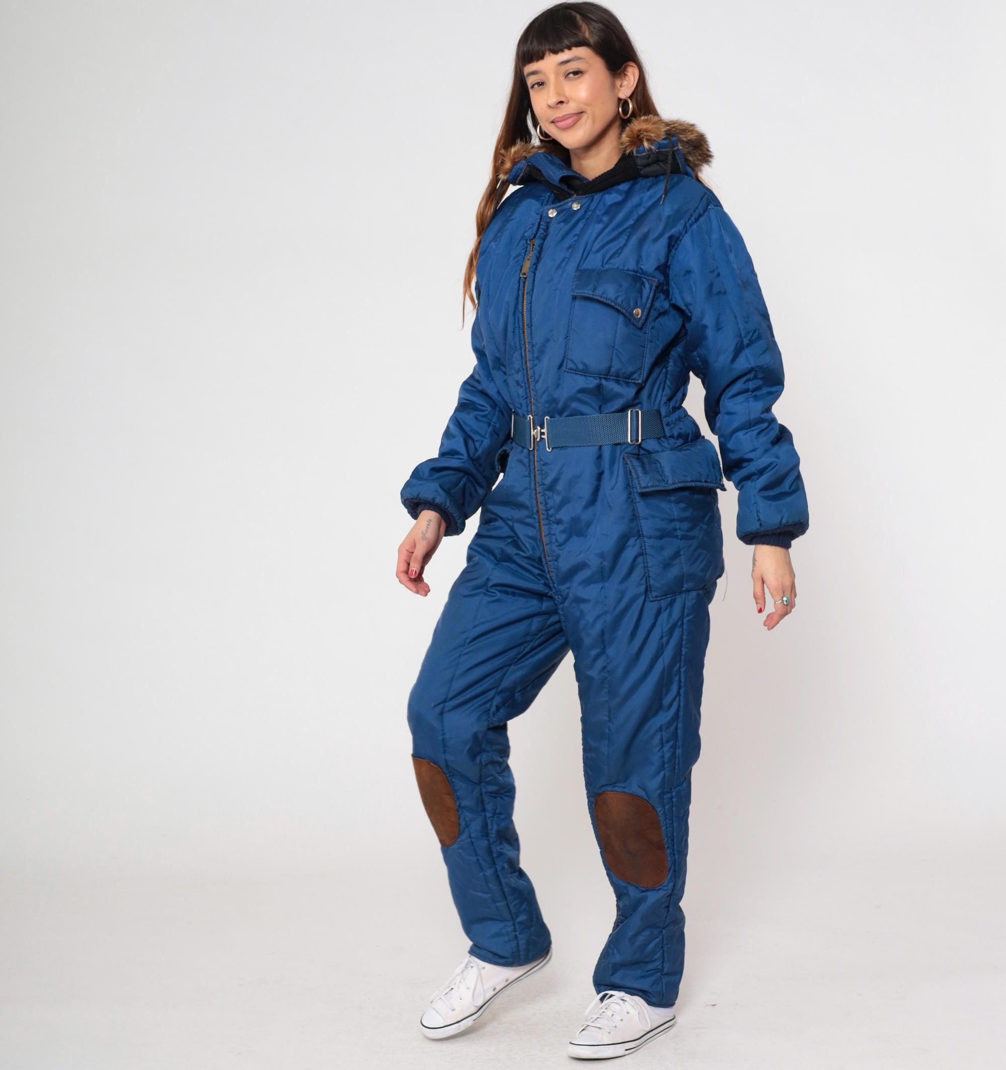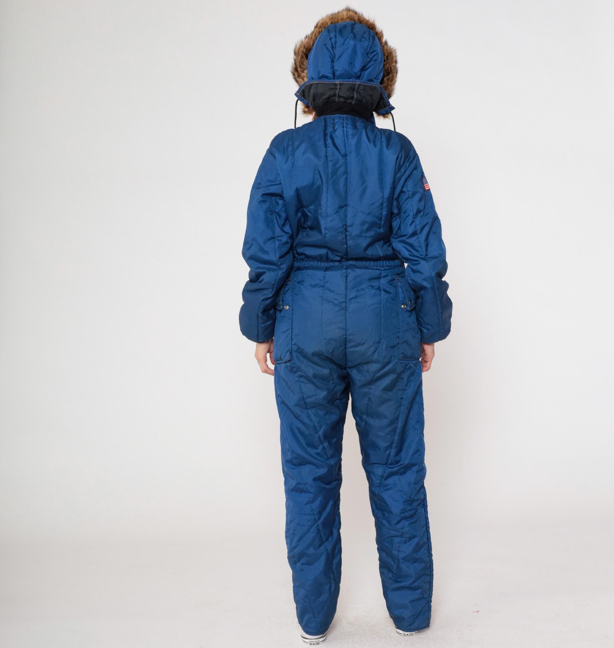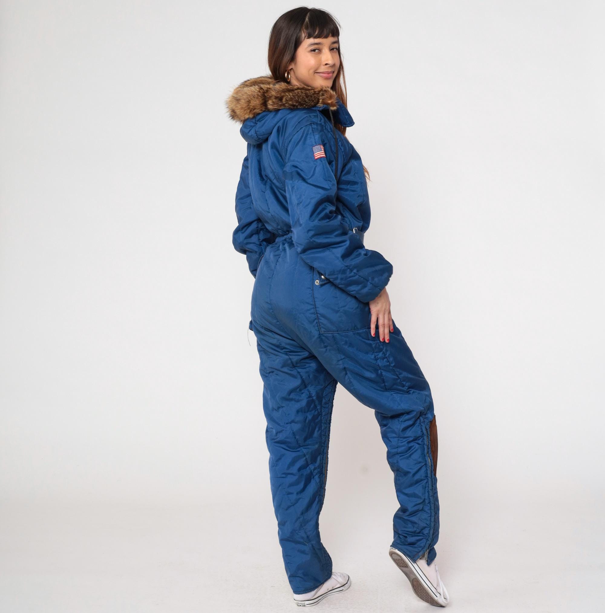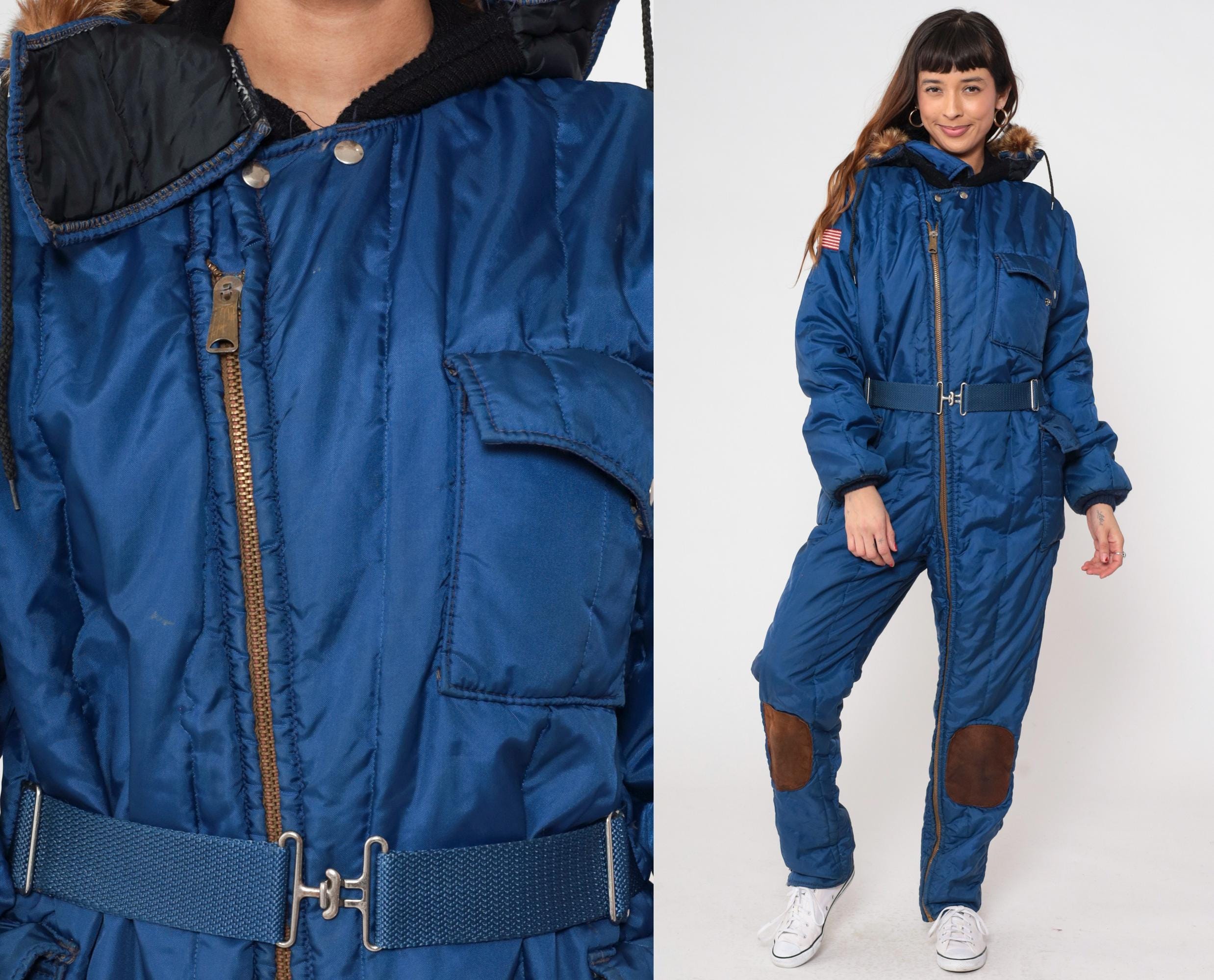 80s blue insulated snowsuit from Polarware Division of Midwest with fur-trimmed hood, front zipper closure, and belted waist. American flag patch on sleeve, chest pockets, brown suede knee patches. Nylon and polyester blend with real fur trim.