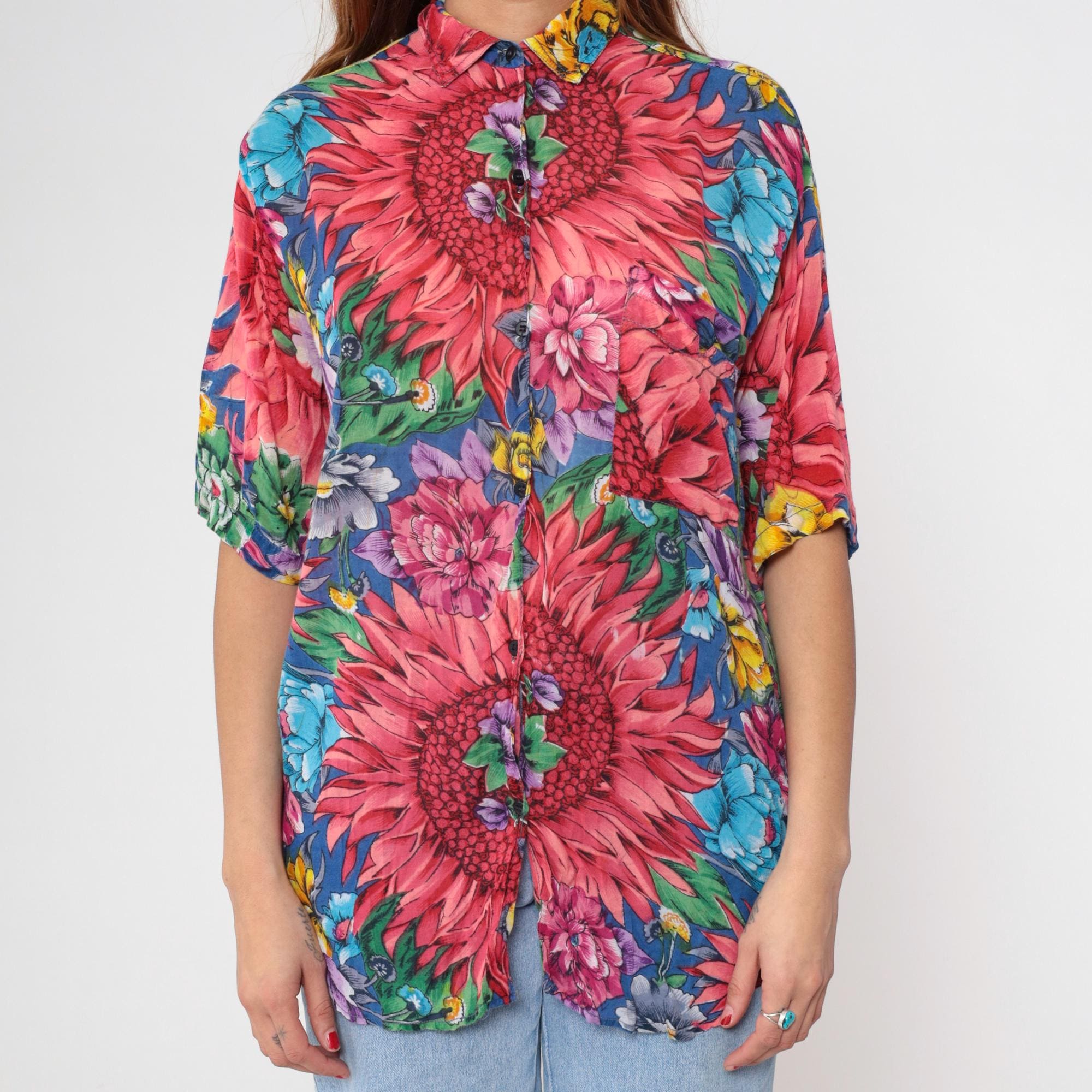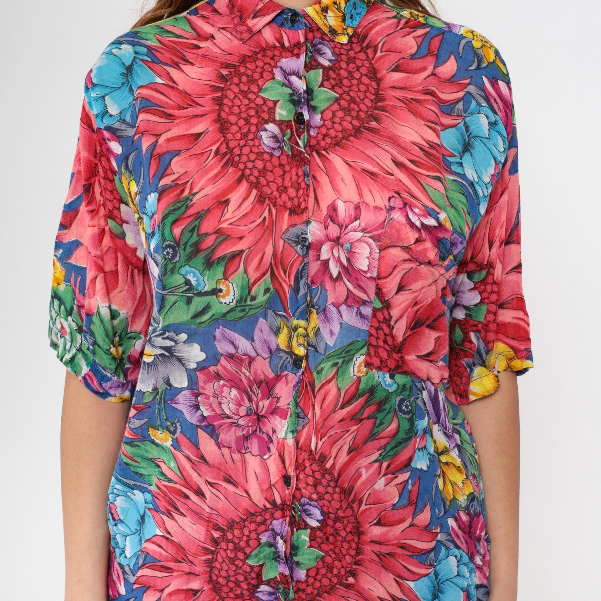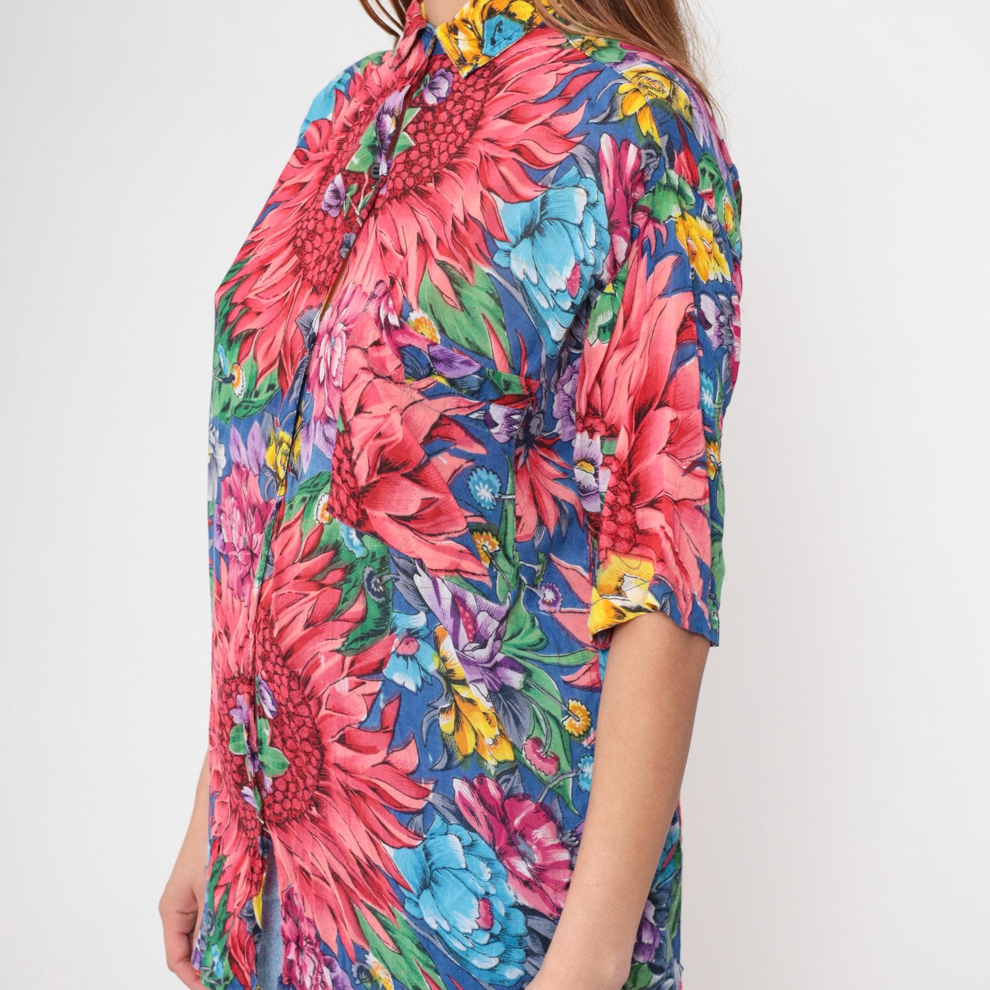 90s floral print shirt with large pink dahlias, blue, purple, and yellow flowers across the fabric. Stand collar with button front closure and short kimono-style sleeves.