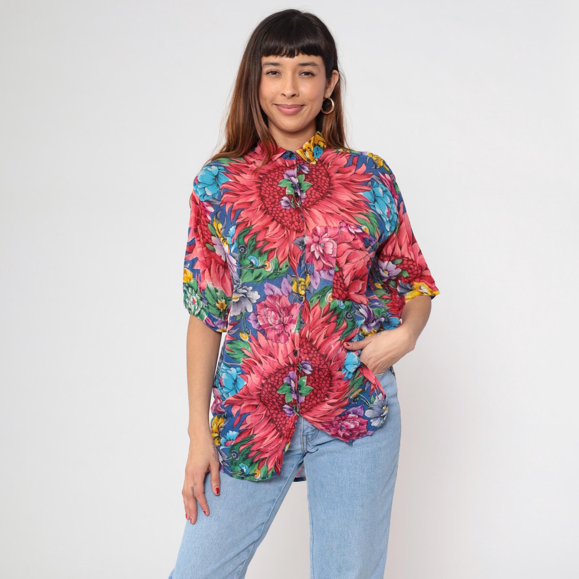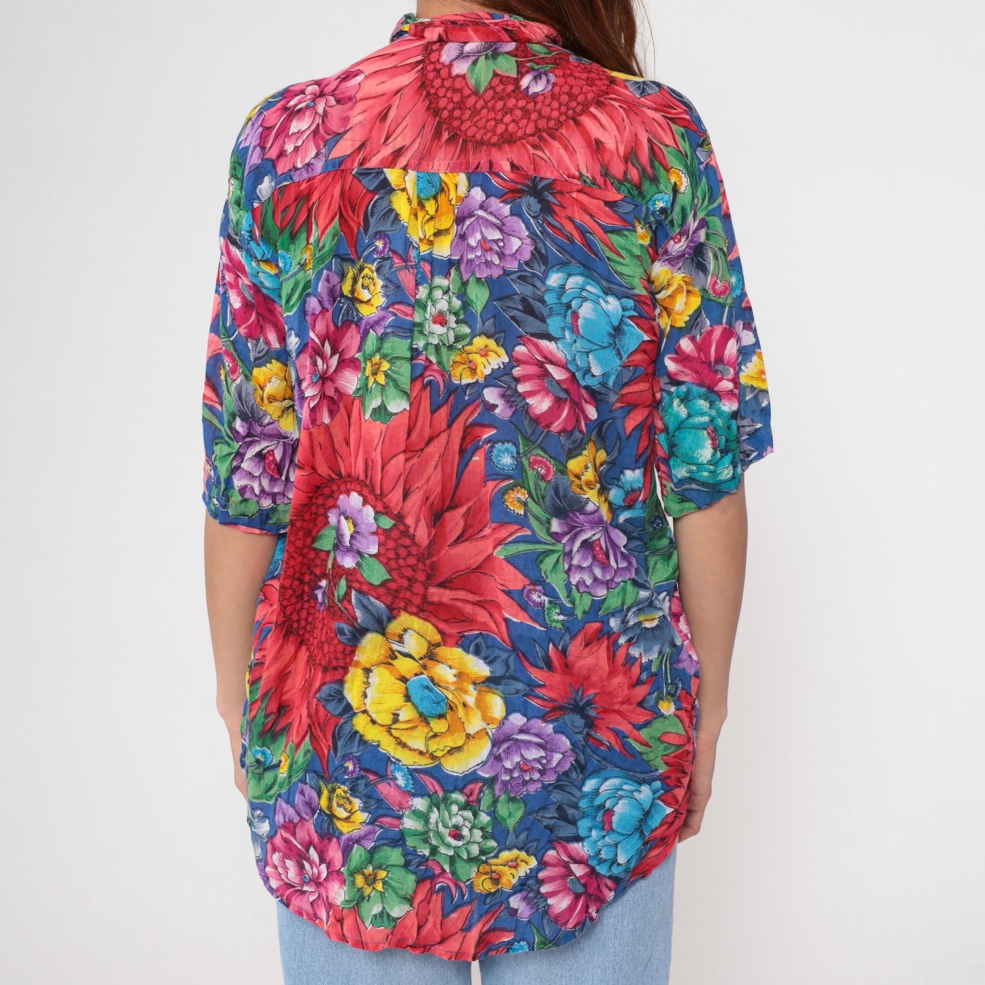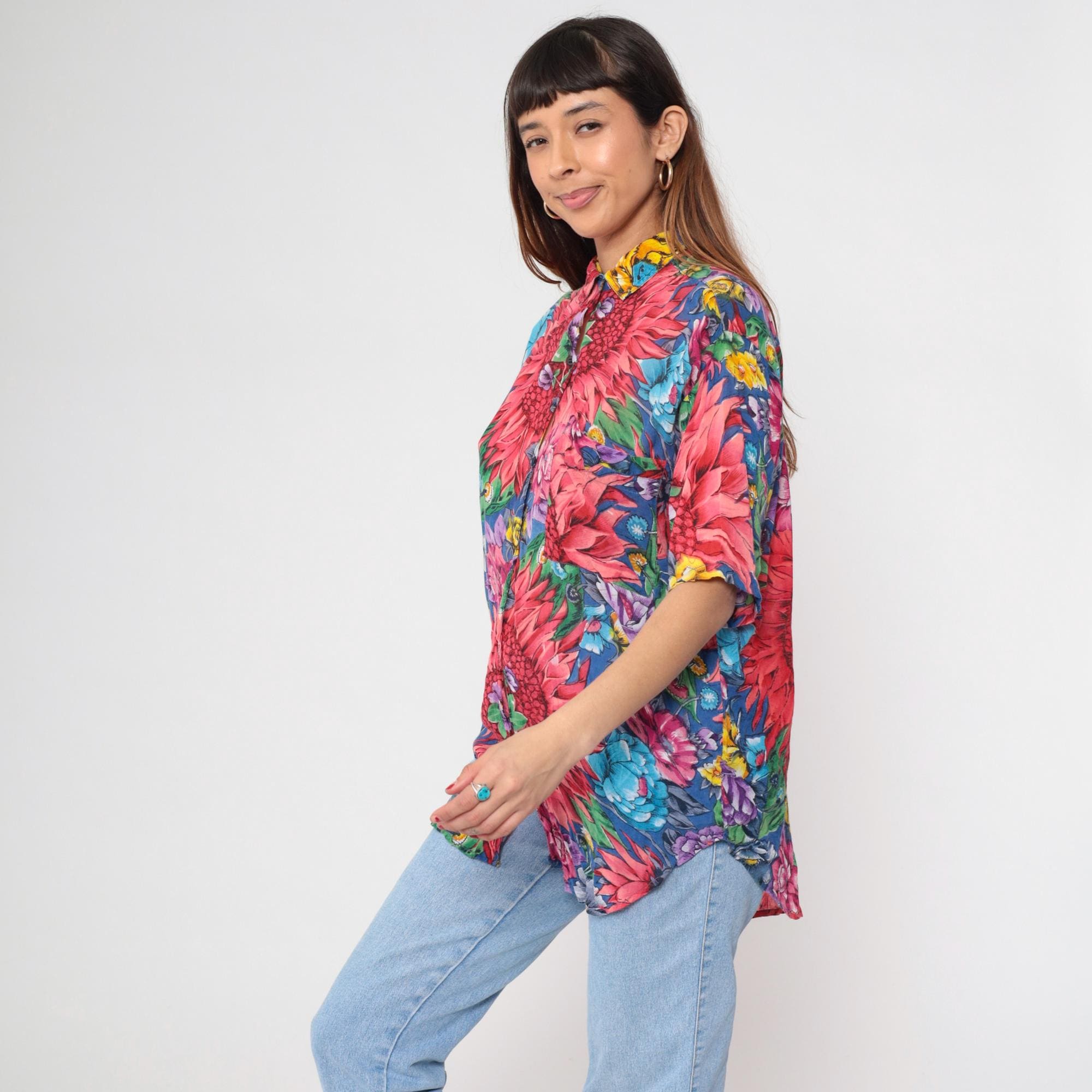 90s floral print shirt with large pink dahlias, blue, purple, and yellow flowers across the fabric. Stand collar with button front closure and short kimono-style sleeves.