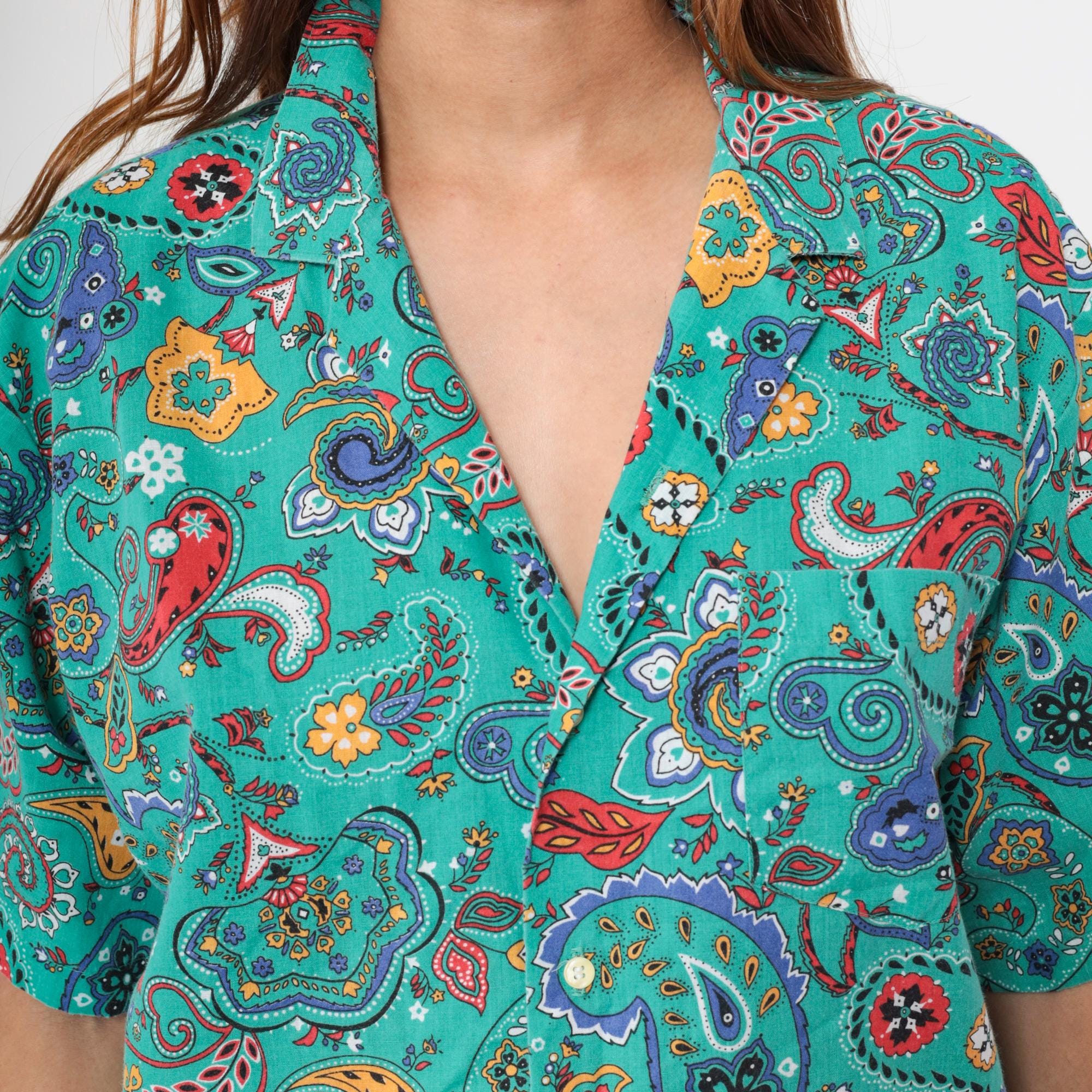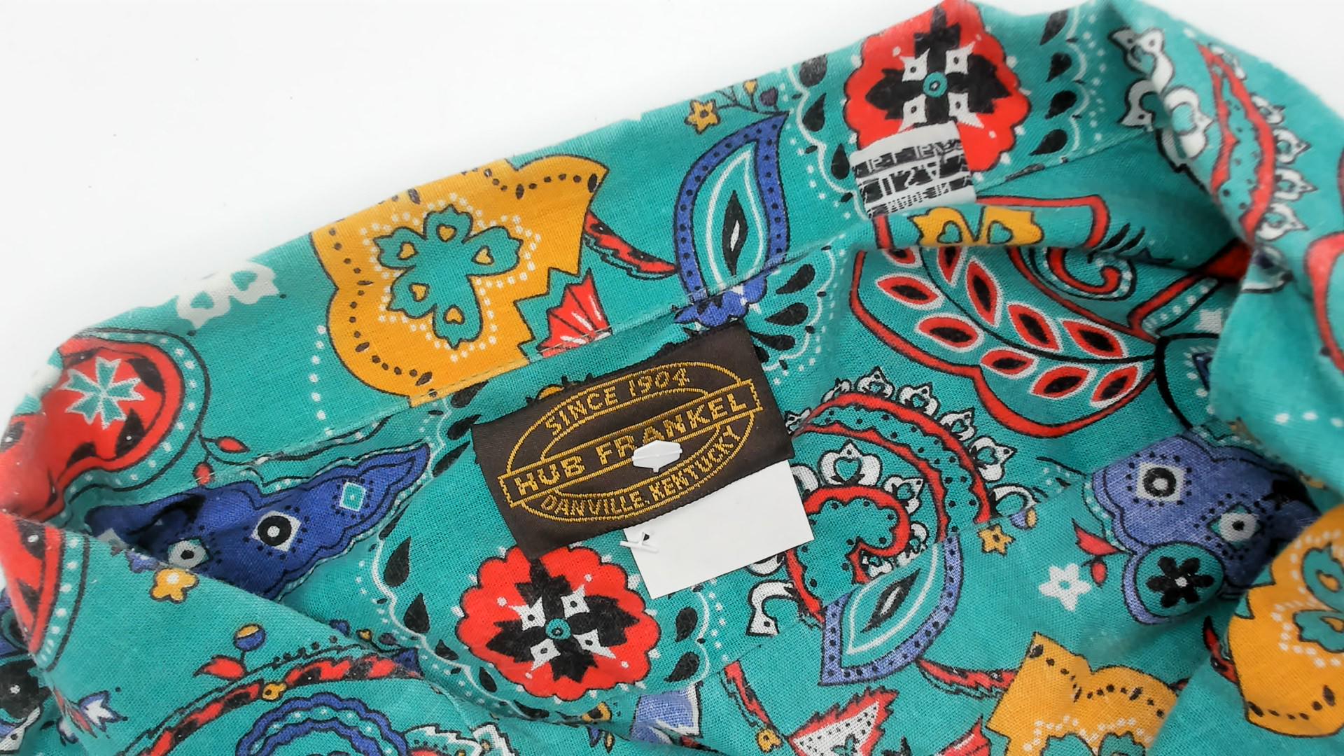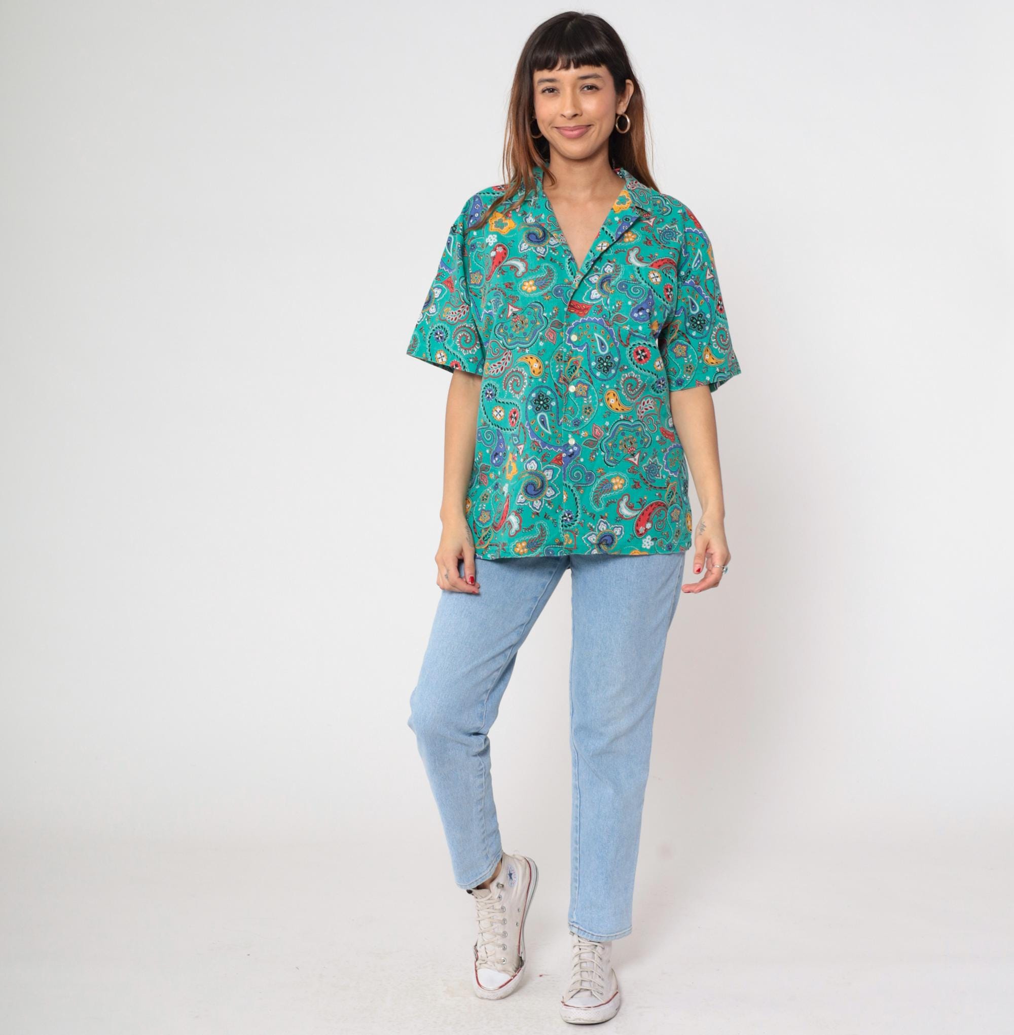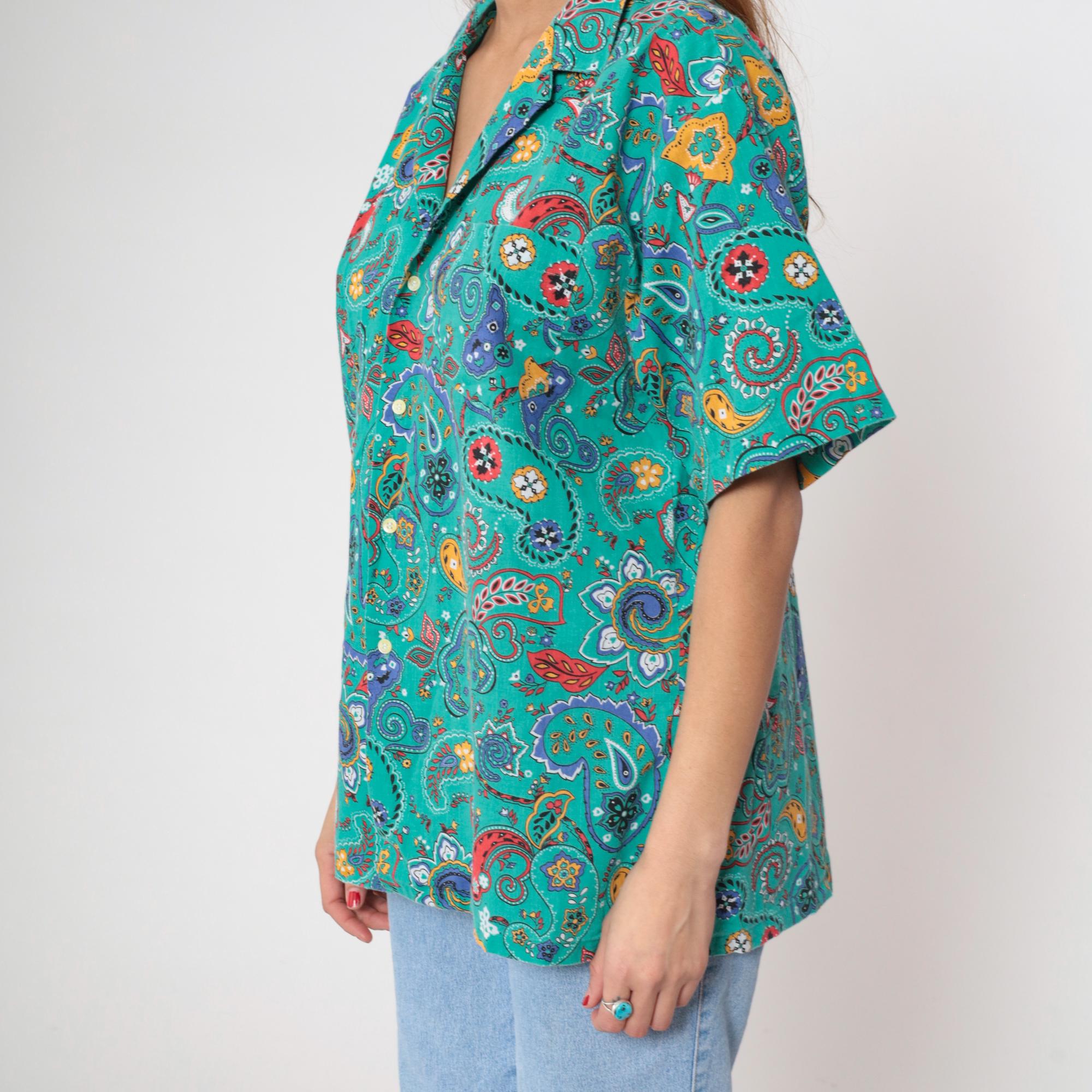 90s turquoise paisley print shirt from Hub Frankel with red, purple, yellow, and white paisley motifs and floral details across the fabric. Button front closure with notched collar, short sleeves, and relaxed fit.