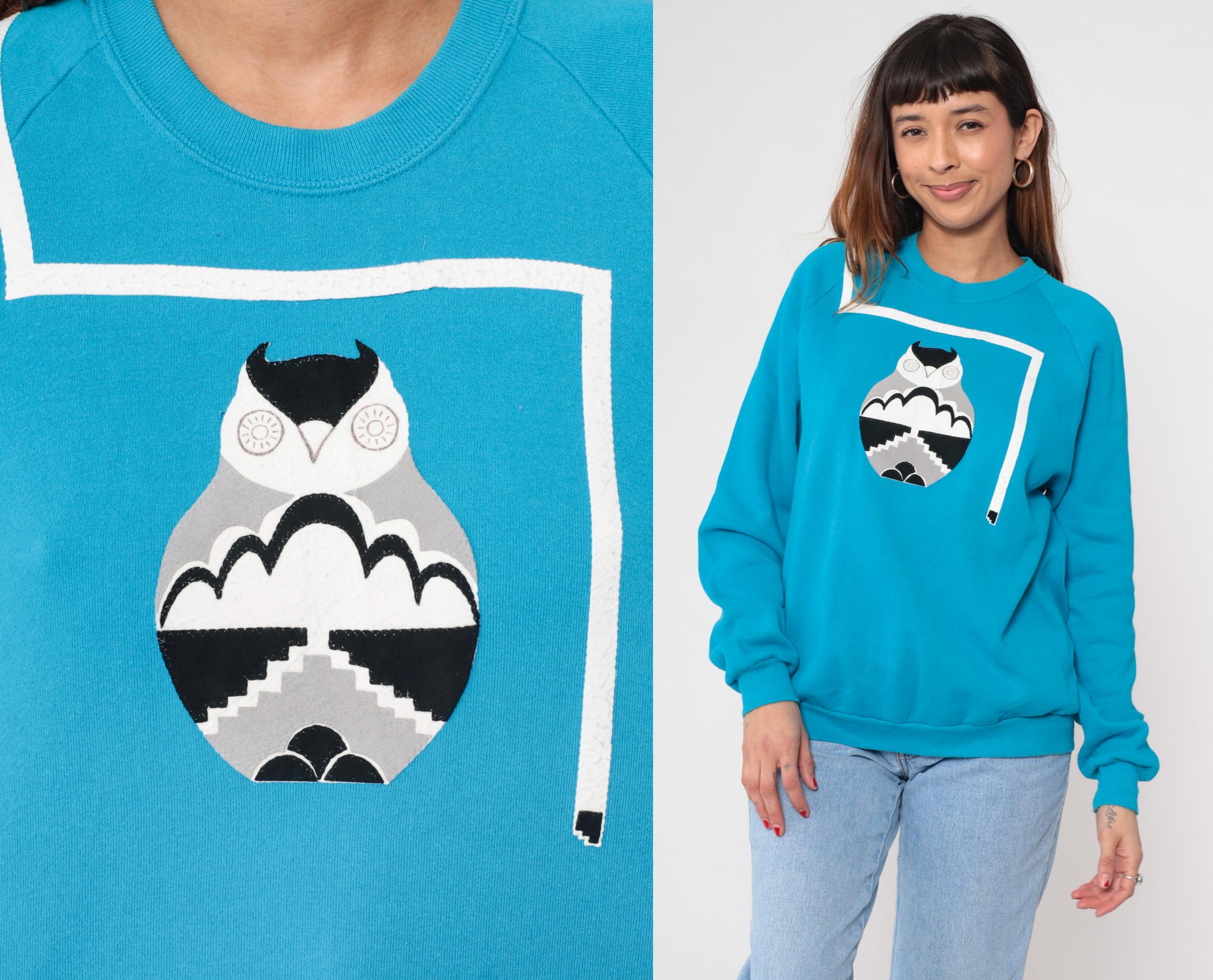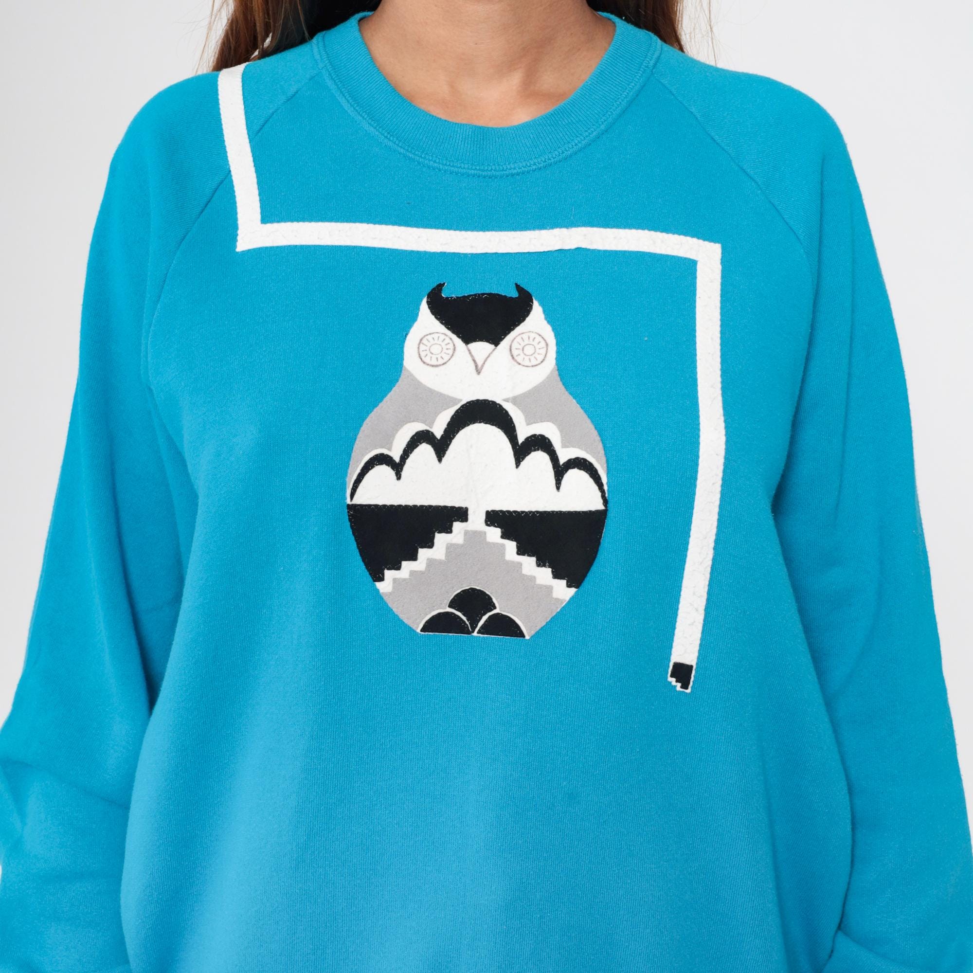 90s light blue sweatshirt from Jerzees with geometric owl graphic on front in black, white, and gray. White line design extends from the graphic across the chest and shoulder. Raglan sleeves with ribbed cuffs, crew neckline, ribbed hem.