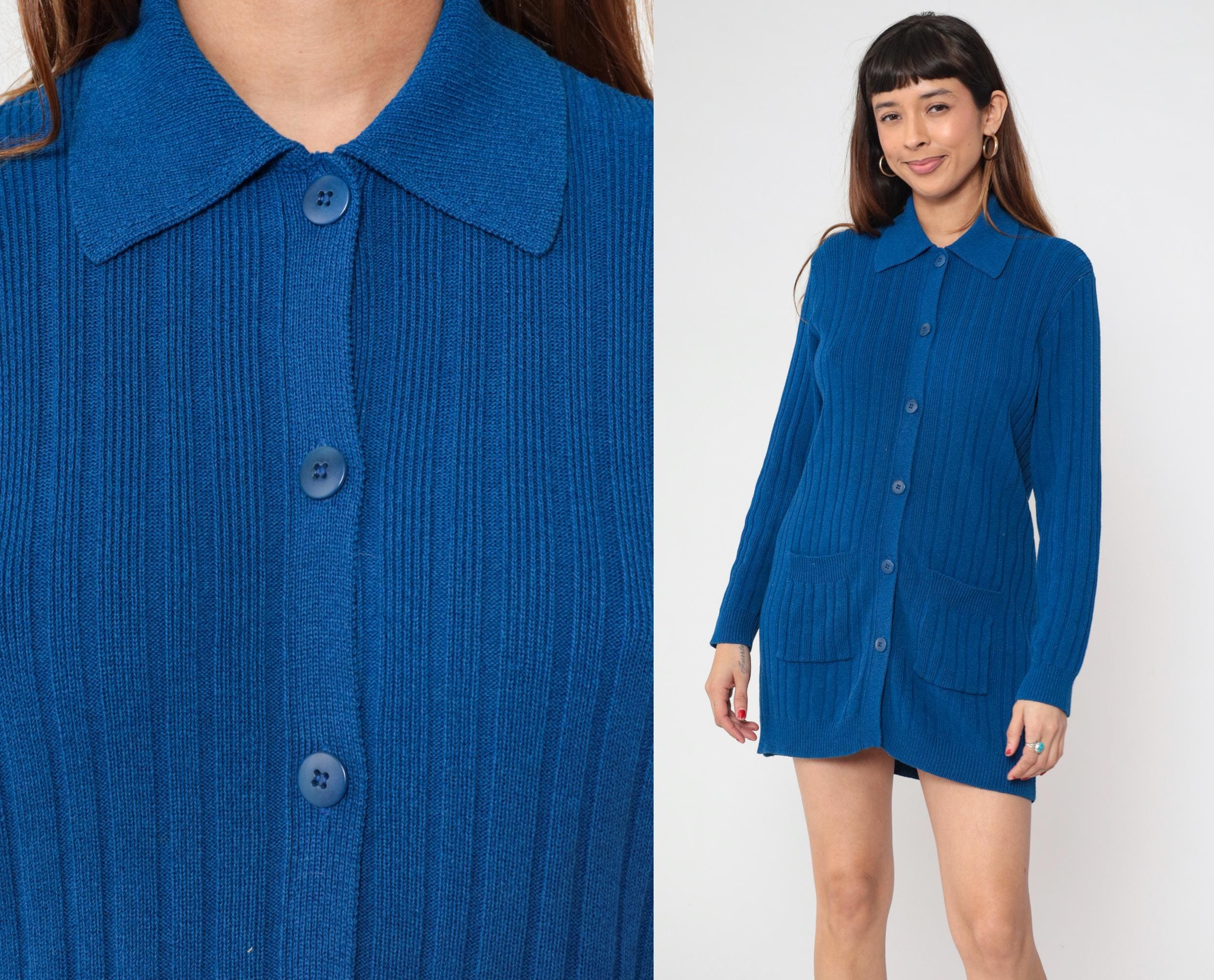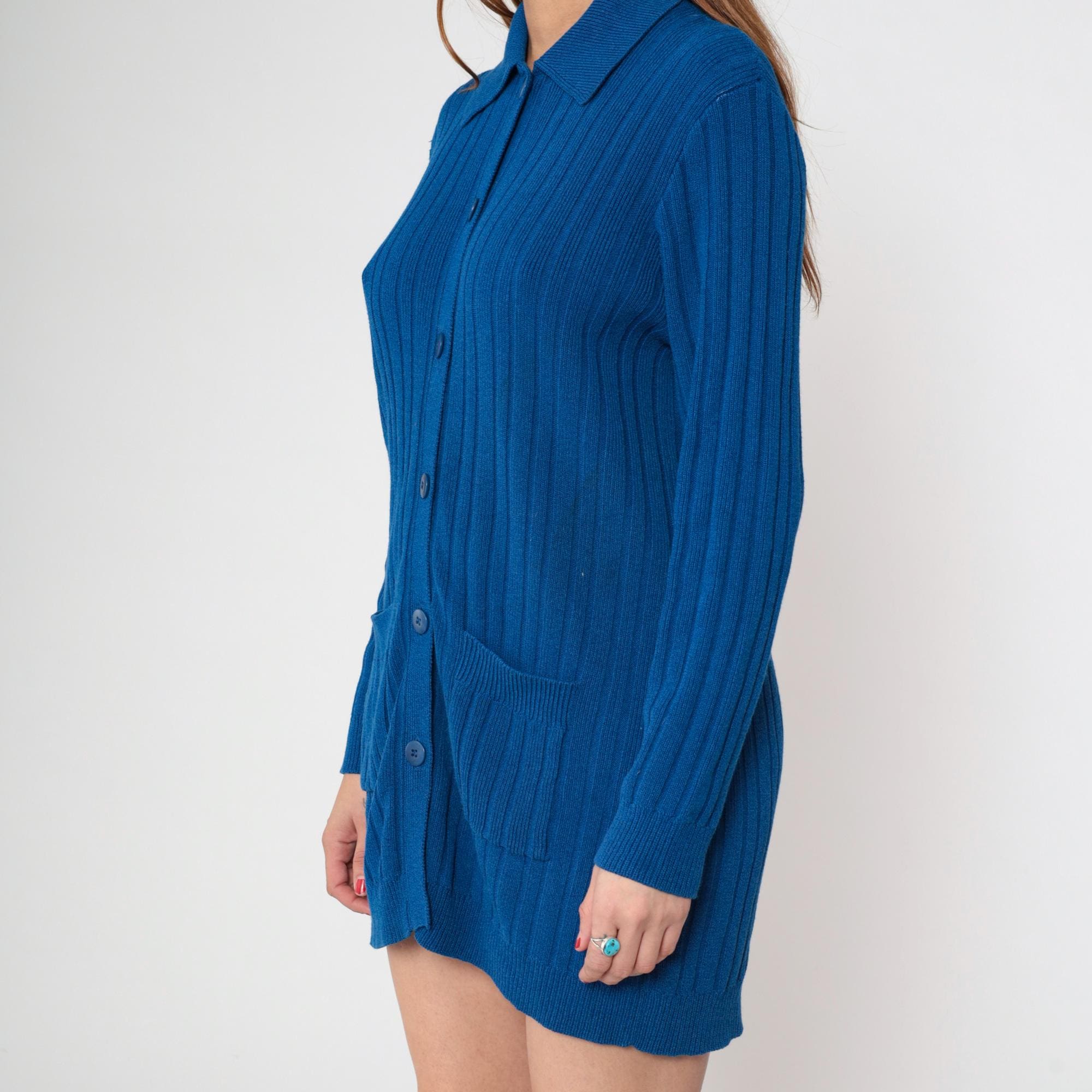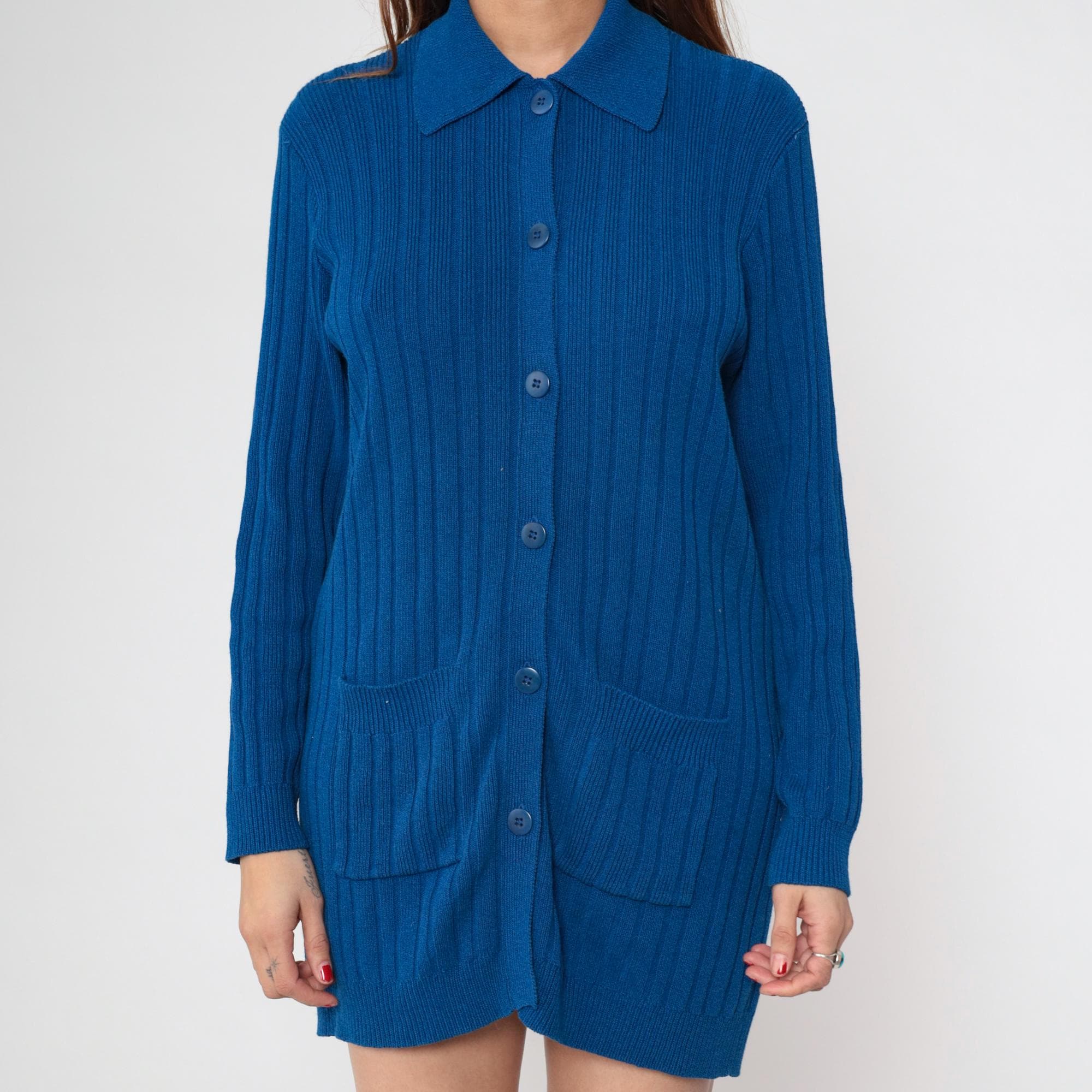 80s blue ribbed knit cardigan from Andrea Jovine with pointed collar and button front closure. Two patch pockets at hips, long sleeves, ribbed texture throughout.