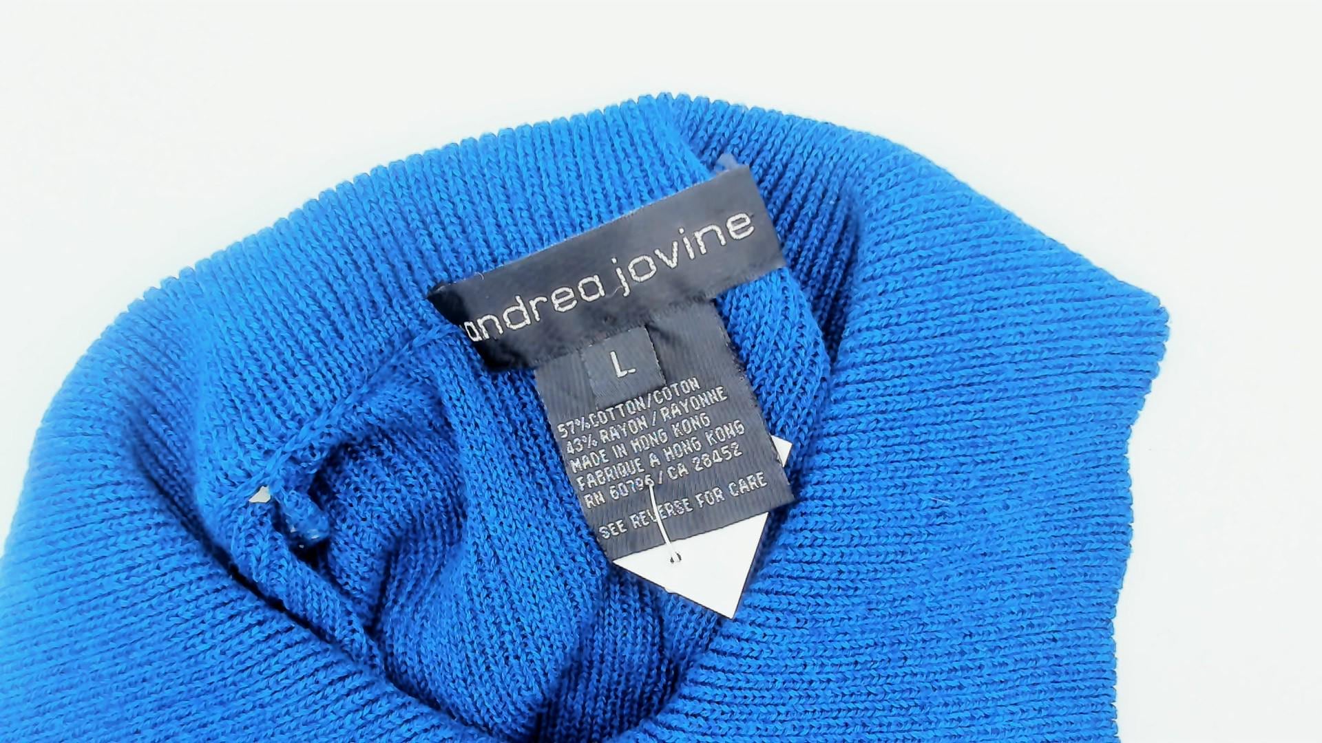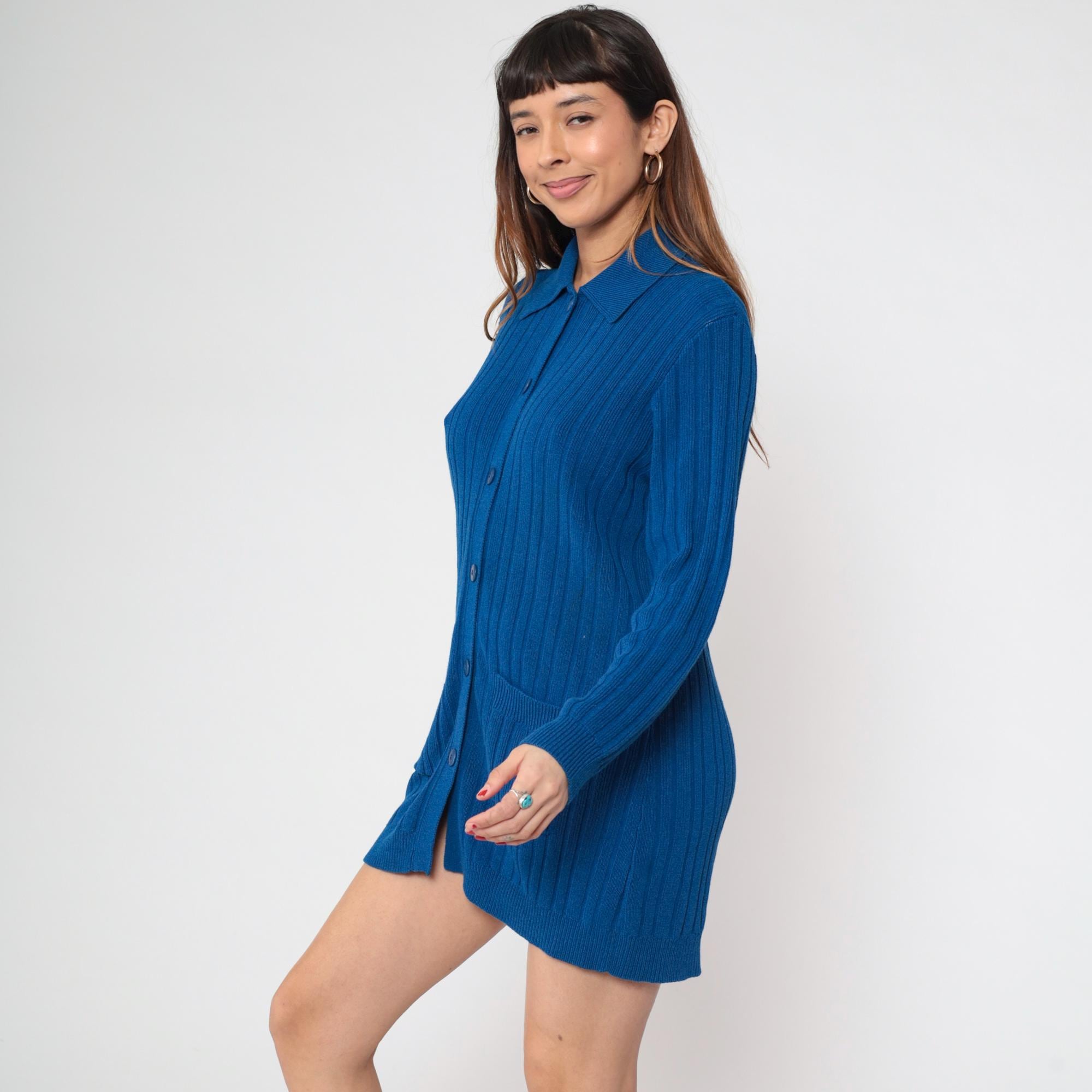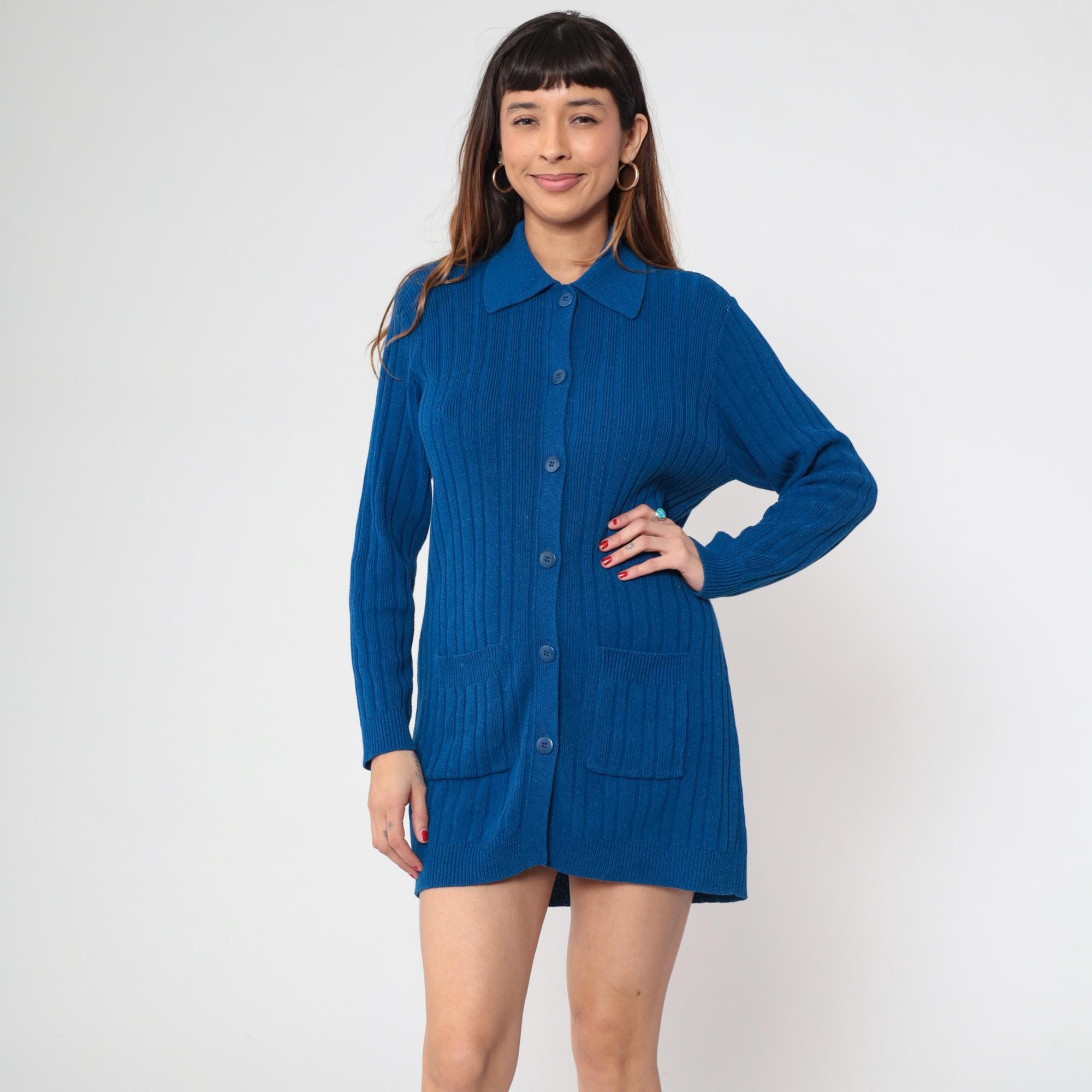 80s blue ribbed knit cardigan from Andrea Jovine with pointed collar and button front closure. Two patch pockets at hips, long sleeves, ribbed texture throughout.