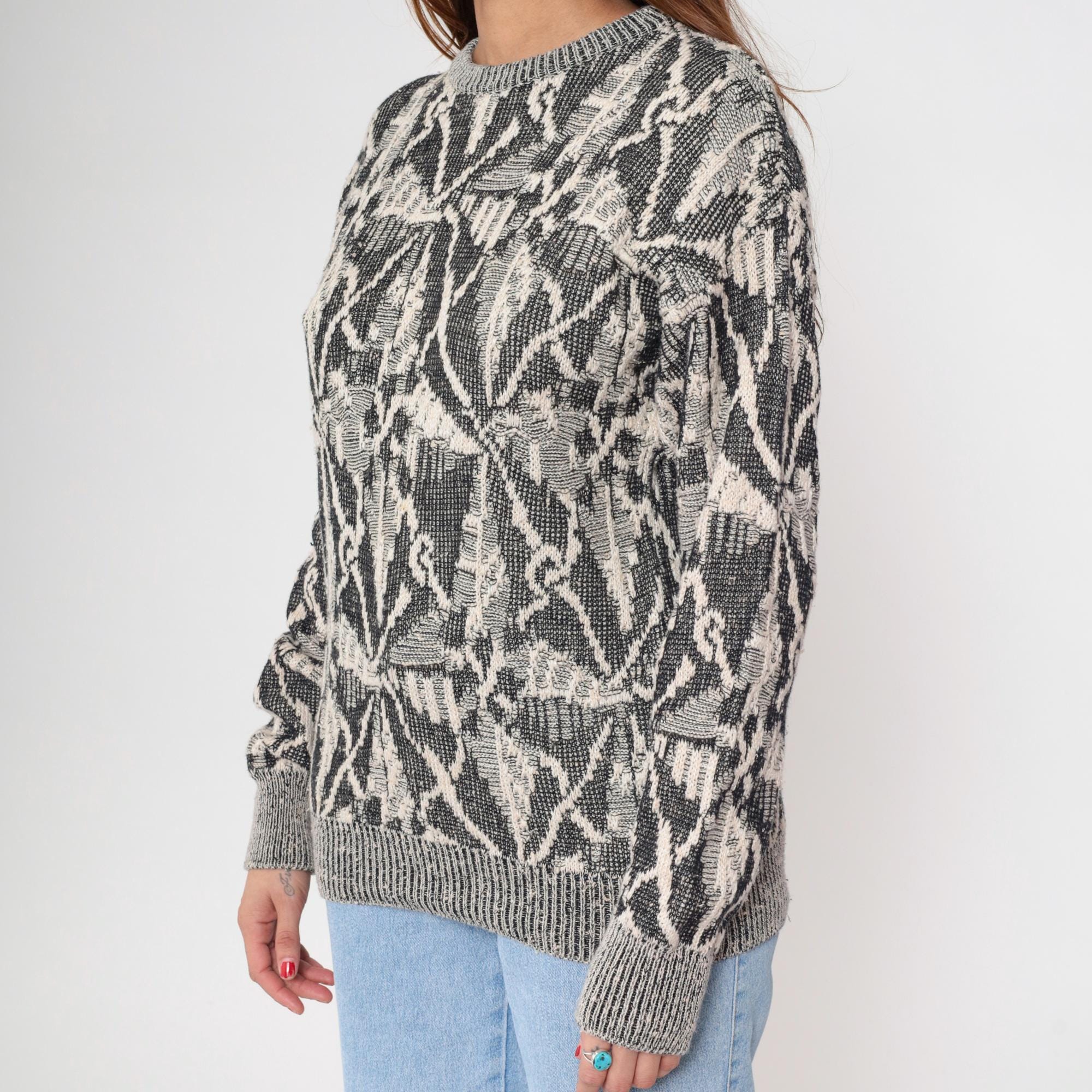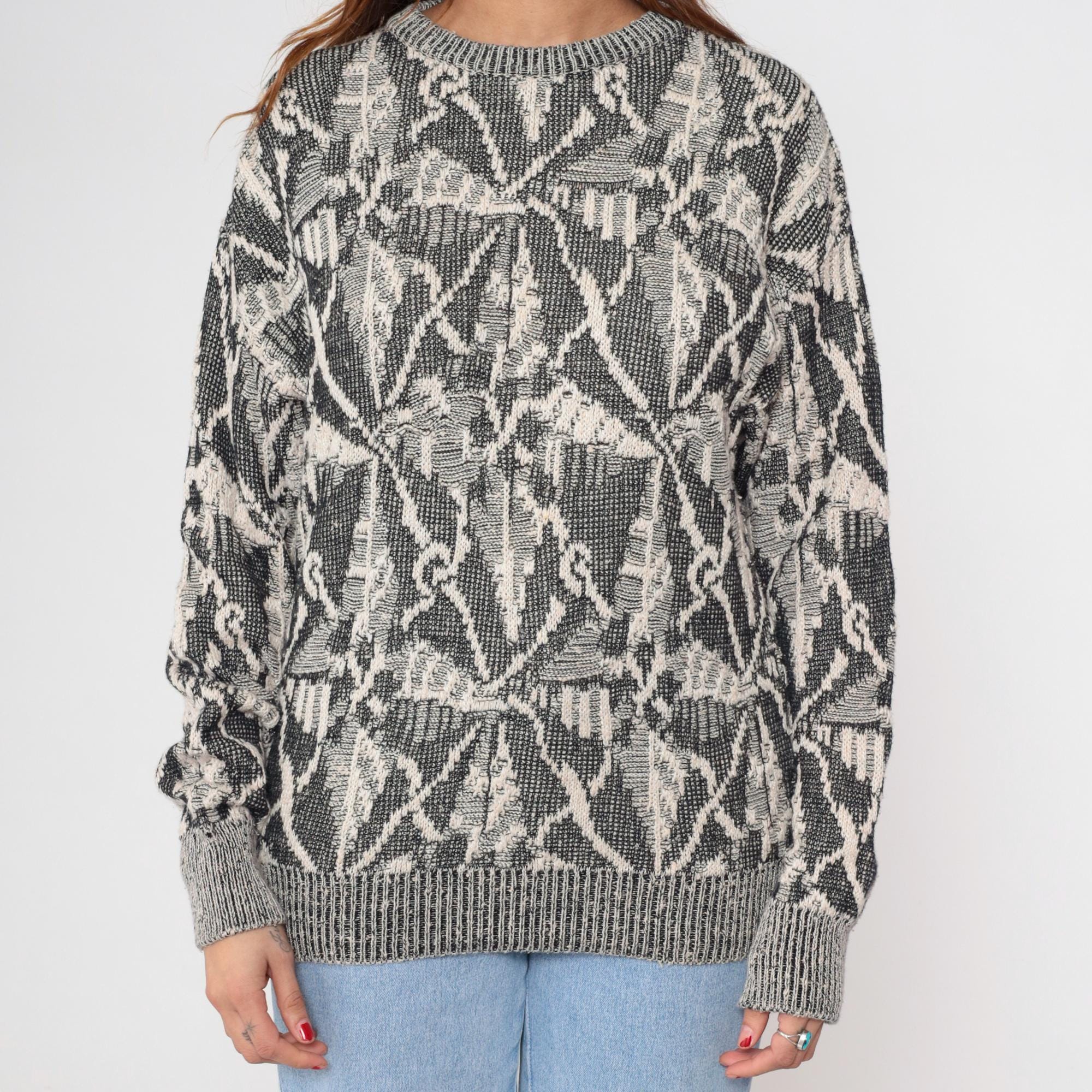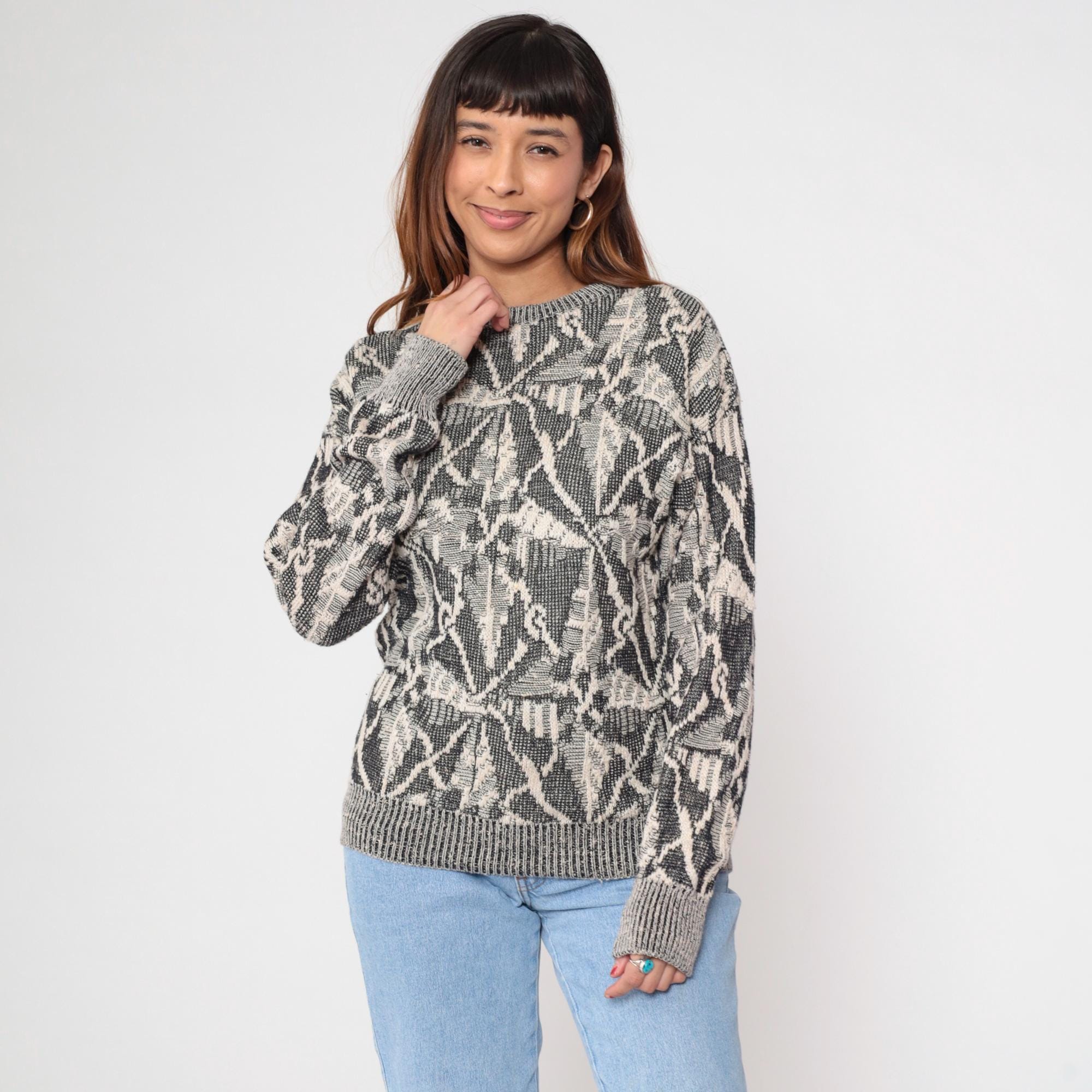 80s gray and cream knit sweater from Collezione Zenio with abstract geometric pattern throughout. Crew neckline, long sleeves with ribbed cuffs, ribbed collar and hem.