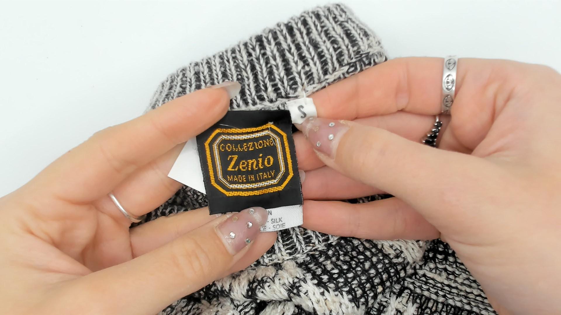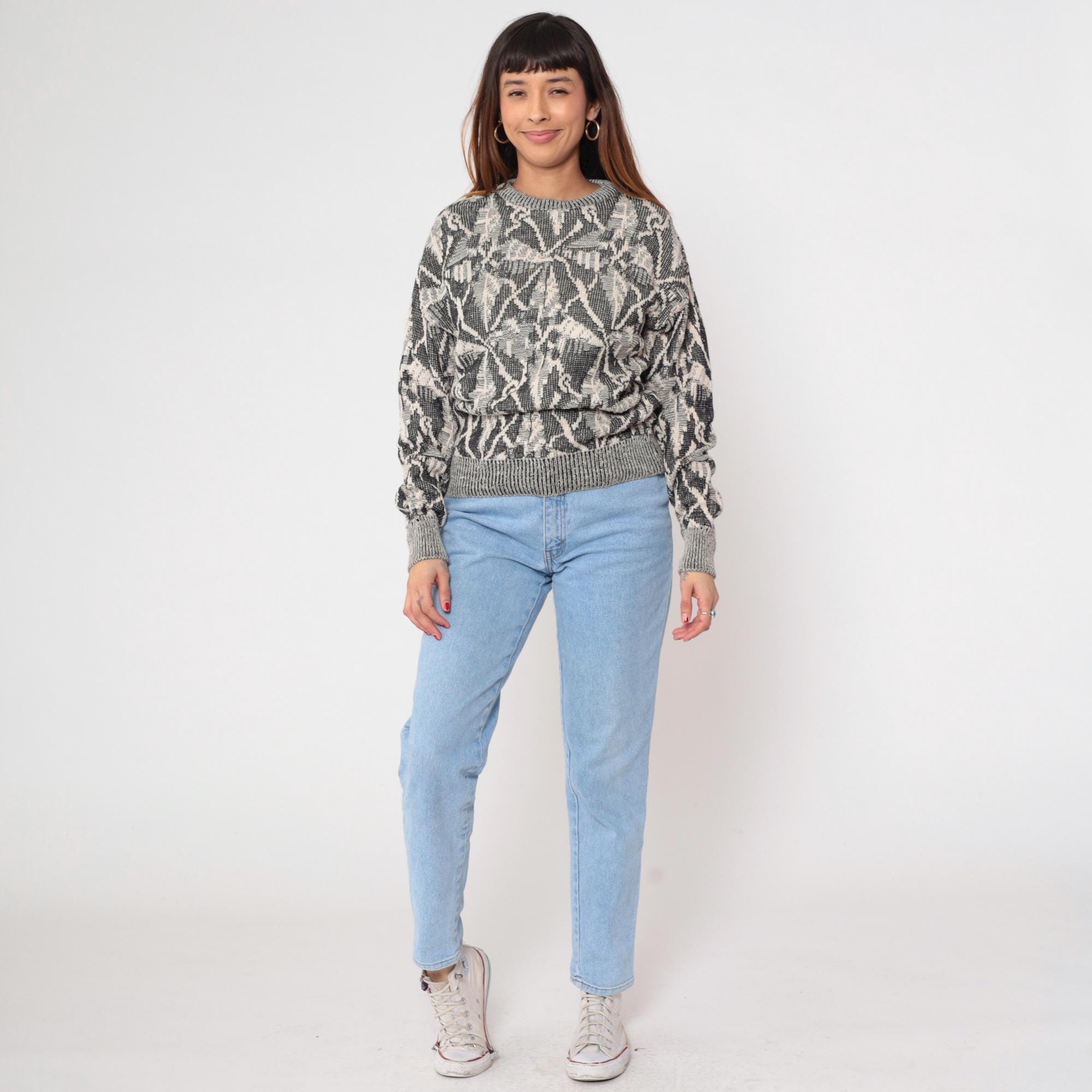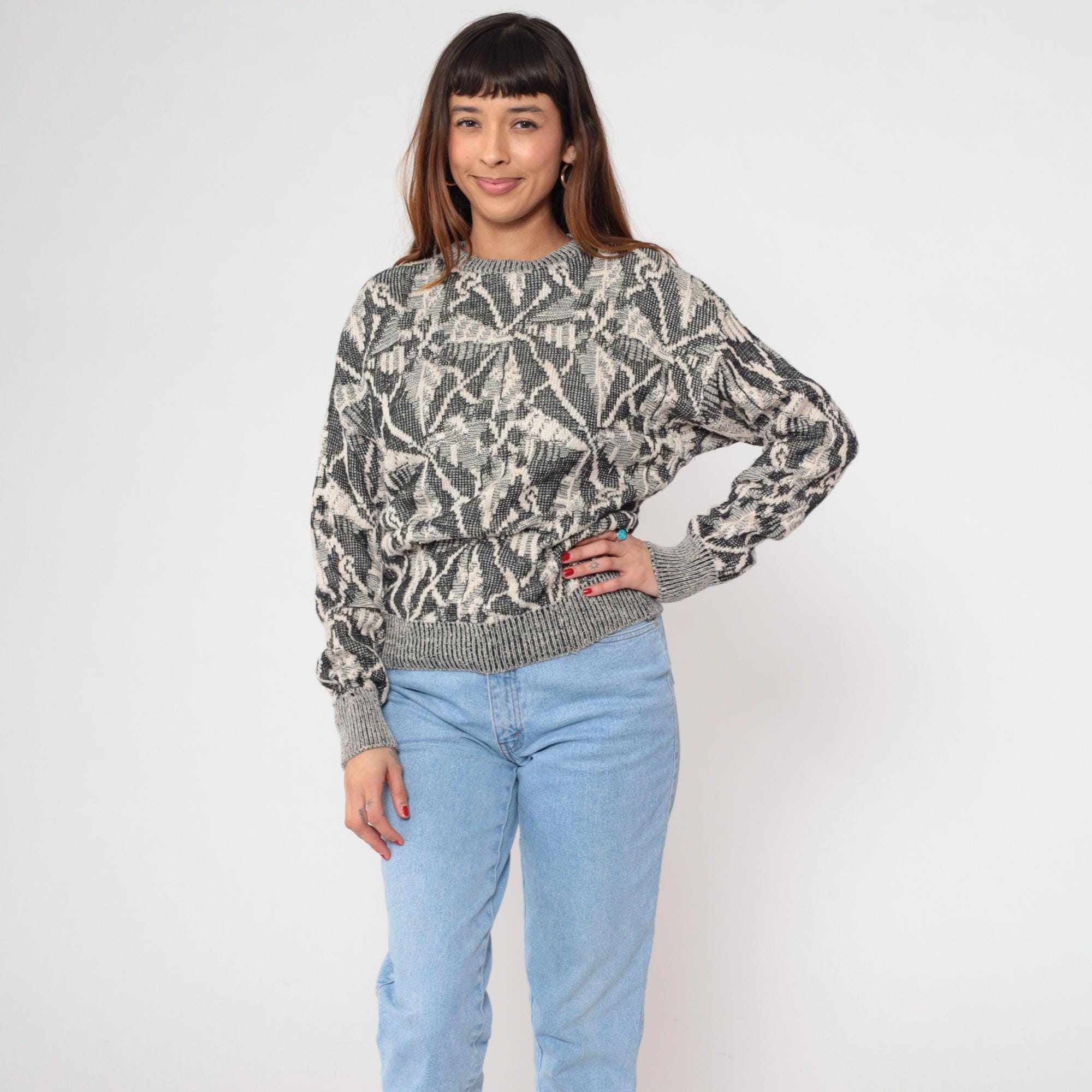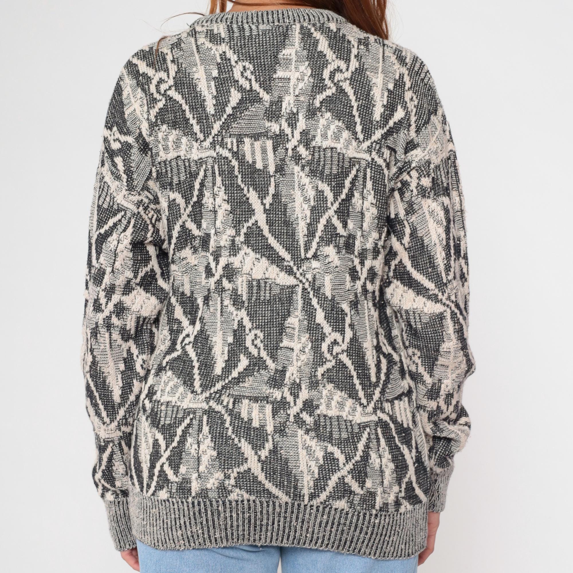 80s gray and cream knit sweater from Collezione Zenio with abstract geometric pattern throughout. Crew neckline, long sleeves with ribbed cuffs, ribbed collar and hem.