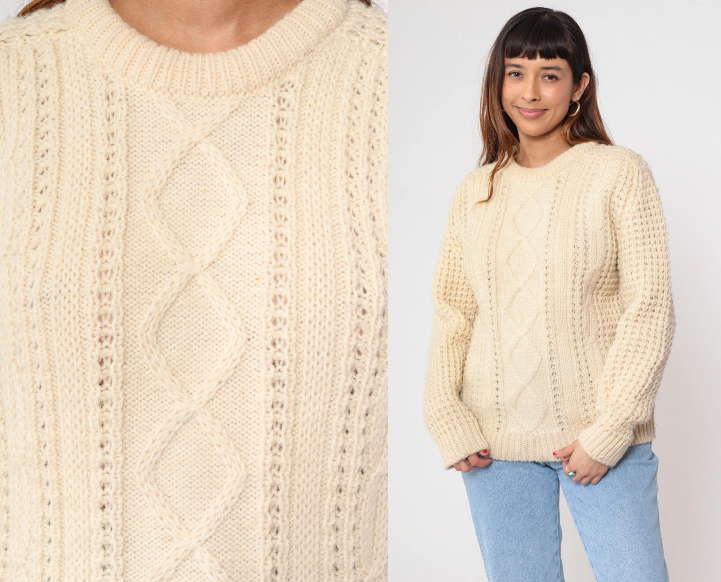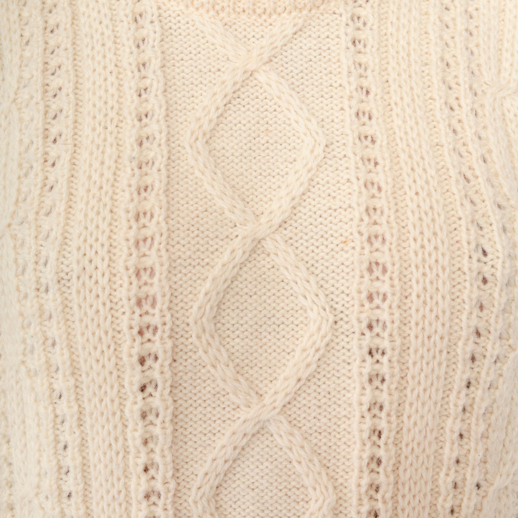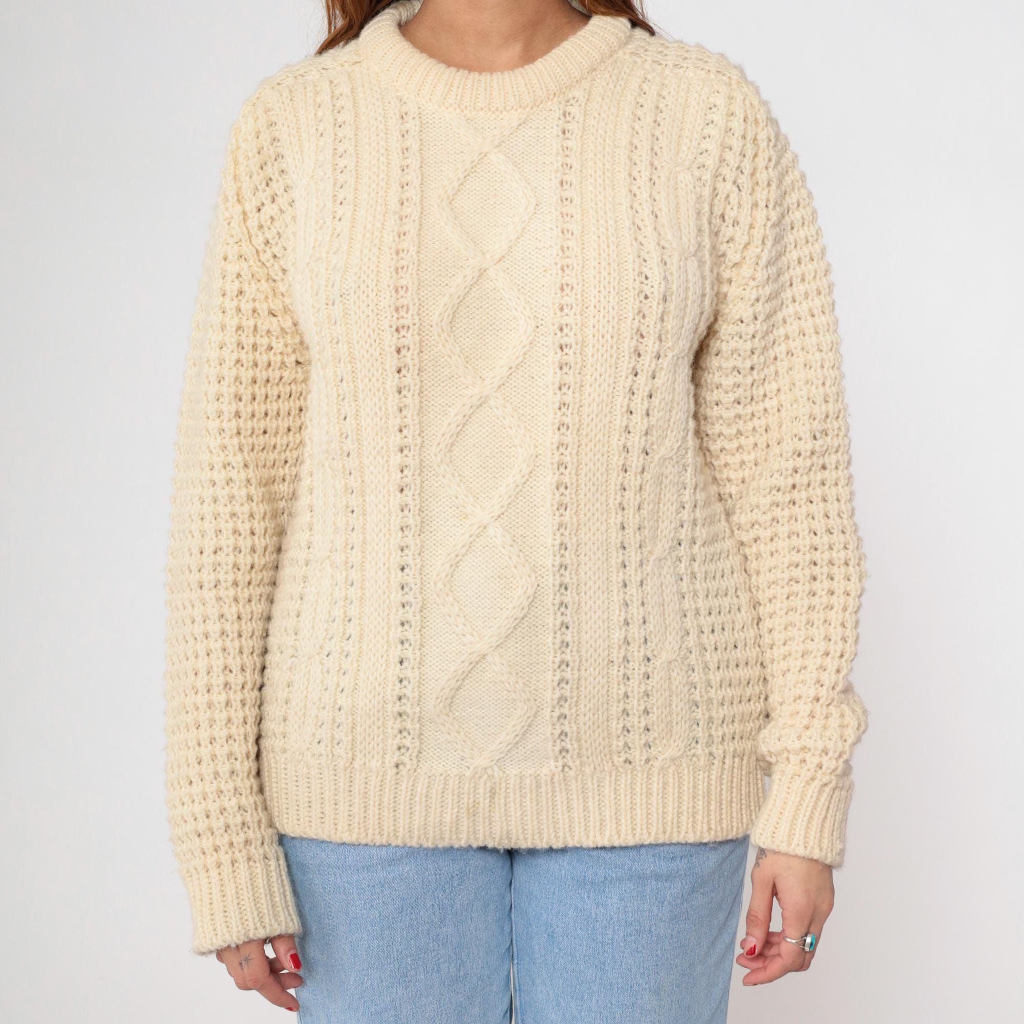 80s cream cable knit sweater from Falcarragh with traditional Aran-style pattern down center front and back panels. Honeycomb stitch on sleeves, crew neckline with ribbed collar, ribbed cuffs and hem.