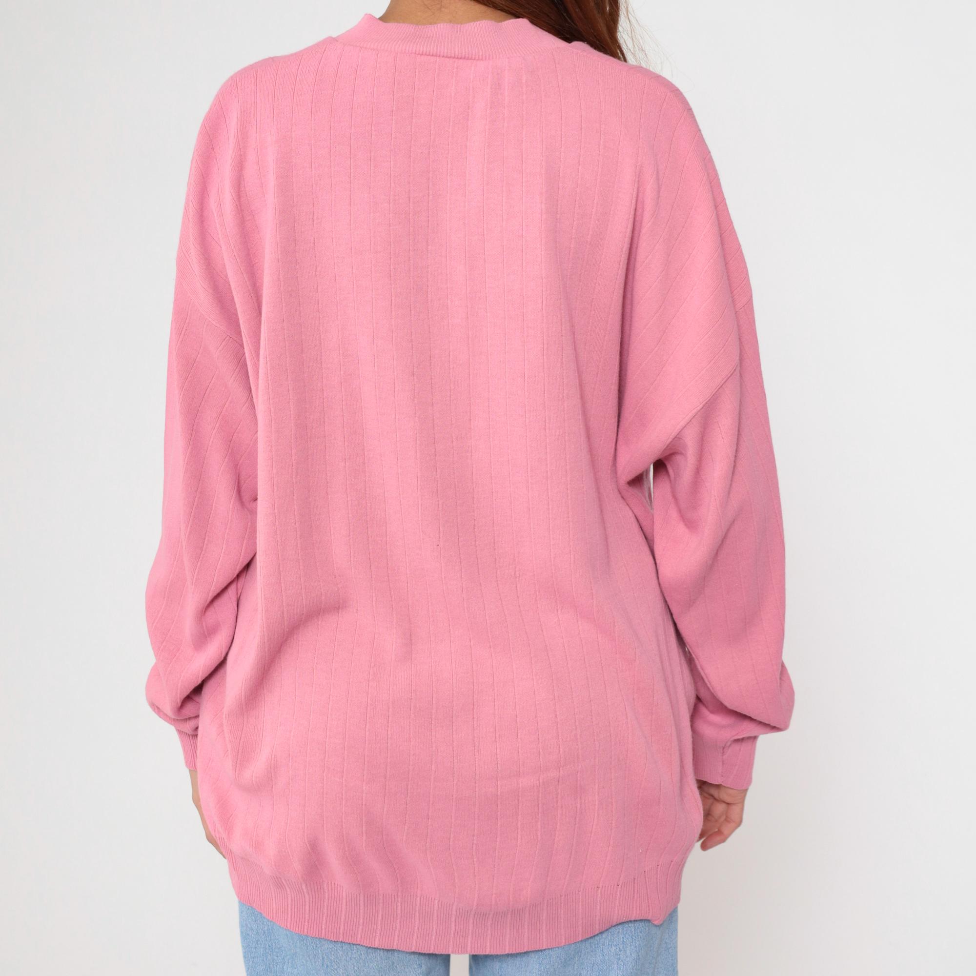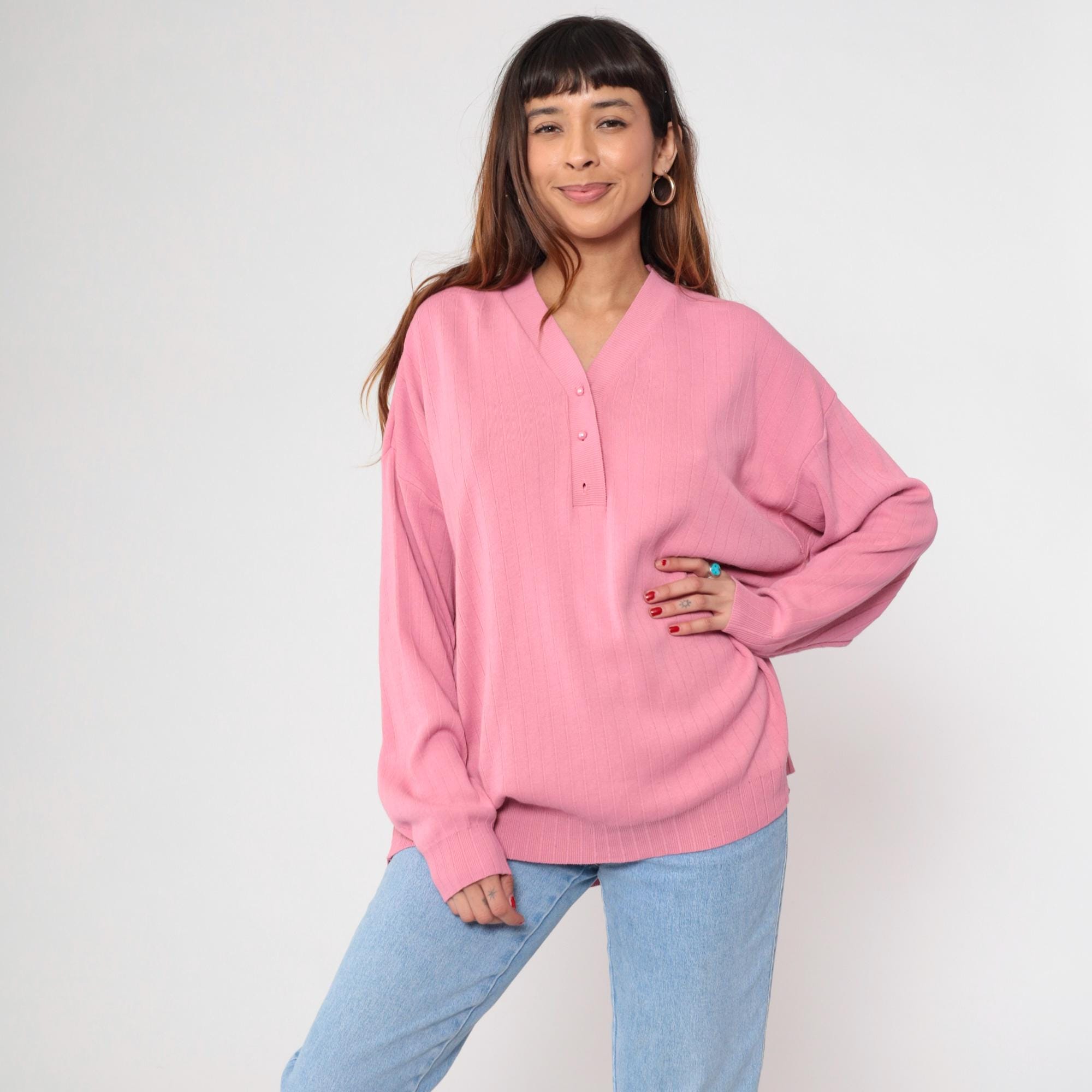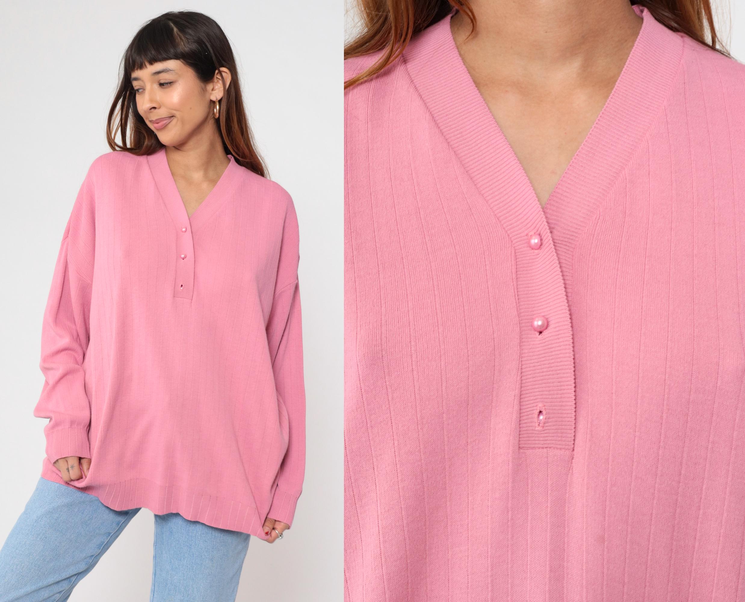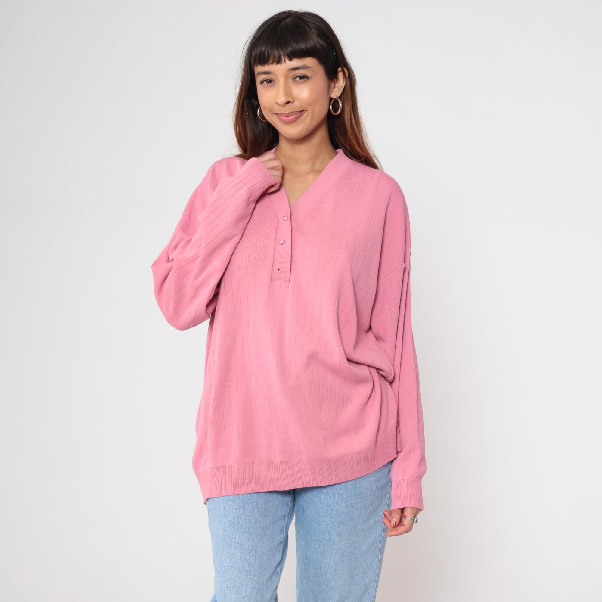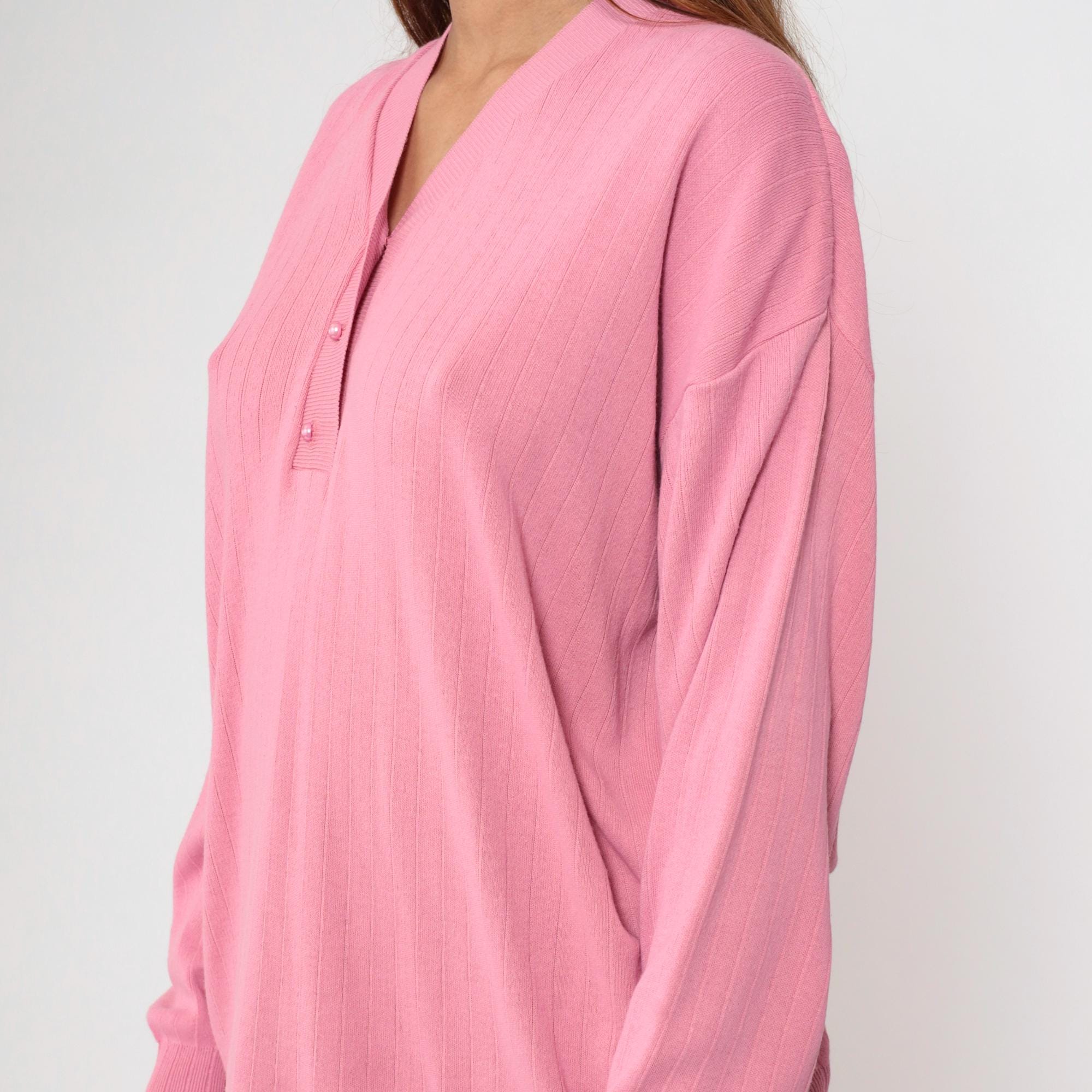 90s pink ribbed knit sweater from Village Fair with V-neck and partial button placket closure. Relaxed fit with long sleeves, ribbed cuffs, ribbed collar, and ribbed hem. Vertical ribbed texture throughout.