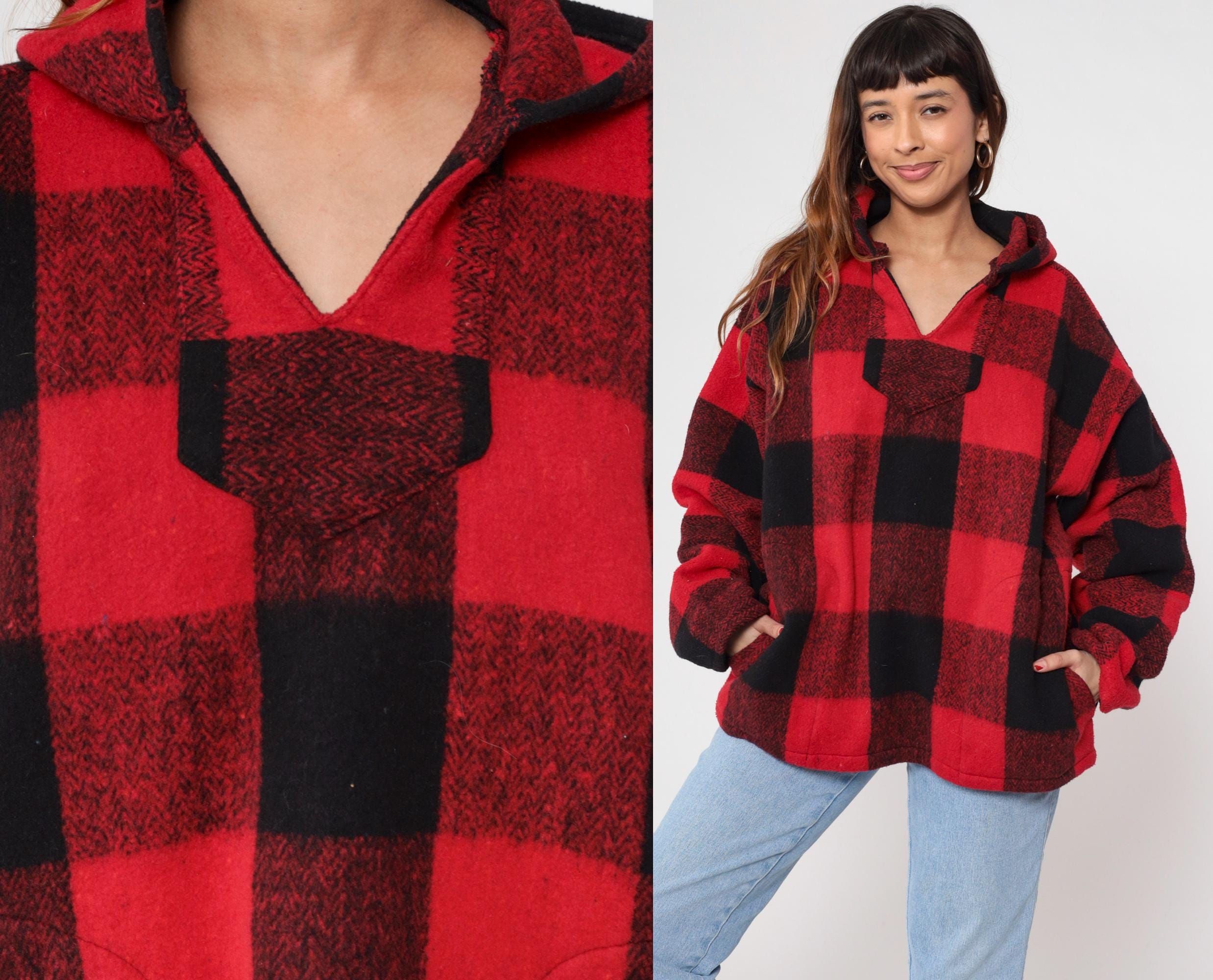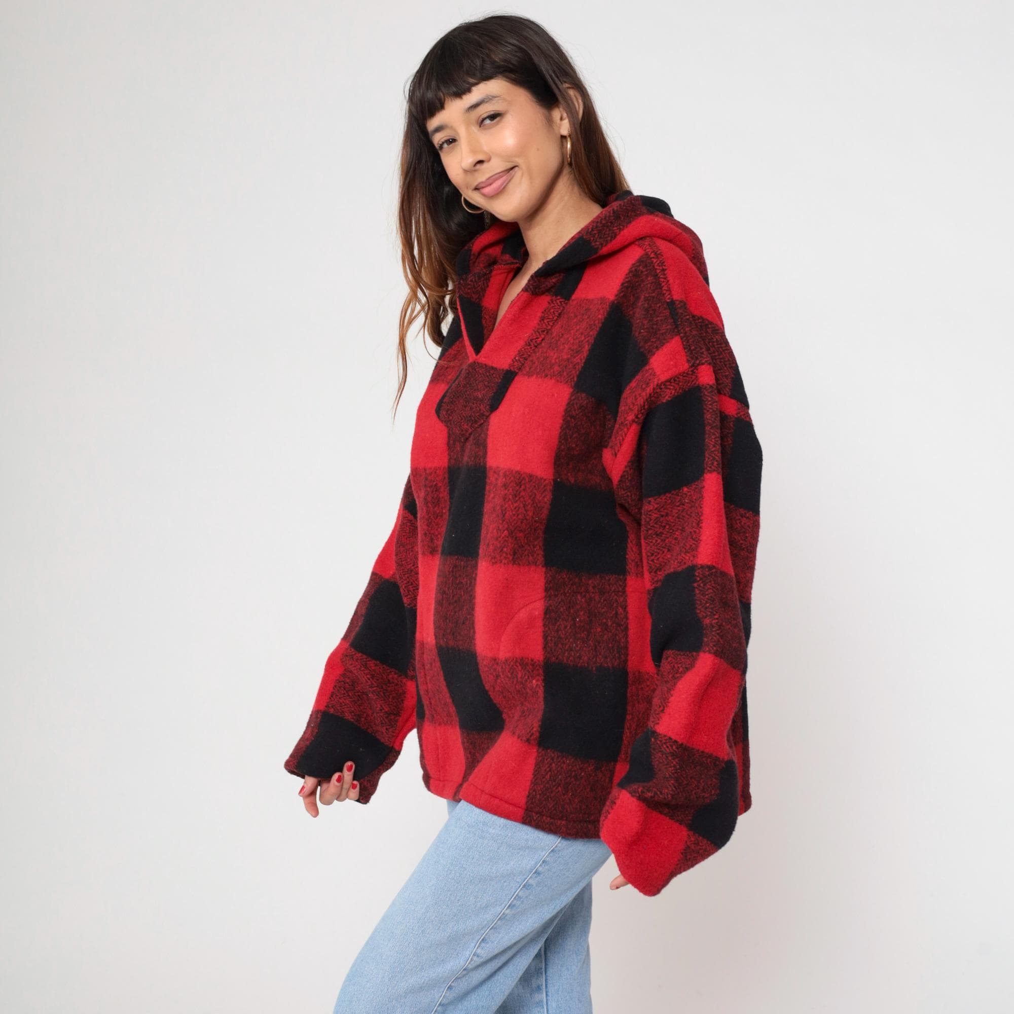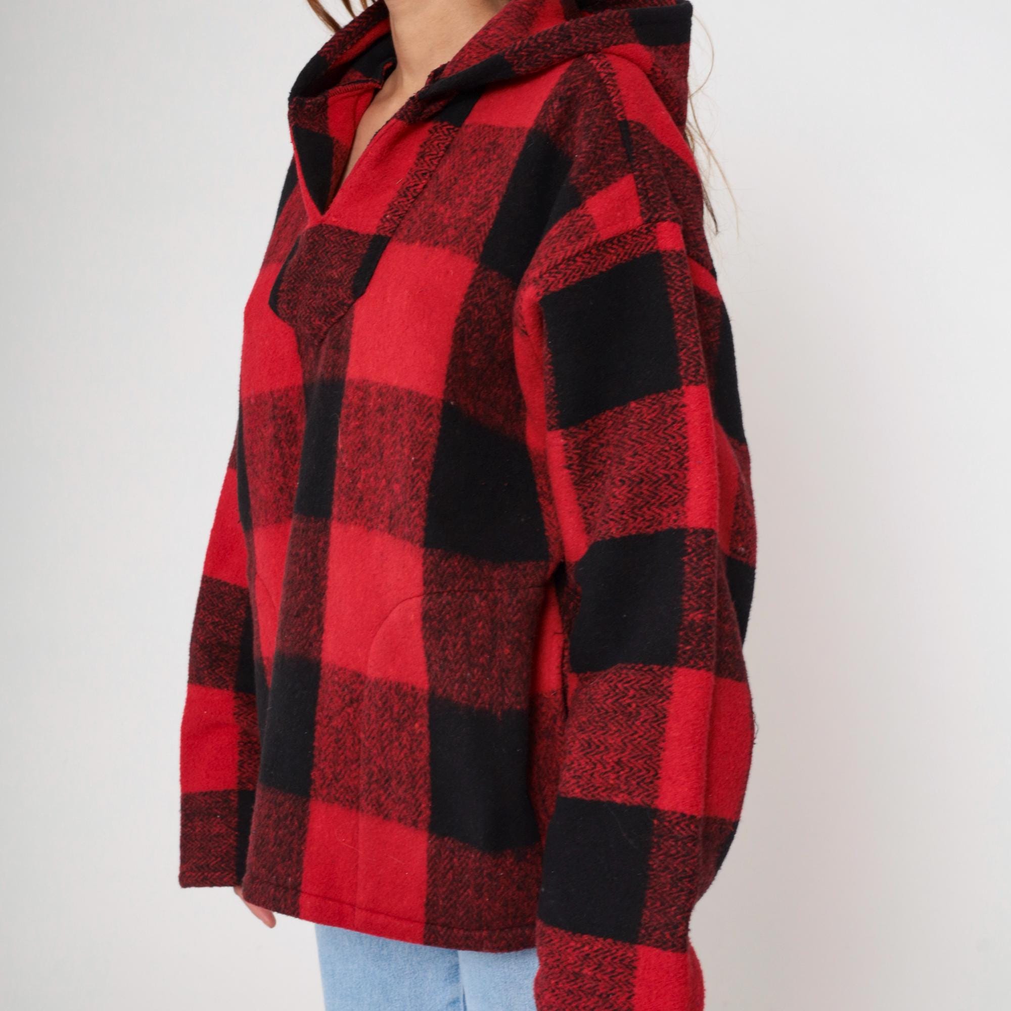 90s red and black buffalo plaid hooded pullover from Earth Ragz with half-zip front closure and single chest pocket. Relaxed fit with long sleeves and attached hood.