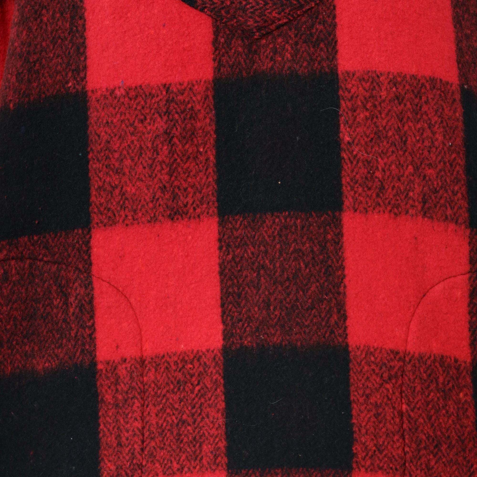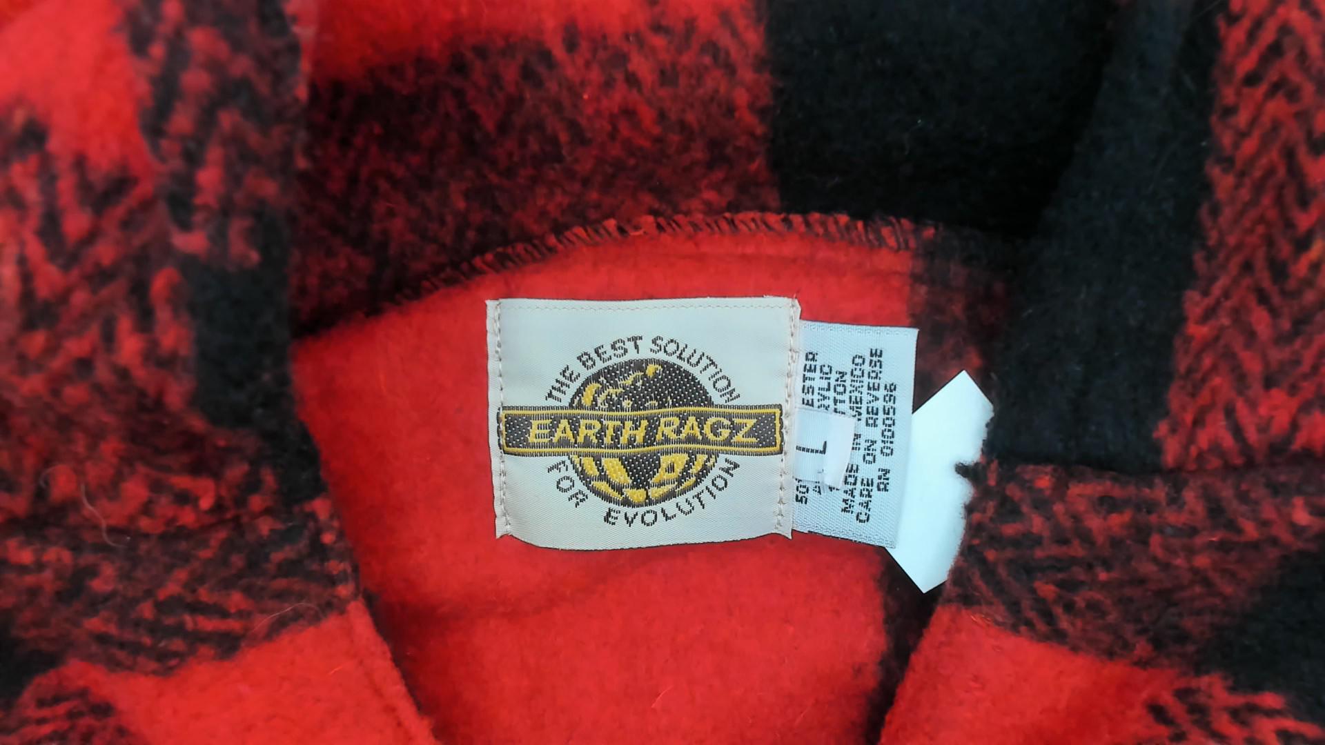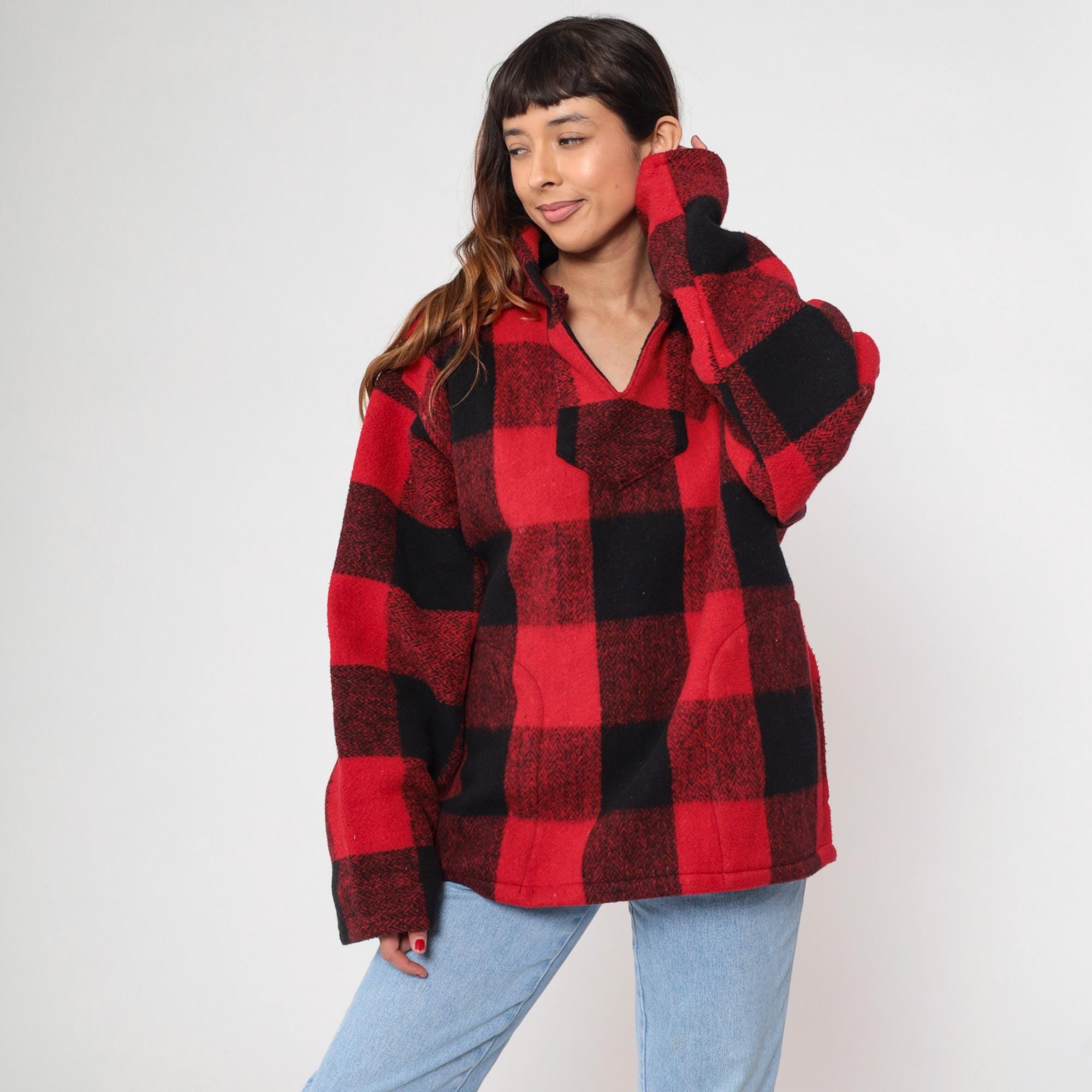 90s red and black buffalo plaid hooded pullover from Earth Ragz with half-zip front closure and single chest pocket. Relaxed fit with long sleeves and attached hood.