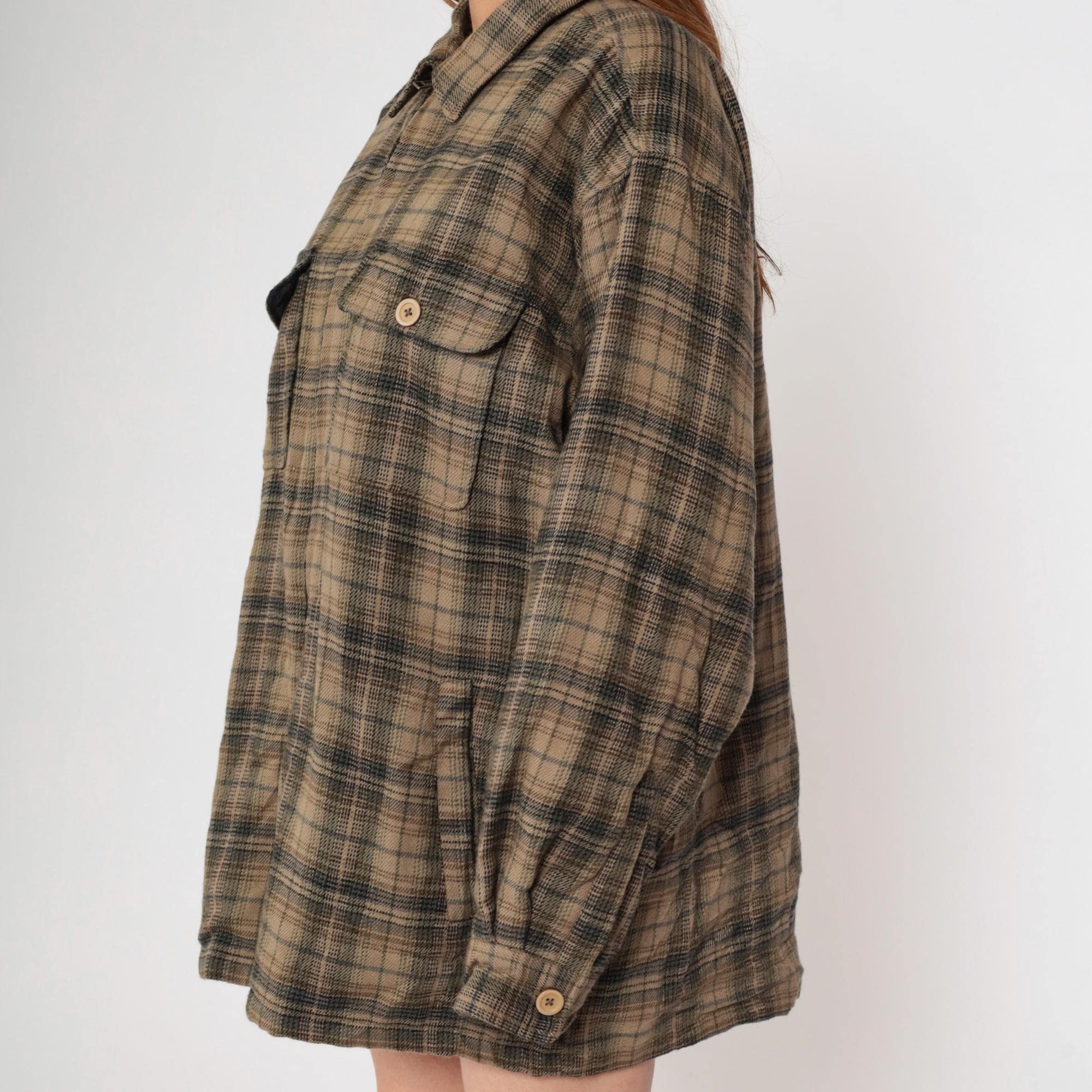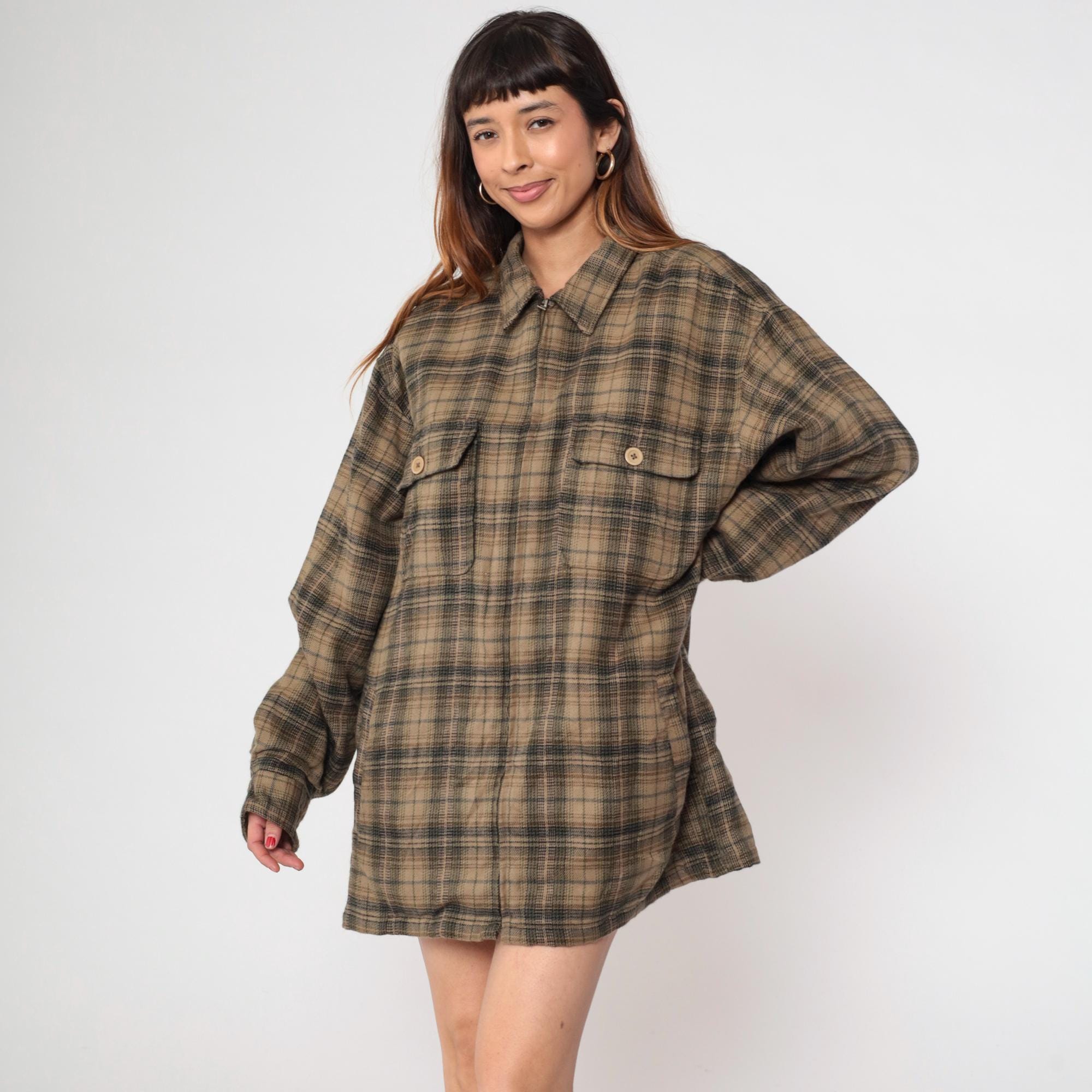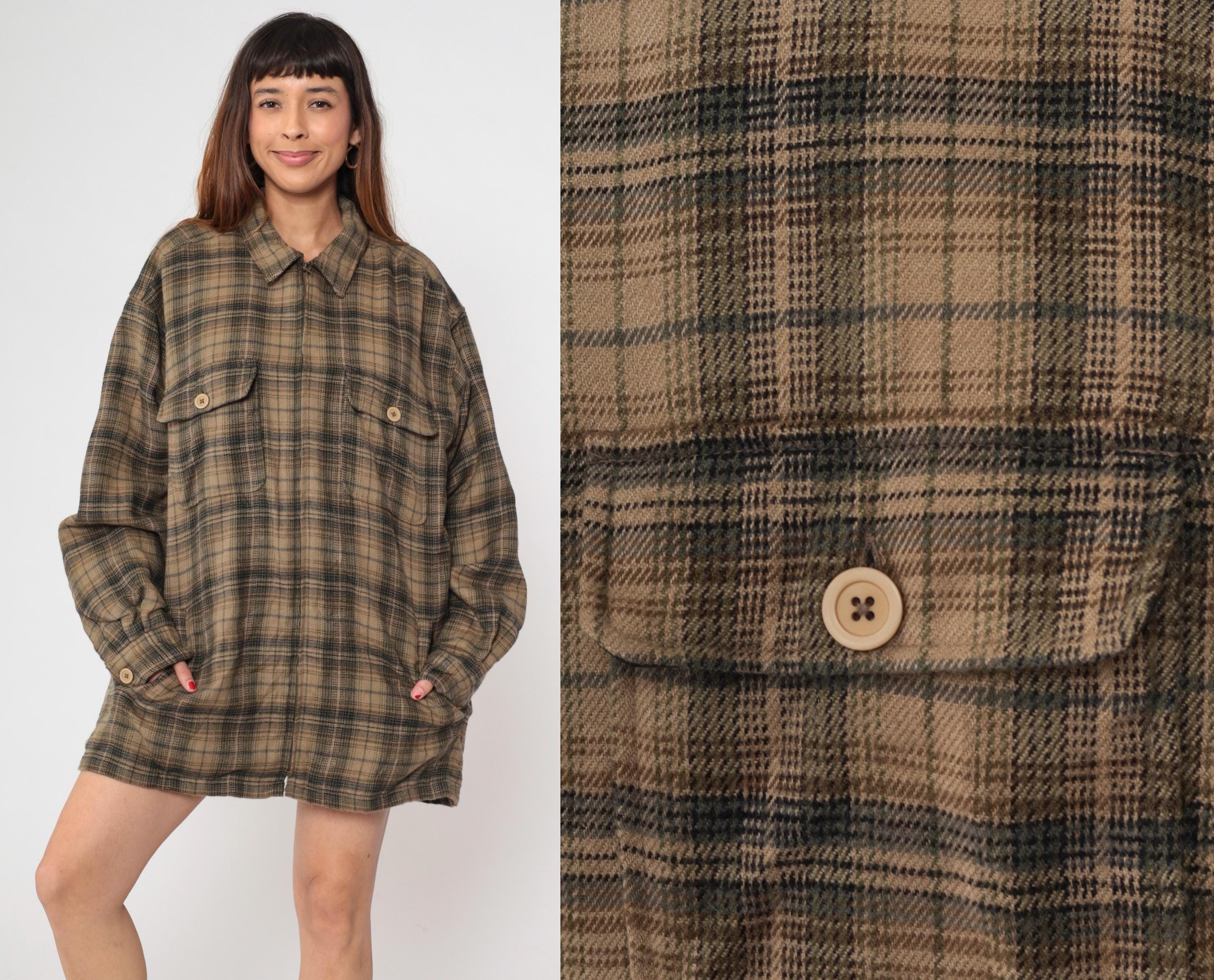 Y2K brown and green plaid shirt from Shaver Lake with pointed collar, long sleeves, and two chest pockets with button flaps.