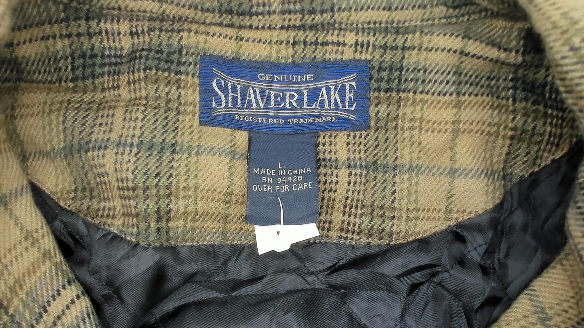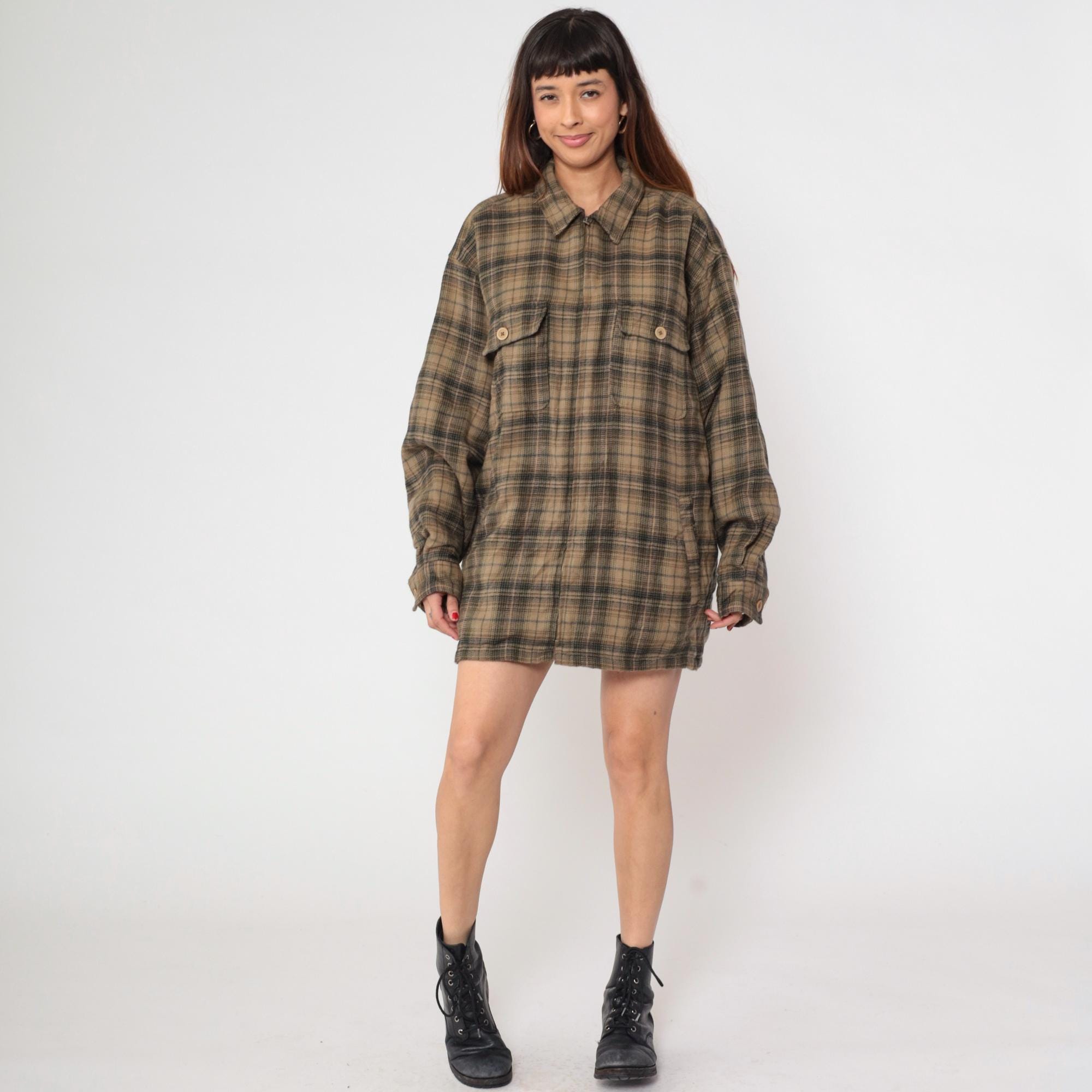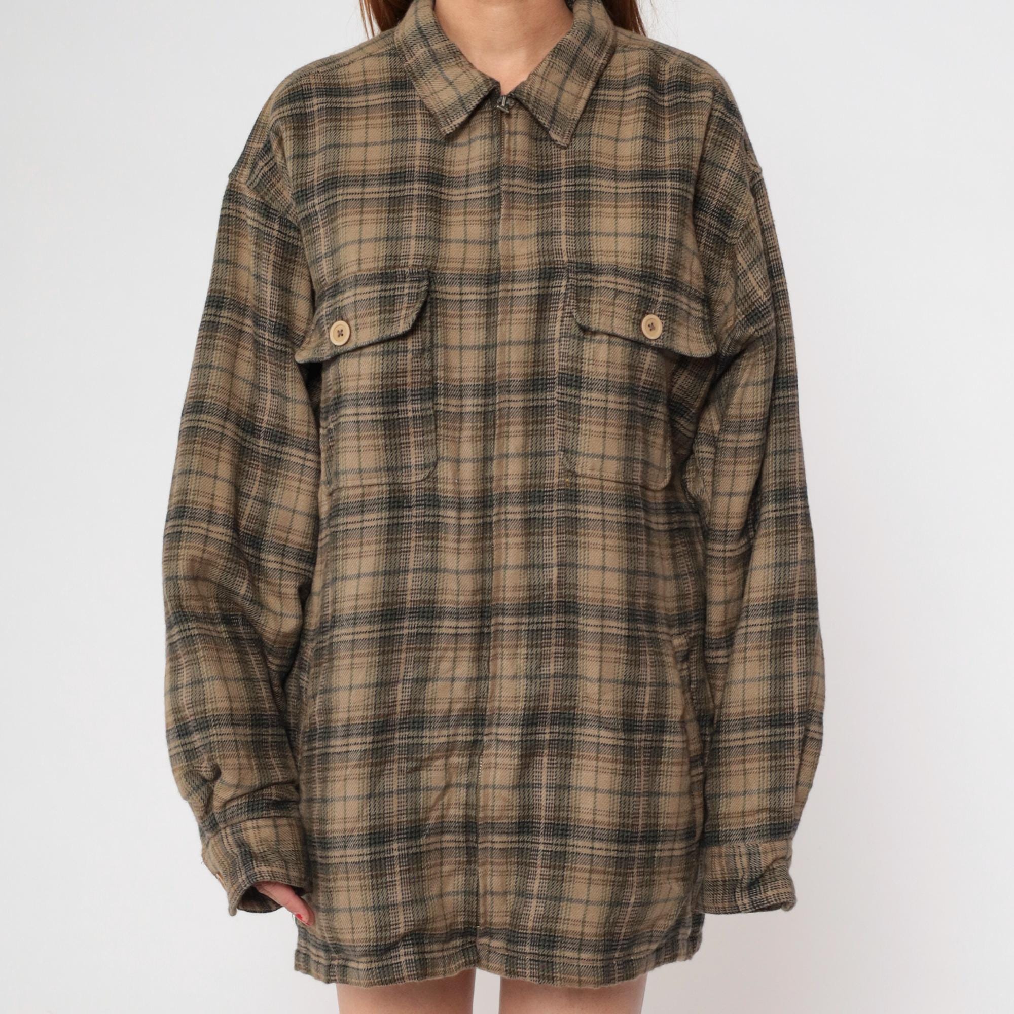 Y2K brown and green plaid shirt from Shaver Lake with pointed collar, long sleeves, and two chest pockets with button flaps.