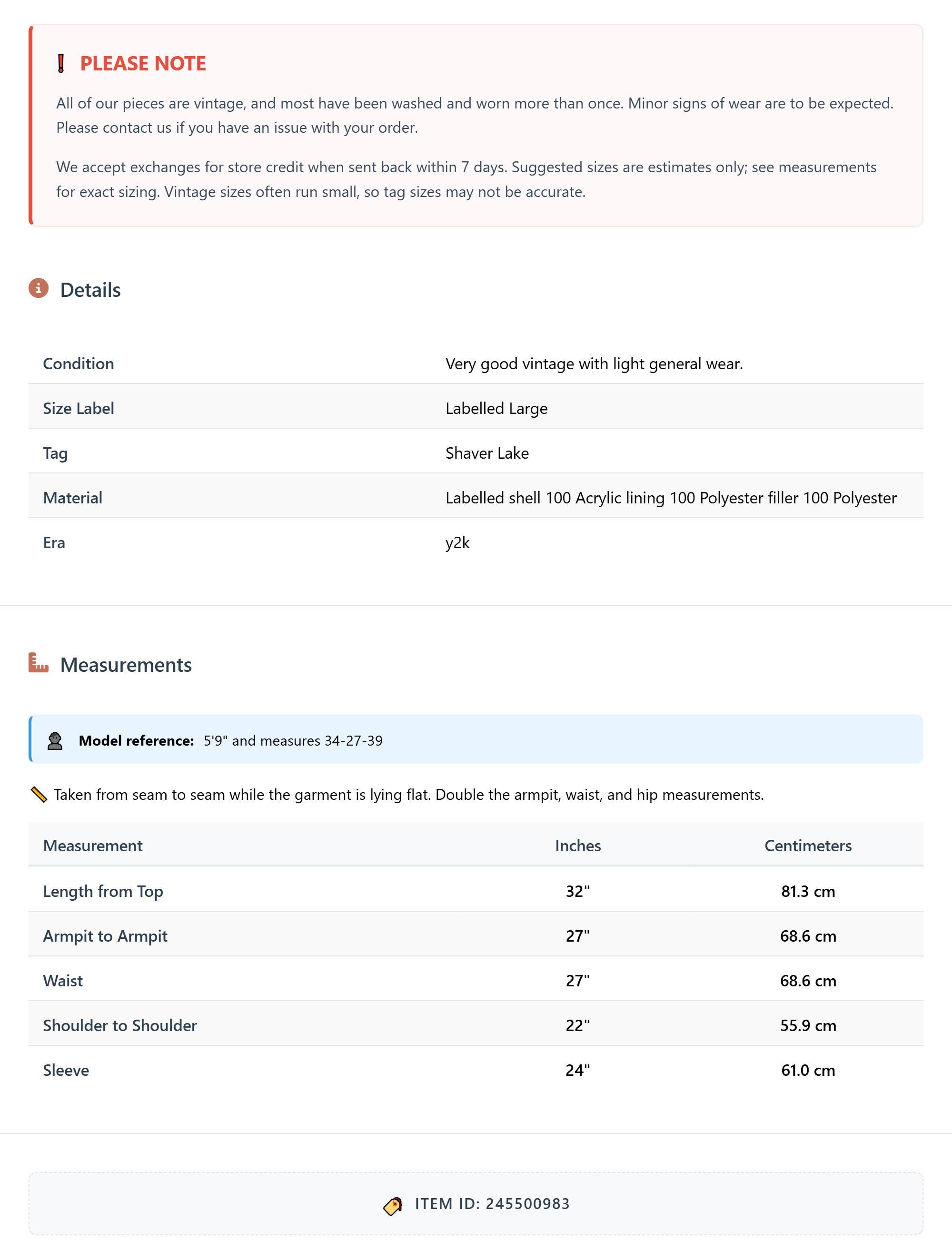 All of our pieces are vintage, and most have been washed and worn more than once. Minor signs of wear are to be expected. Please contact us if you have an issue with your order. We accept exchanges for store credit when sent back within 7 days.