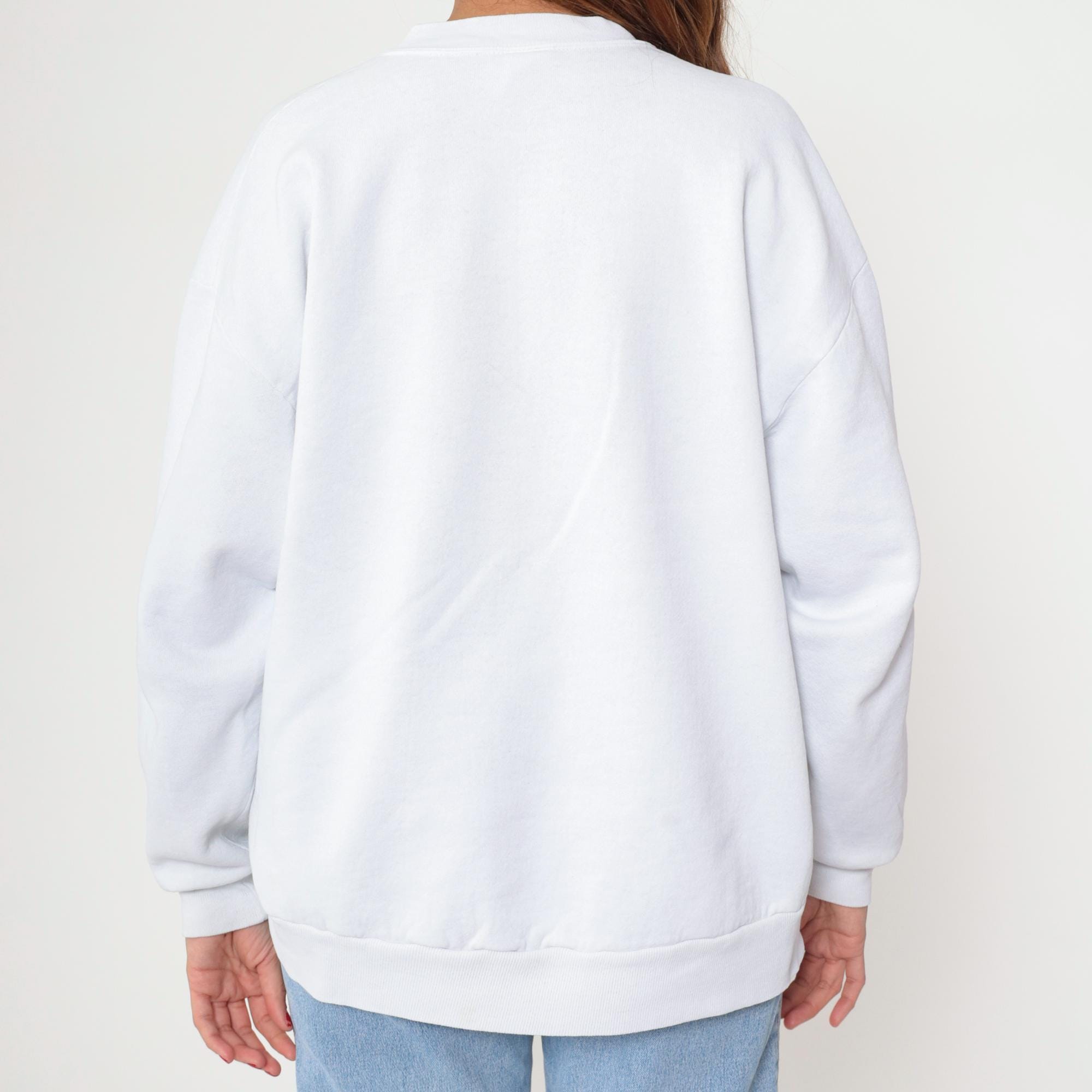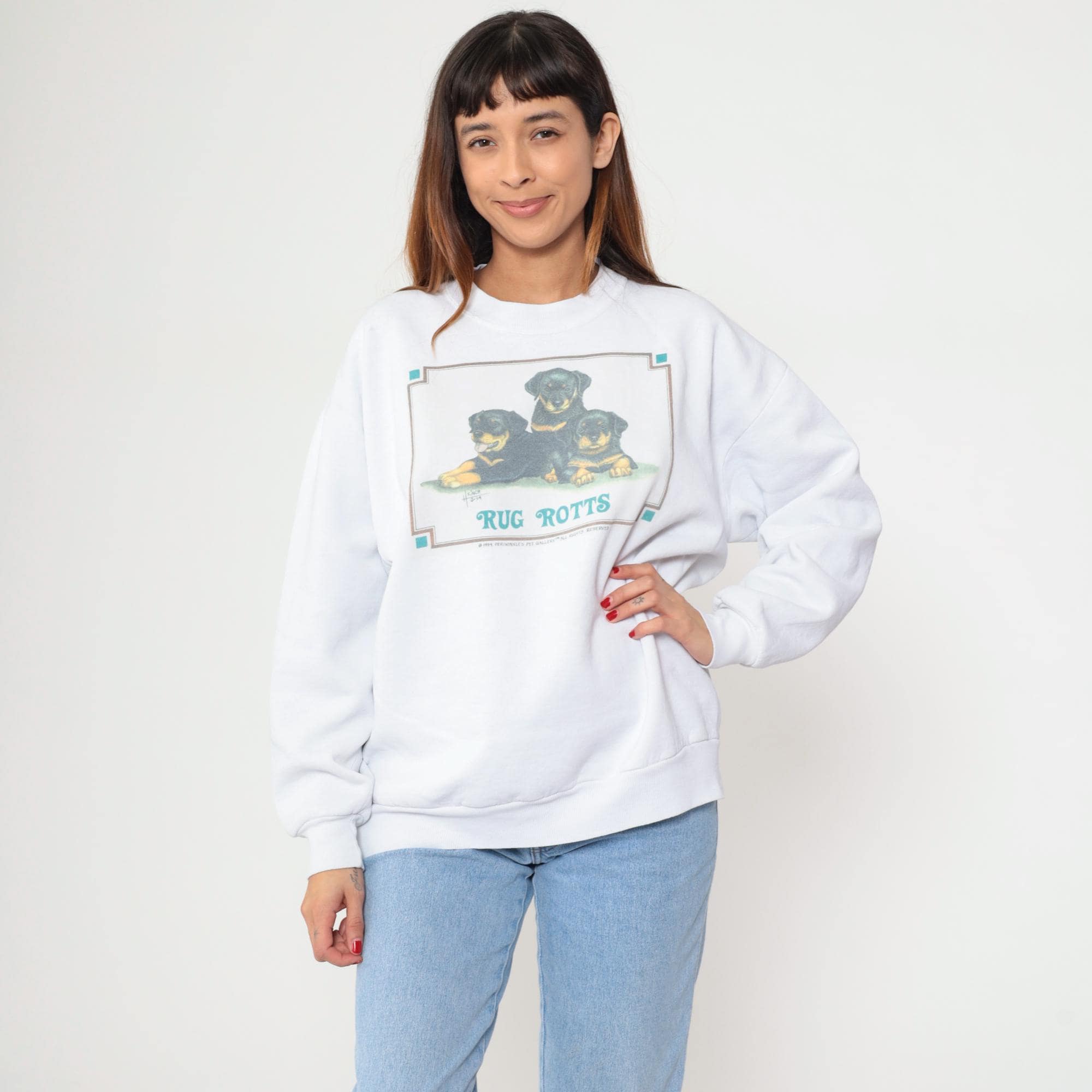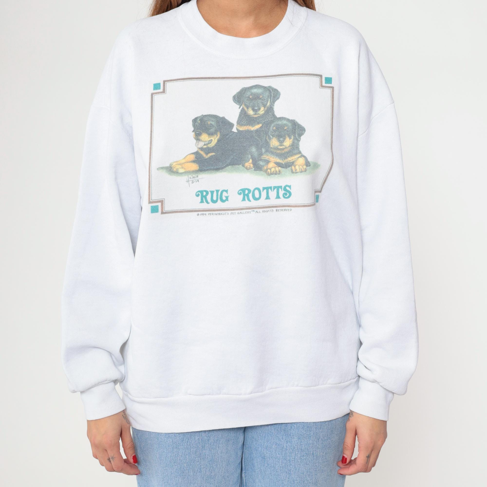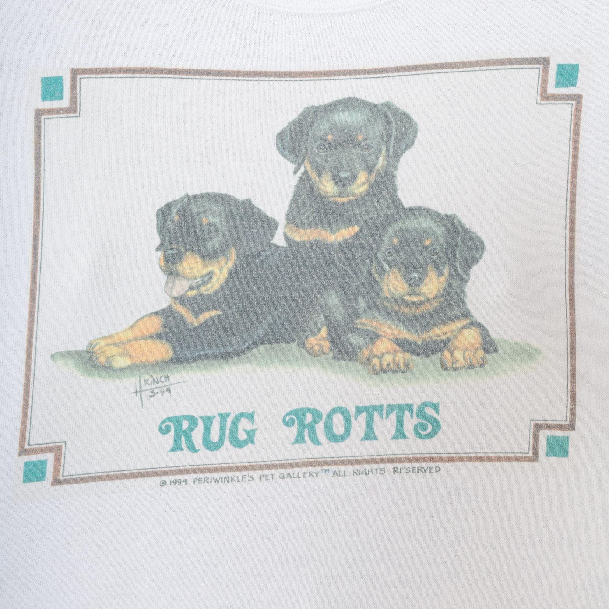 White 90s sweatshirt with large centered graphic of three Rottweiler puppies in a decorative teal and tan border frame, text reading "Rug Rotts" below the illustration. Copyright 1994 Periwinkle's Pet Gallery printed on front. Crew neckline, long sleeves with ribbed cuffs, ribbed hem.