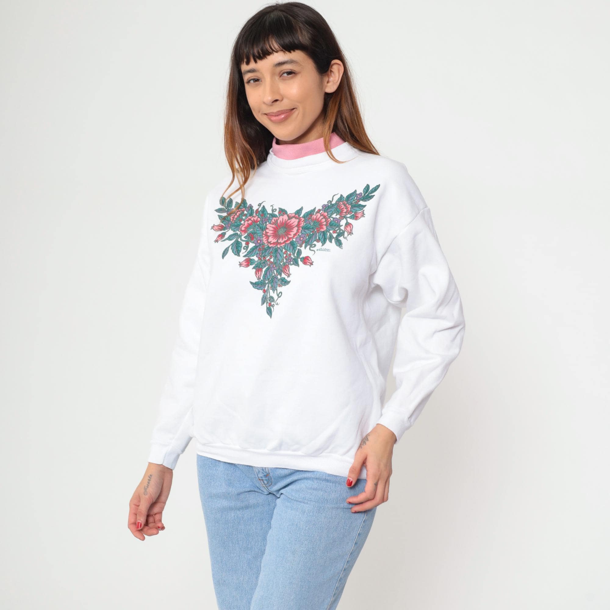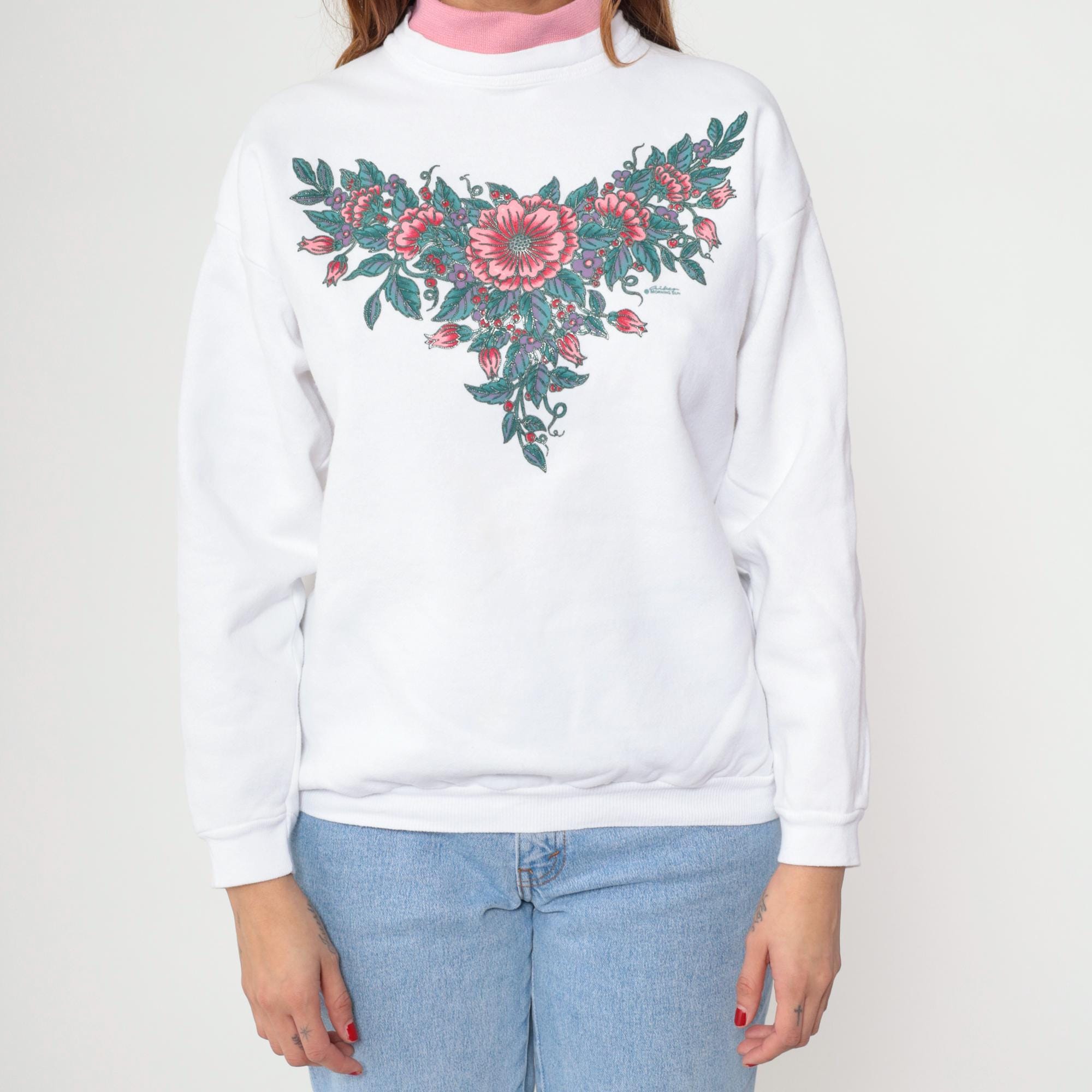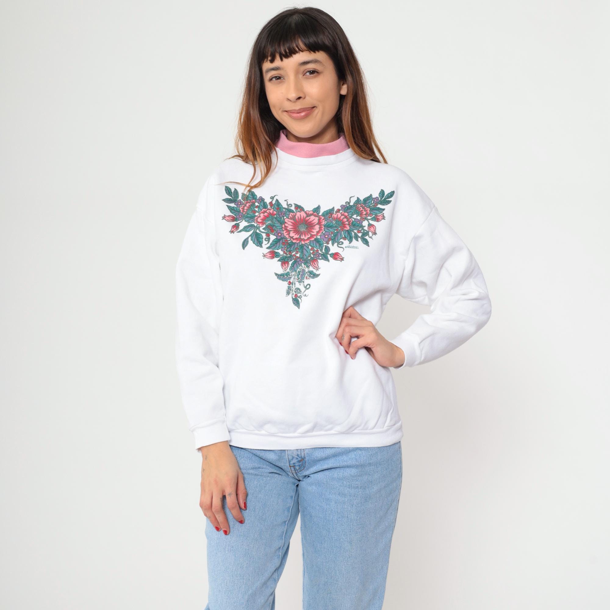 90s white sweatshirt with pink ribbed mock neck collar and floral graphic across the chest in pink, teal, green, and purple. Long sleeves with ribbed cuffs and ribbed hem.