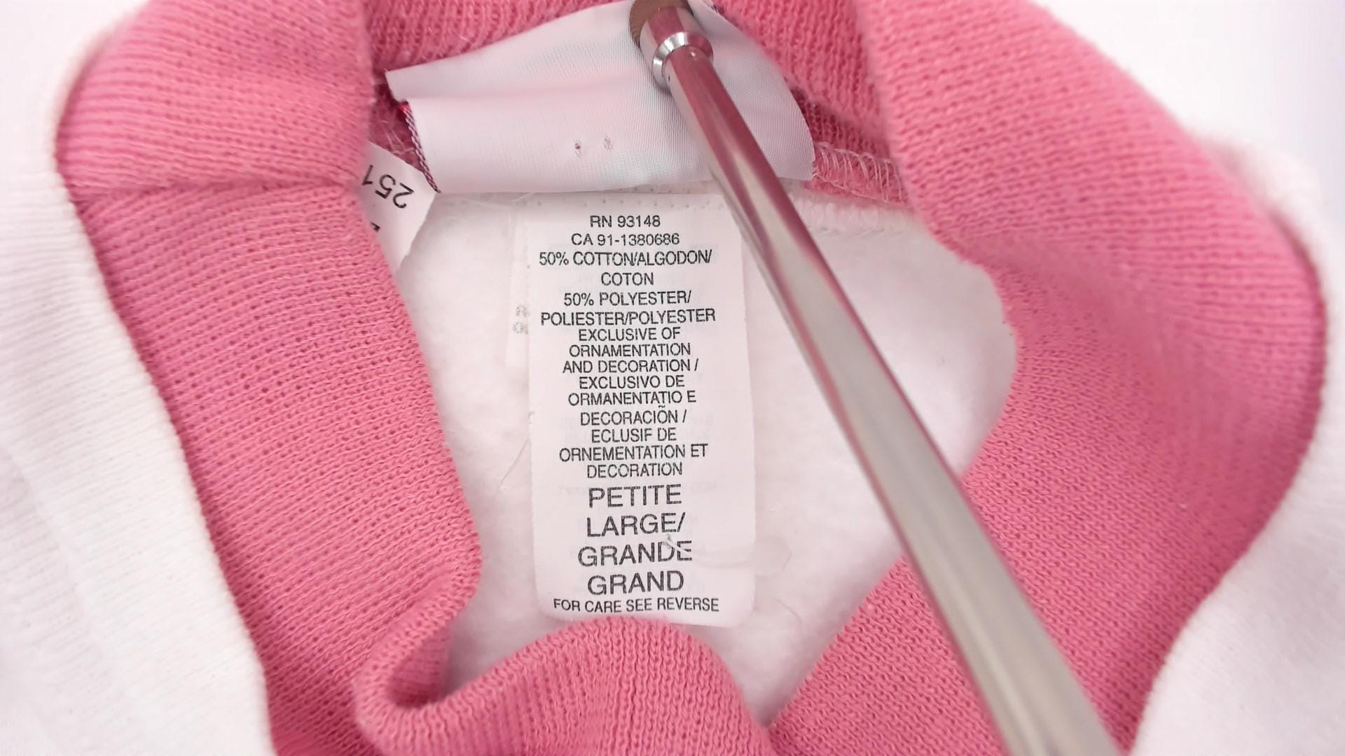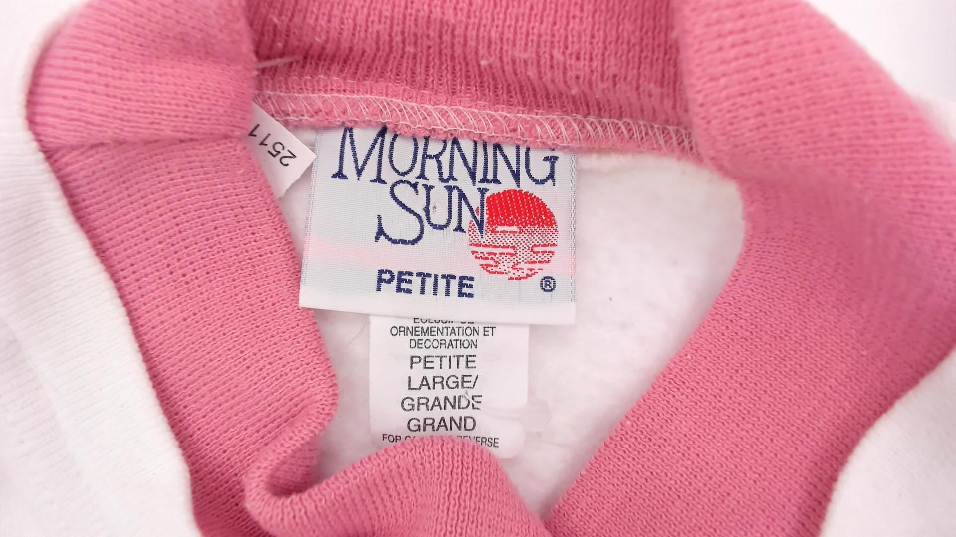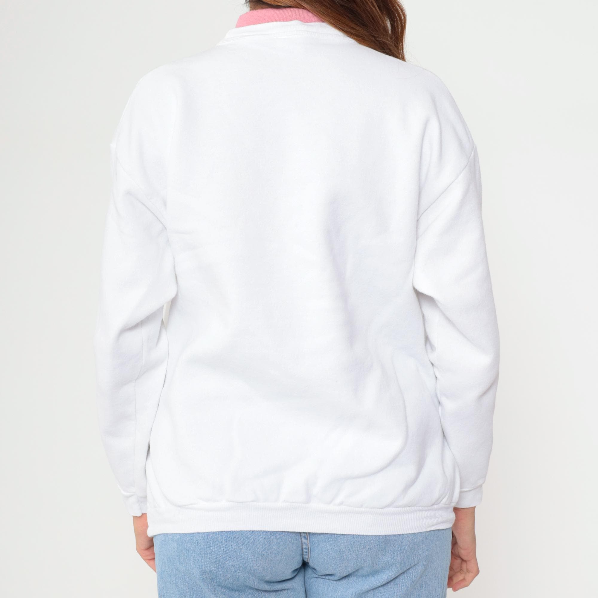 90s white sweatshirt with pink ribbed mock neck collar and floral graphic across the chest in pink, teal, green, and purple. Long sleeves with ribbed cuffs and ribbed hem.