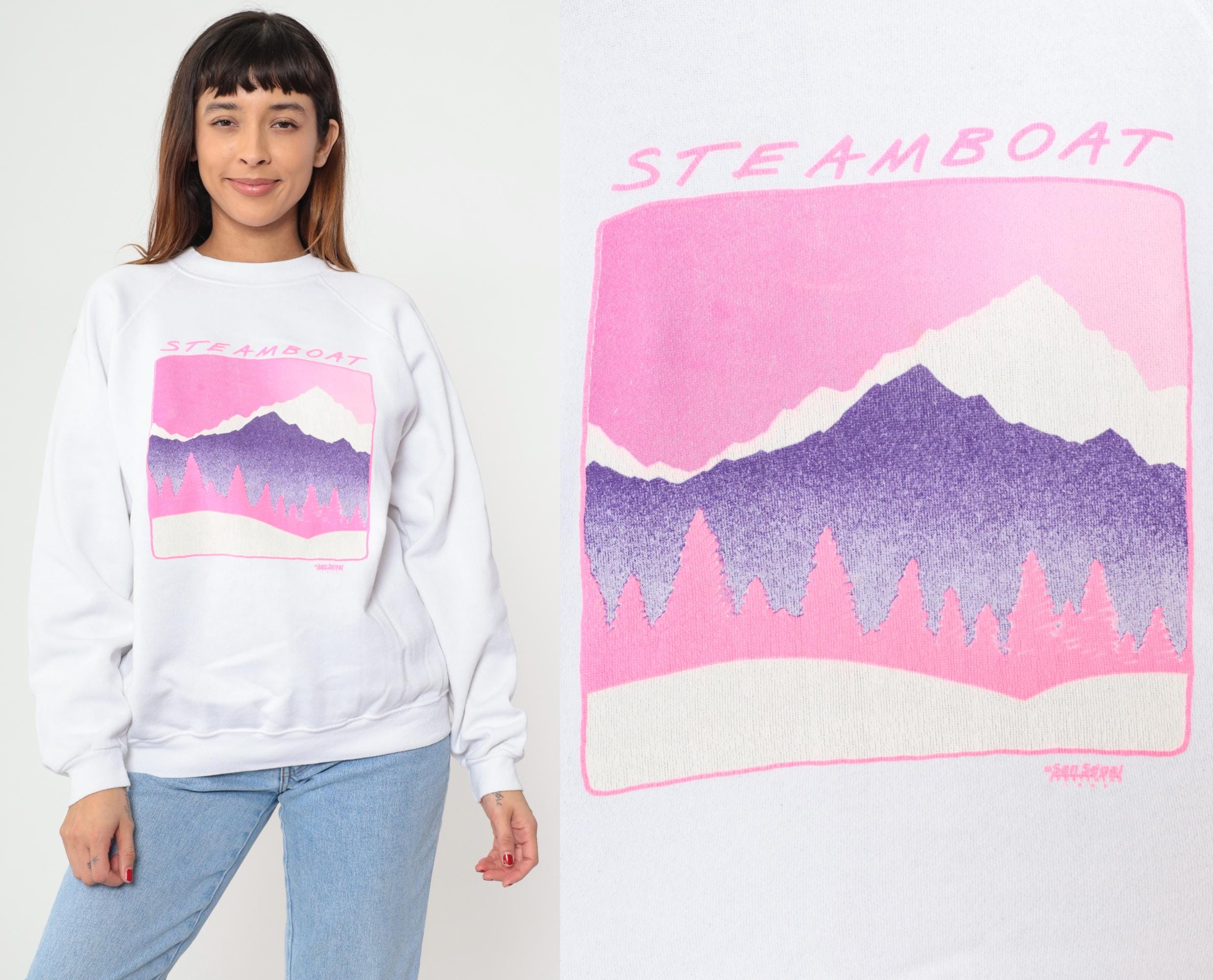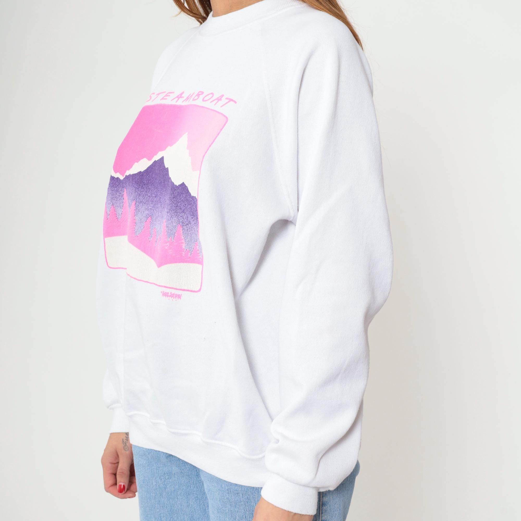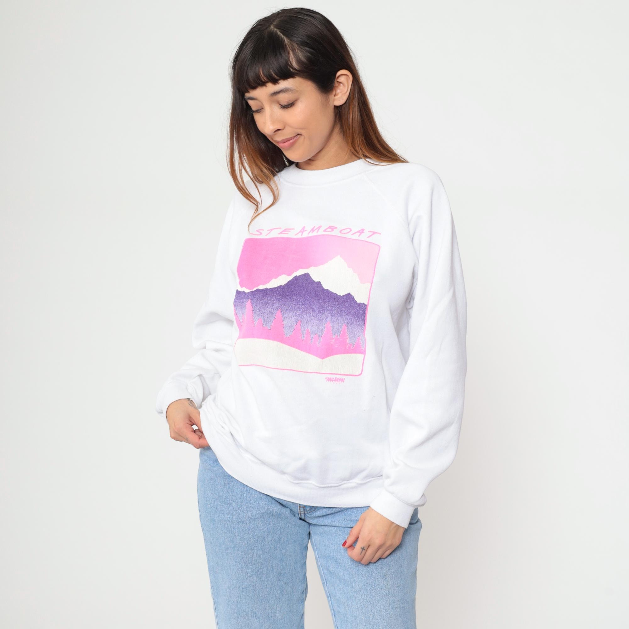 90s white sweatshirt from Hanes with Steamboat Jackson Hole mountain graphic across front in pink and purple. Snow-capped mountain peak with gradient purple coloring, pink pine tree silhouettes, pink sky, and pink border framing the scene. Crew neck, raglan long sleeves.