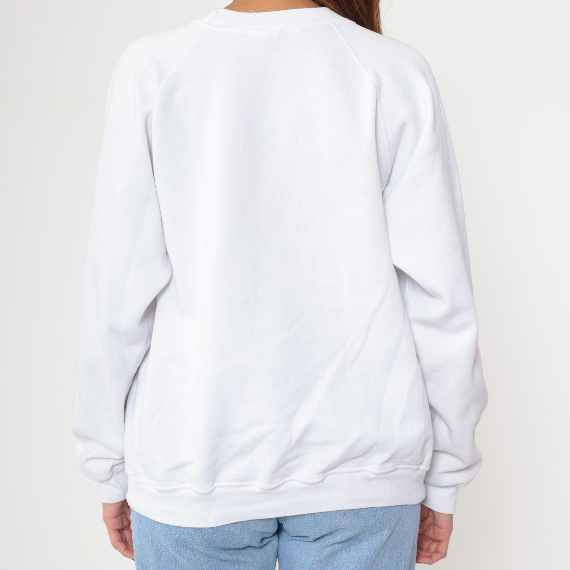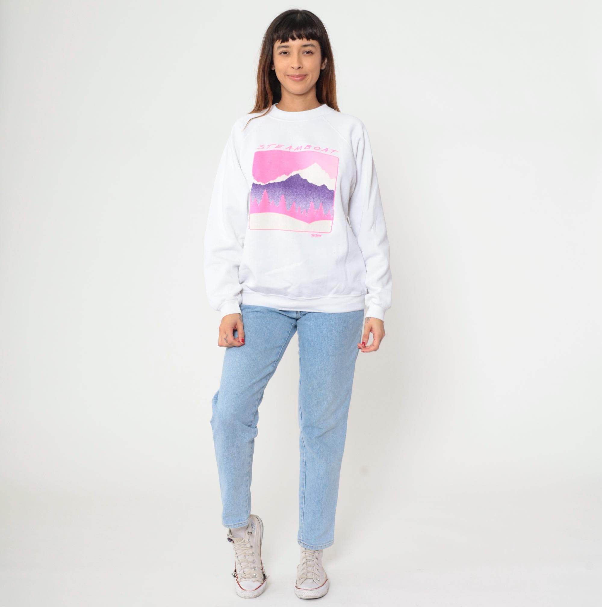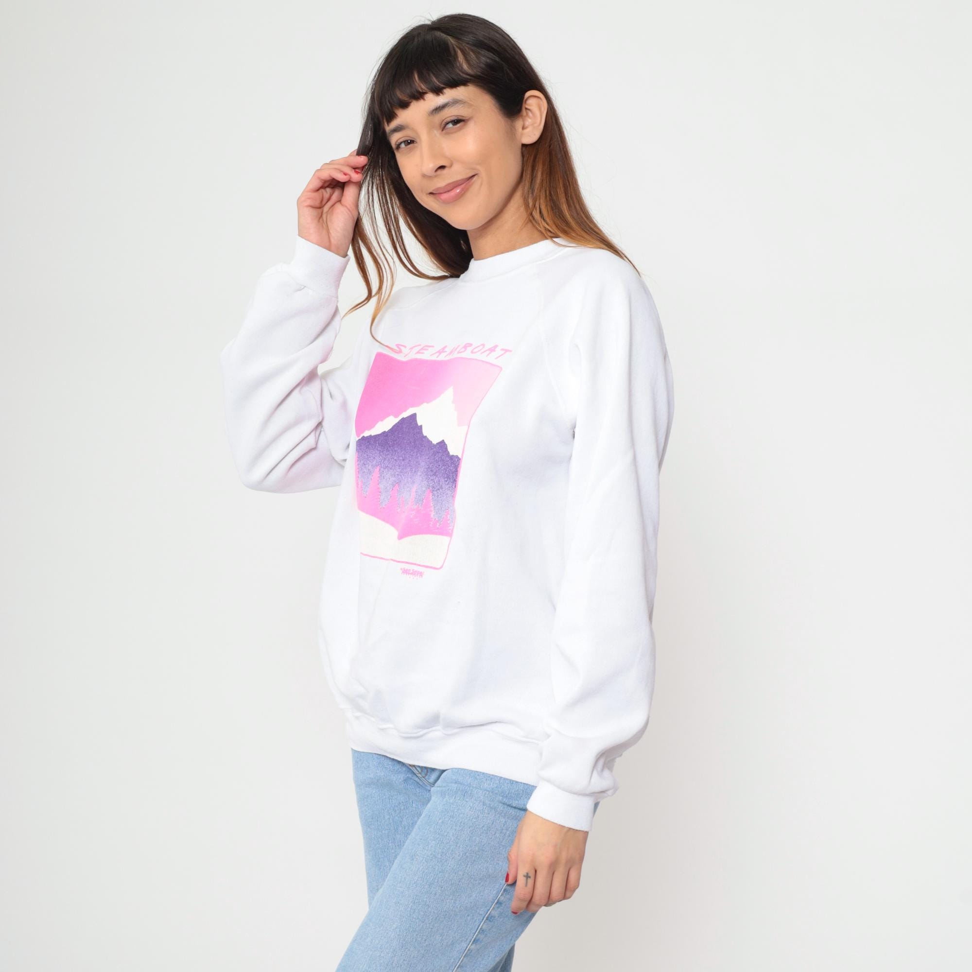 90s white sweatshirt from Hanes with Steamboat Jackson Hole mountain graphic across front in pink and purple. Snow-capped mountain peak with gradient purple coloring, pink pine tree silhouettes, pink sky, and pink border framing the scene. Crew neck, raglan long sleeves.