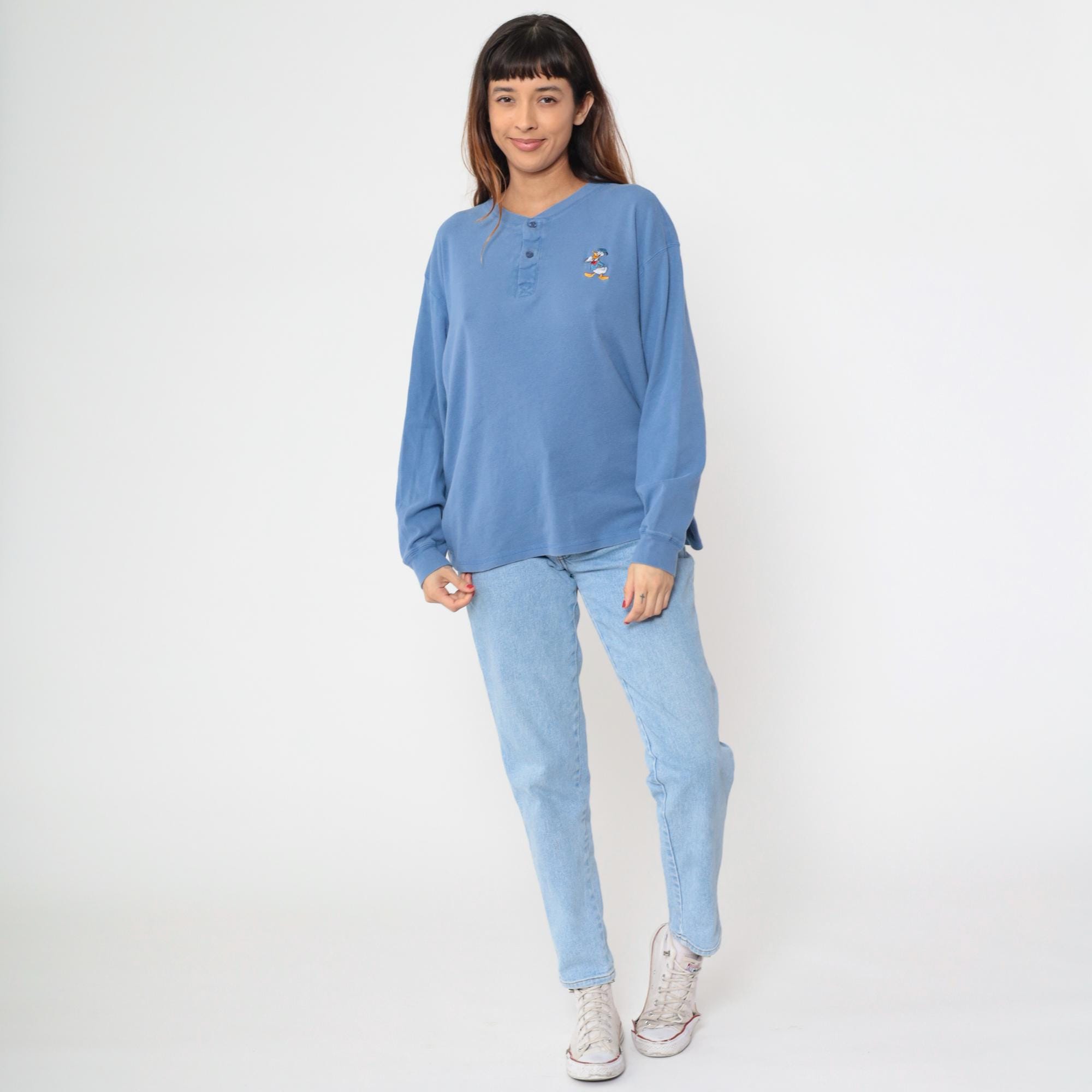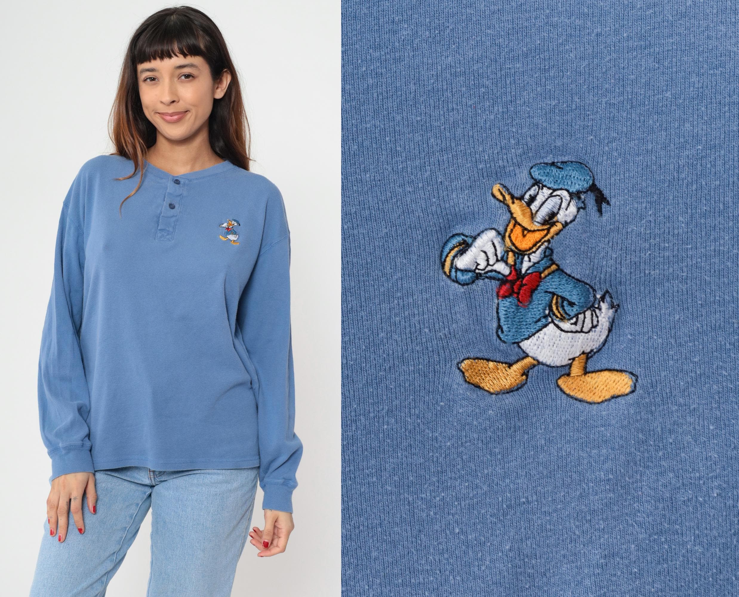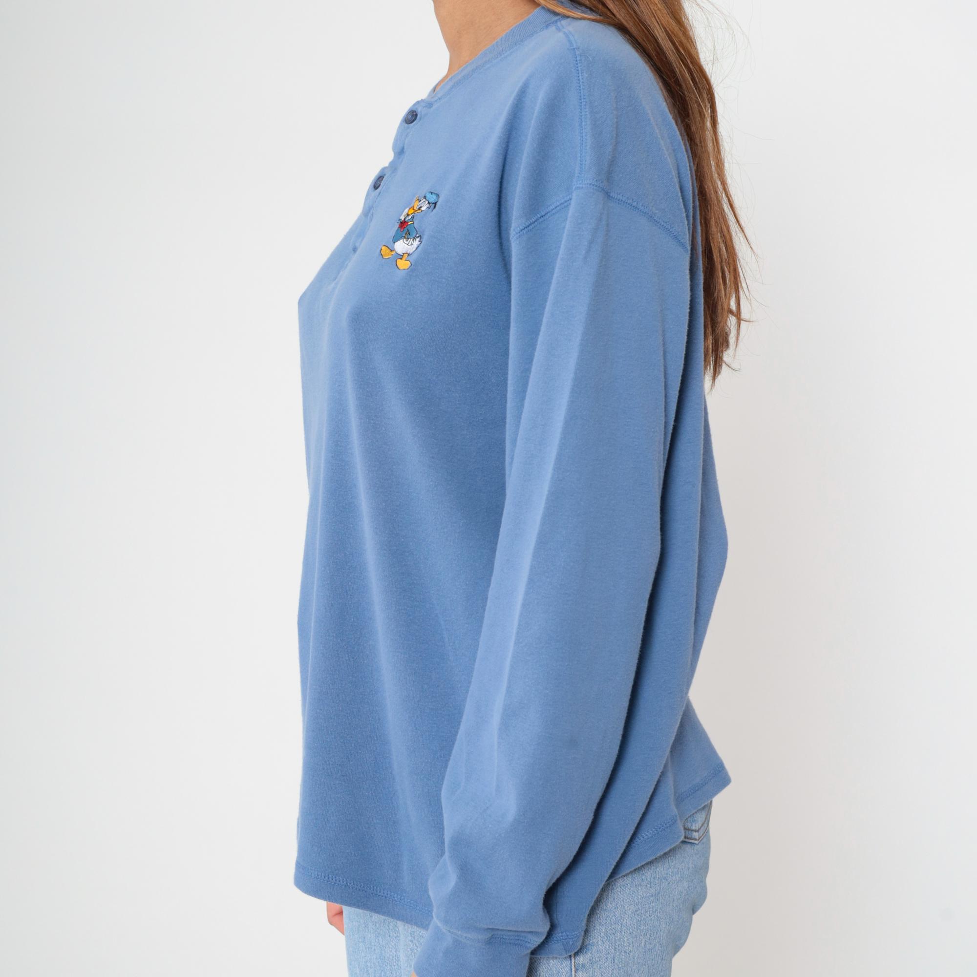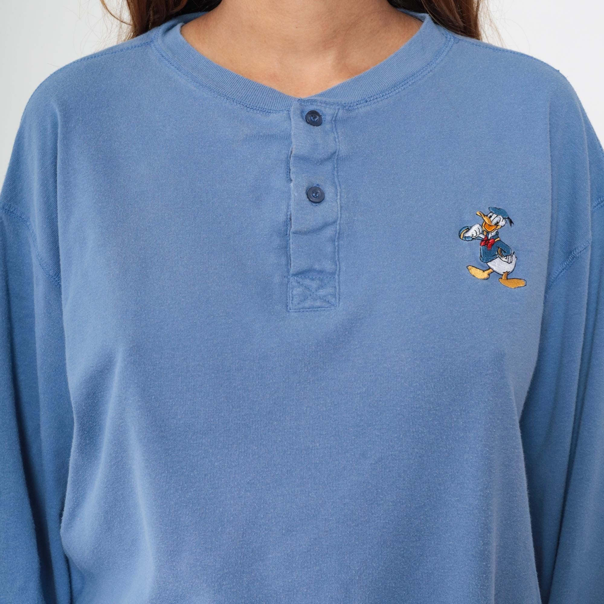 Y2K Donald Duck henley shirt in periwinkle blue with embroidered character detail on the left chest showing Donald in his classic sailor outfit. Button placket neckline, long sleeves with ribbed cuffs and ribbed collar trim.